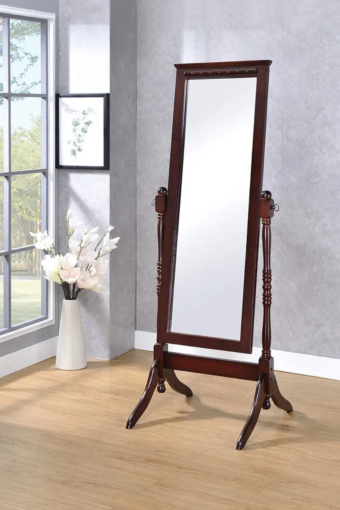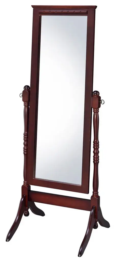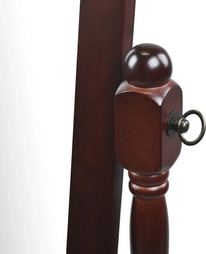 Fairfax Cheval Mirror with Rectangular Handcrafted Pattern on Top of the Rubber Wood Frame in Walnut.Fairfax Cheval Mirror with Rectangular Handcrafted Pattern on Top of the Rubber Wood Frame in Walnut. Featuring with rectangular handcrafted pattern on the top and European style of both side supporters, Fairfax Cheval Mirror presents you a piece of art and décor to the living room, dining room, bedroom, and dressing area. The mirror is allowed to be swivel-tilted to the angle you prefer.Swivel mirror can be tilted and adjustable by the ring screws at the sides.Full-length Mirror easy and convenient for getting ready for the whole day activities.Rubber wood frame is strong to hold the mirror sturdy in position.Product Dimension : 23" W x 19" D x 59" H