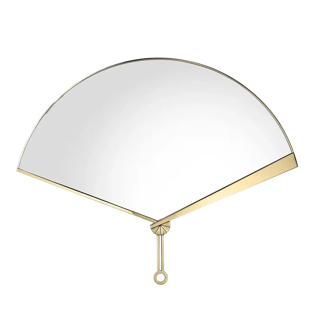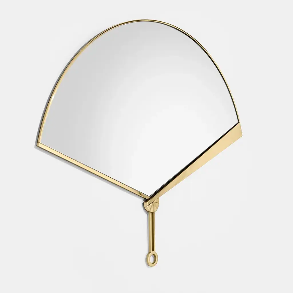 Fan is a mirror inspired by the iconic shape of the classic Japanese Fan in its semi-circular opening.An object that in the Japanese tradition is not only used to emanate air, but also to create a diaphragm between two people, to hide shyness but in this case allows you to be reflected.The structure is completely made polished brass die-casted, the central part is instead made of a generous mirrored surface that allows the user to reflect.