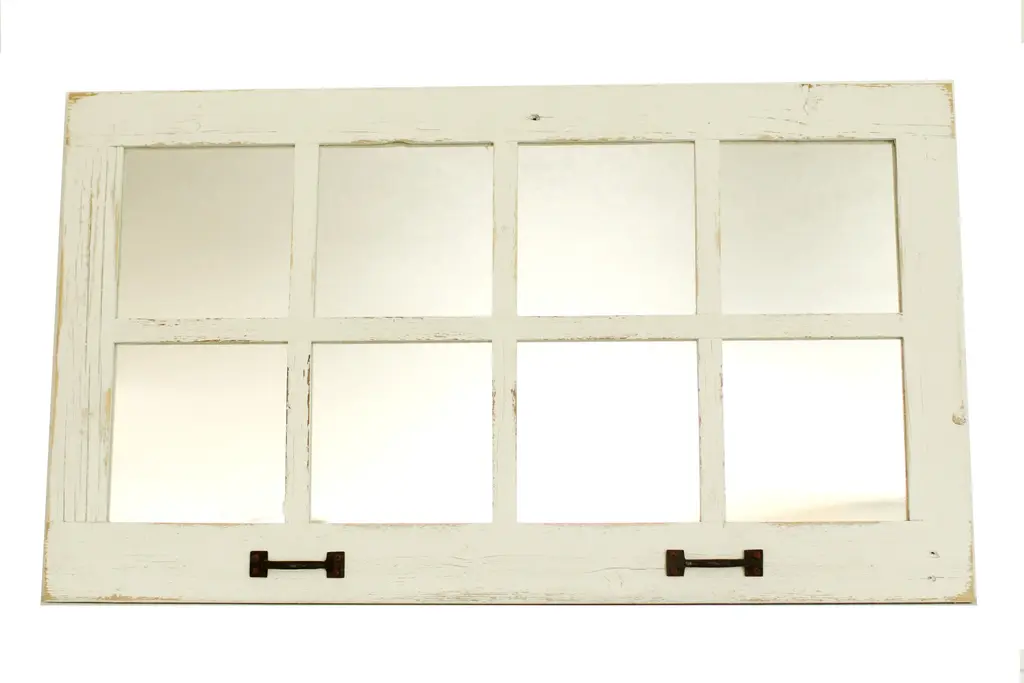 This Farmhouse style 8 window pane white mirror is a great addition to any home, cabin, or farmhouse. This antique white barnwood mirror has 8 window panes, is approximately 37.5 inches wide X 21.75 Inches tall and �_ inches deep. The rustic white mirror is made from reclaimed wood, and as such each mirror is unique and has its own charm and character. All of our reclaimed windowpane mirrors are made right here in the USA. This rustic white window pane mirror comes with one rustic pull handle at the bottom of the mirror to give it a unique look.This widow mirror comes fully assembled and is ready to be hung as soon as you get it out of the box.Specifications:Dimensions: 37.5 inches wide X 21.75 inches tall and �_ inch deepIncludes mirrors, wood frame, and picture frame wire (already attached) for easy ready to hang use.Mirrors are made to order