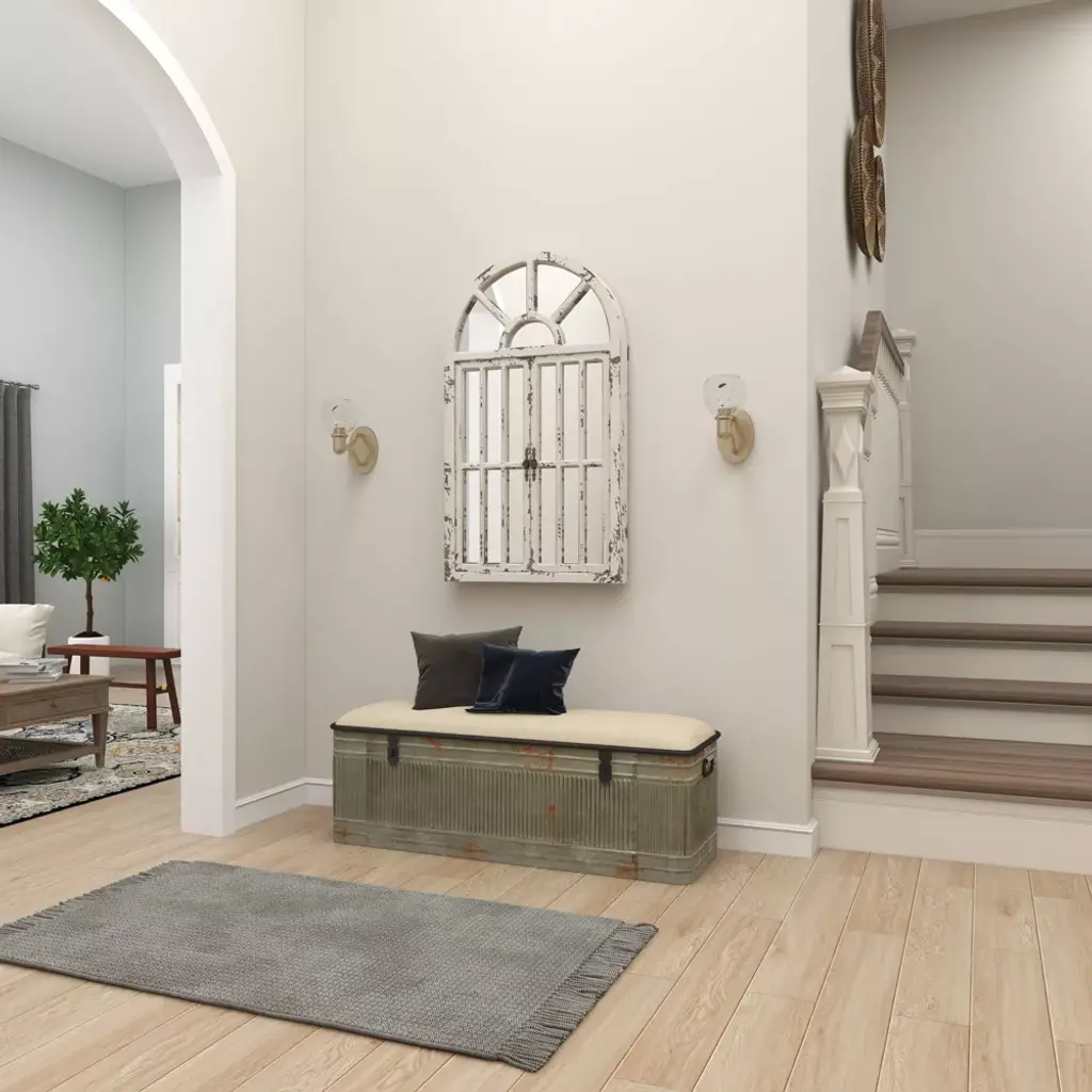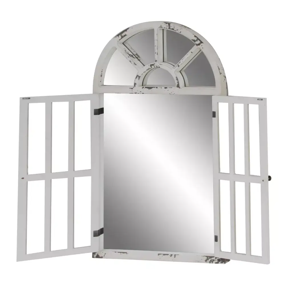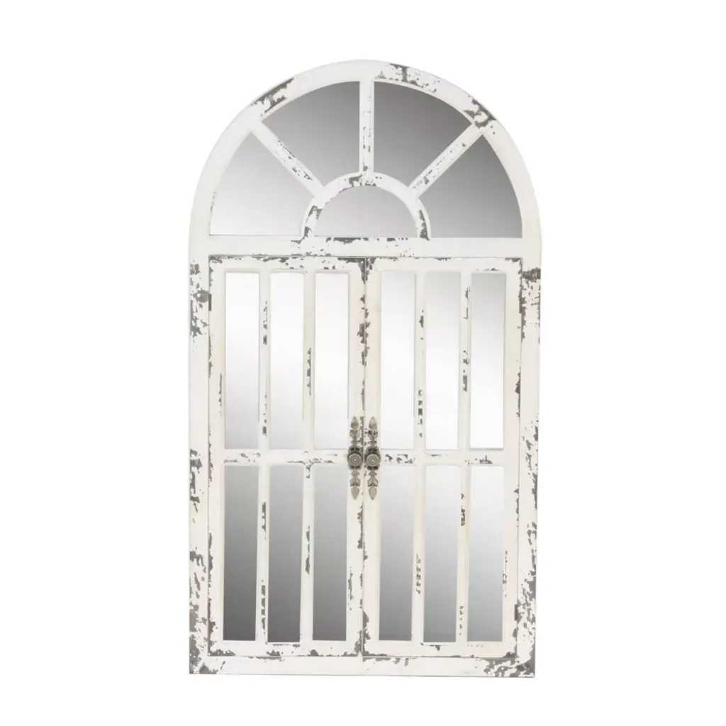 Add some style to your entryway, lobby, living room, or bedroom with this striking windowpane wall mirror. This accent piece features an arched window frame along with a distressed white finish and exposed chipping details. It is designed with rectangular panes and ornate metal handles. With its impressive look, this stunning mirror suits any home with vintage or farmhouse interior design. Apart from decorating your home, the purpose of this mirror is to bounce back outdoor light to a small room to make it look bigger. Pair this decorative wall mirror with house plants or other wall decor accent pieces to blend everything together perfectly. Ready to hang with attached D-ring hardware. Suitable for indoor use only. This item comes shipped in one carton.
