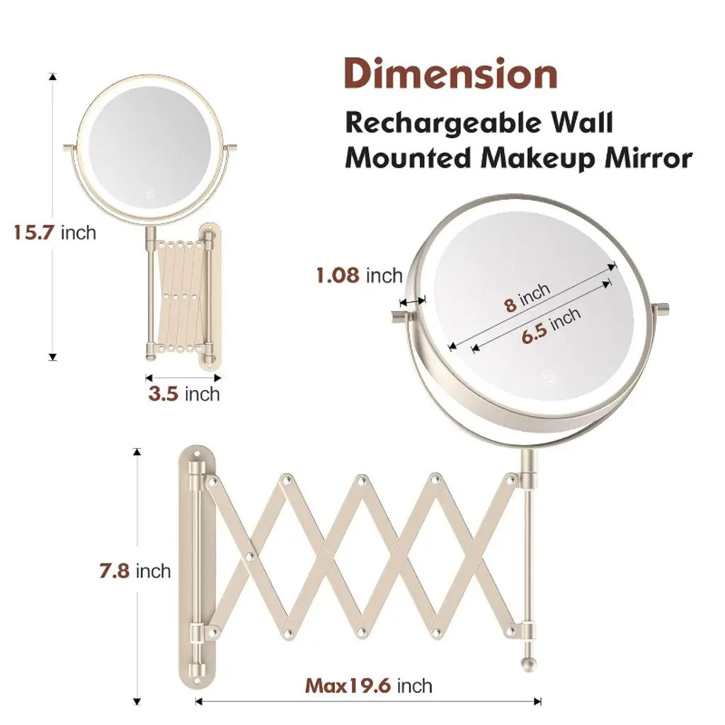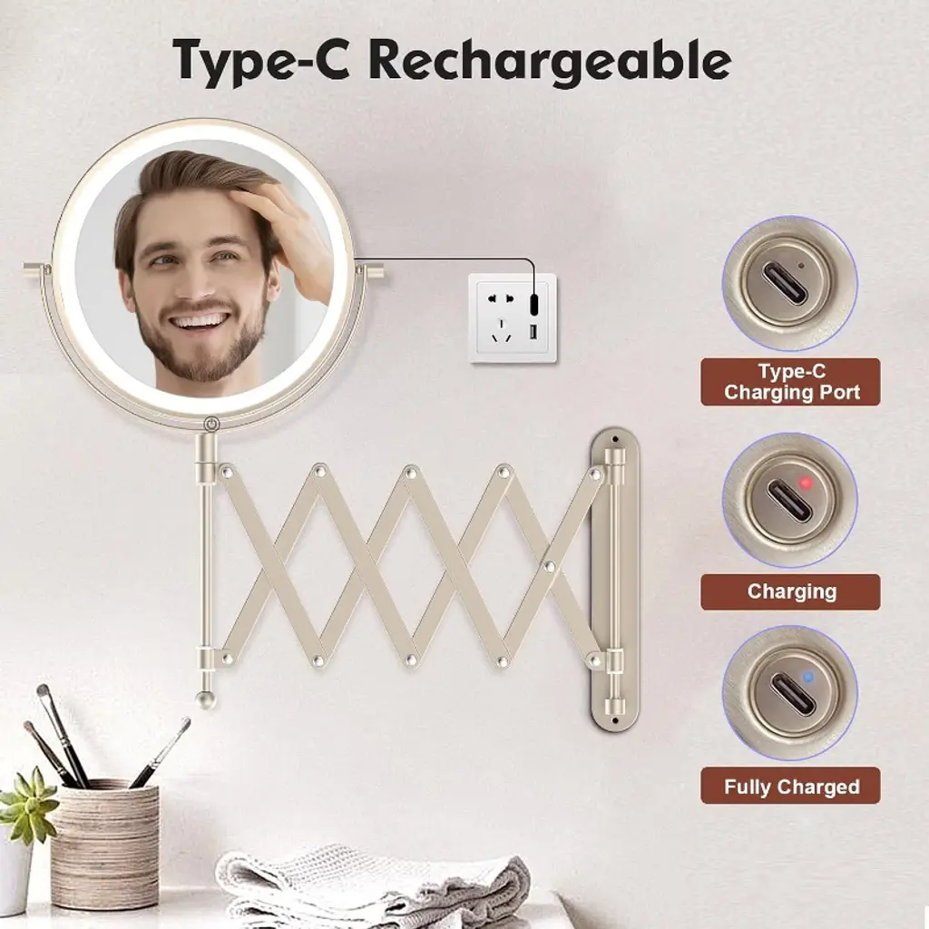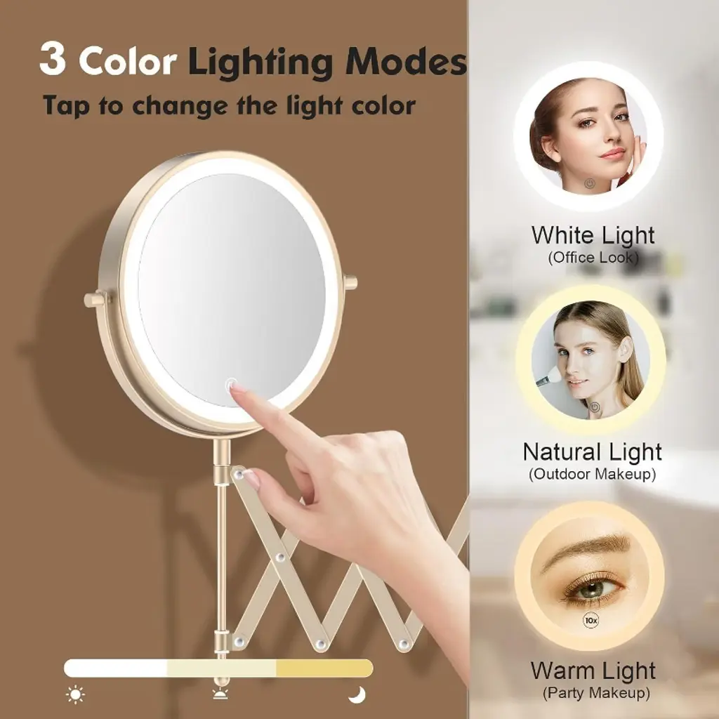 This wall-mounted makeup mirror features a built-in 1800mAh rechargeable battery for flexible use without the need for an AC outlet. It has a double-sided design with 1X and 10X magnification, perfect for both general and detailed tasks like makeup application or plucking eyebrows. The mirror offers 3-color adjustable lighting, providing clear, shadow-free reflection in any environment. With 360° rotation and an extendable arm, it offers customizable angles and reach. Made from durable stainless steel, it's easy to install and adds both style and functionality to any space. A great gift for loved ones or a practical bathroom addition.