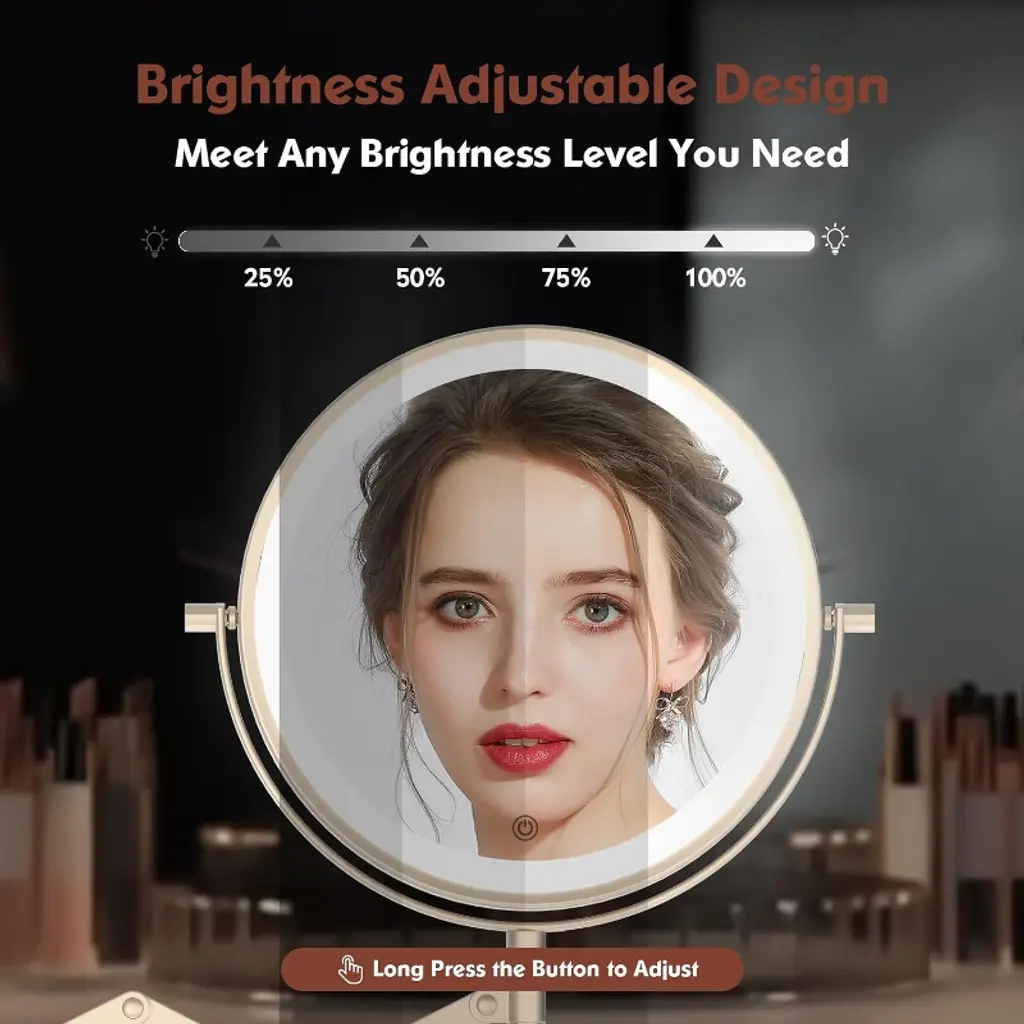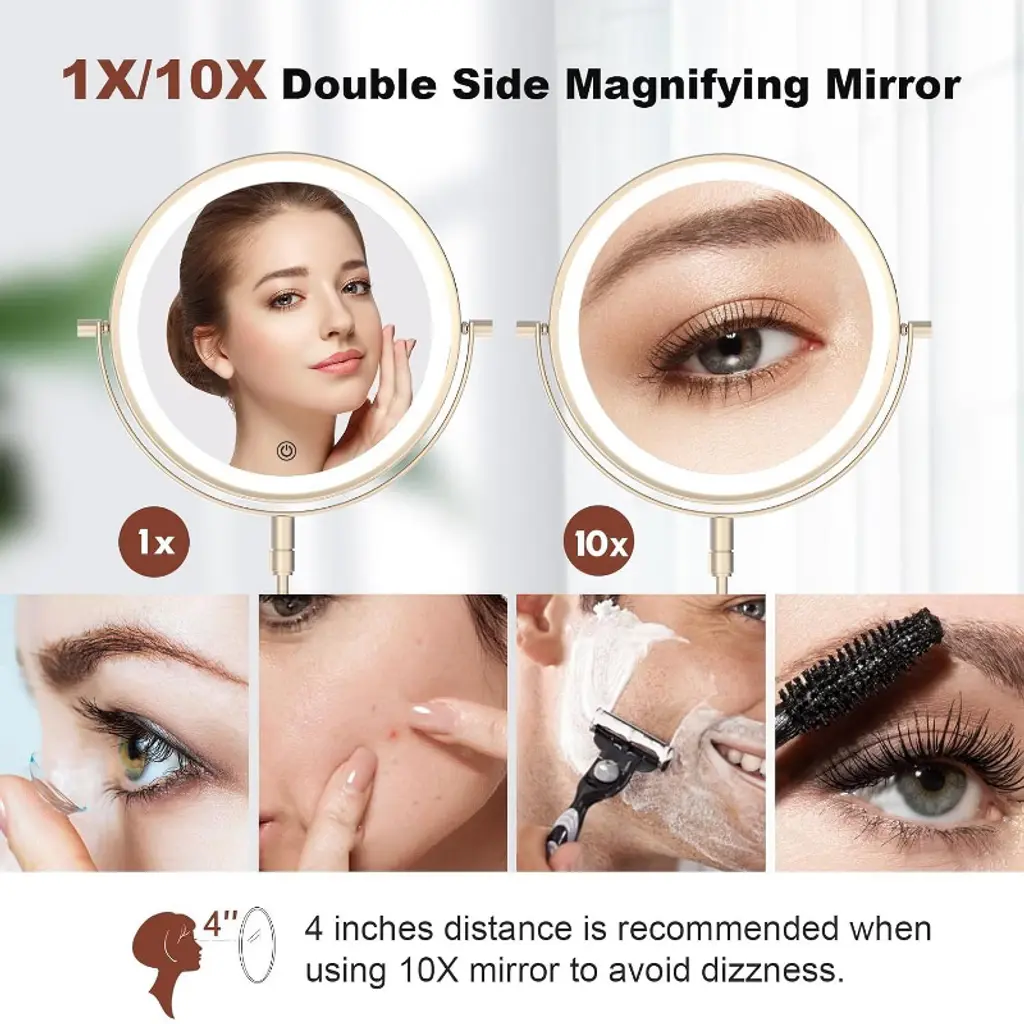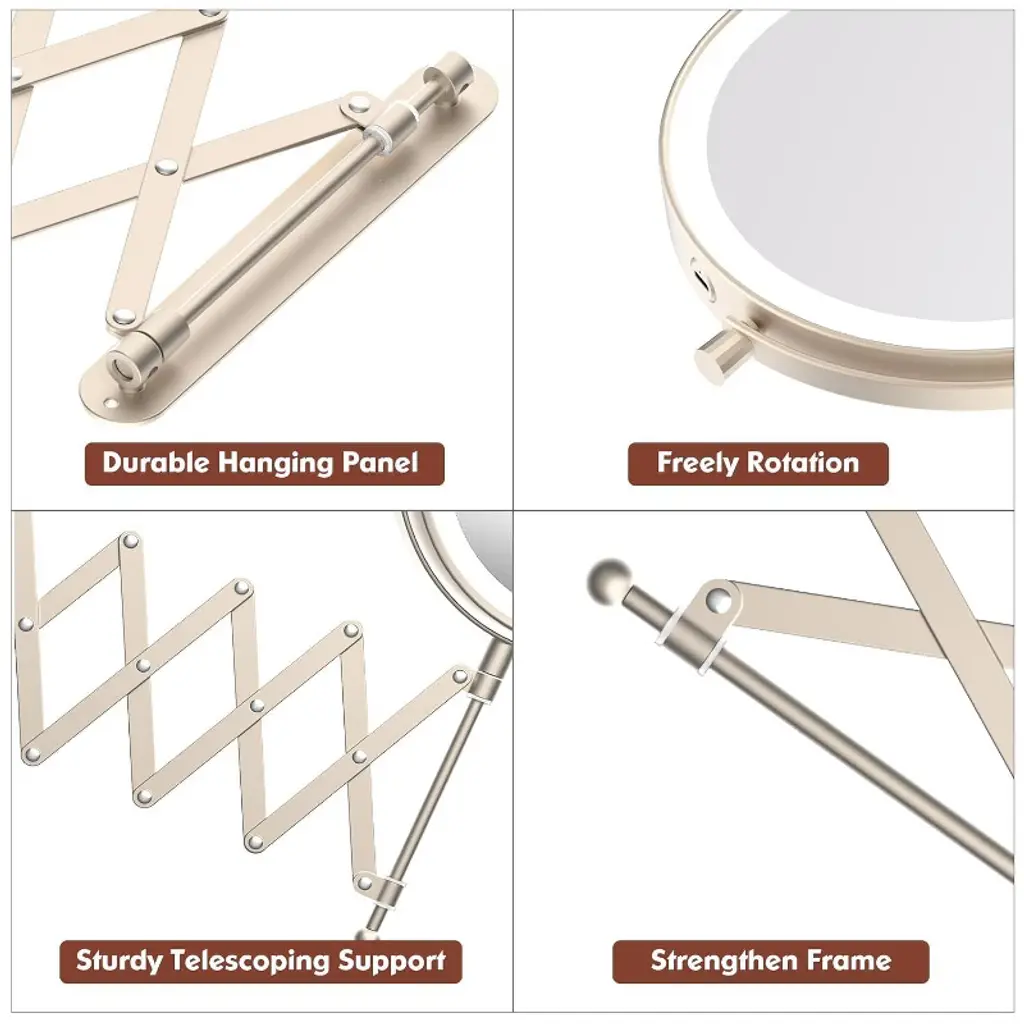 This wall-mounted makeup mirror features a built-in 1800mAh rechargeable battery for flexible use without the need for an AC outlet. It has a double-sided design with 1X and 10X magnification, perfect for both general and detailed tasks like makeup application or plucking eyebrows. The mirror offers 3-color adjustable lighting, providing clear, shadow-free reflection in any environment. With 360° rotation and an extendable arm, it offers customizable angles and reach. Made from durable stainless steel, it's easy to install and adds both style and functionality to any space. A great gift for loved ones or a practical bathroom addition.