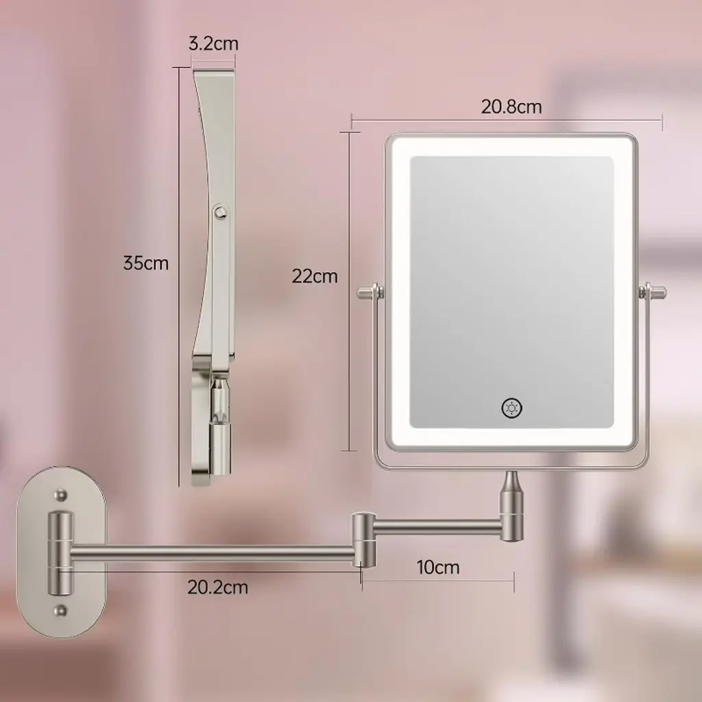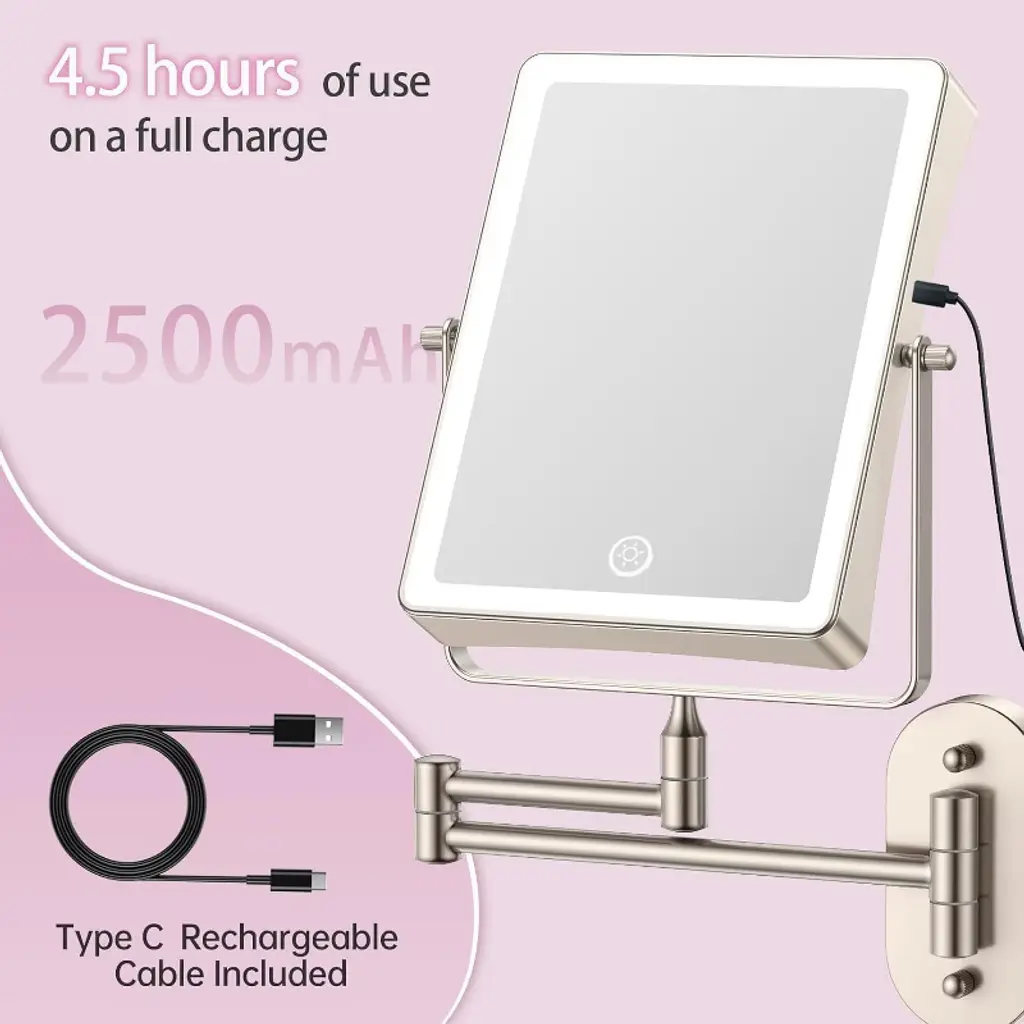 This upgraded wall-mounted makeup mirror offers a modern rectangular design for a full-face view, making makeup application easier and more precise. With 1X and 10X magnification, it's perfect for everything from full-face routines to detailed tasks like eyeliner and brows. The built-in 2500mAh rechargeable battery powers the mirror via a Type-C cable (included), so no frequent battery changes are needed. Choose from three dimmable lighting modes—white, natural, and warm—and adjust brightness for your setting. The 360° rotation and foldable arm provide flexible positioning and easy storage. A sleek, functional gift for any beauty lover.
