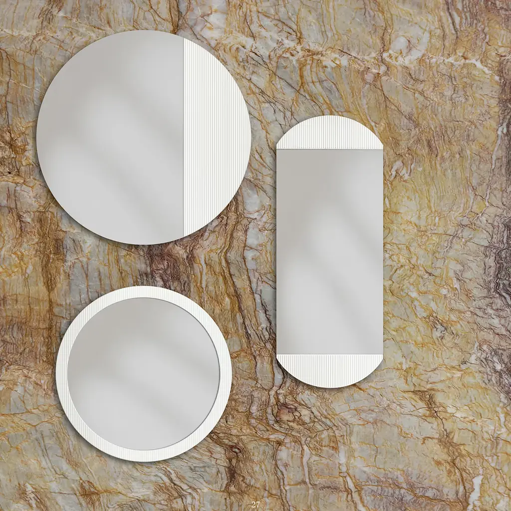 This round mirror captures contemporary sophistication with its clean, elegant design. A subtle canneté texture frames one half of the mirror, adding depth and refined charm to the reflective surface. The smooth white finish blends seamlessly into any space, while the distinct texture offers a luxurious contrast. Perfect for modern interiors, this mirror becomes a striking focal point, elevating the room with both style and subtle luxury.