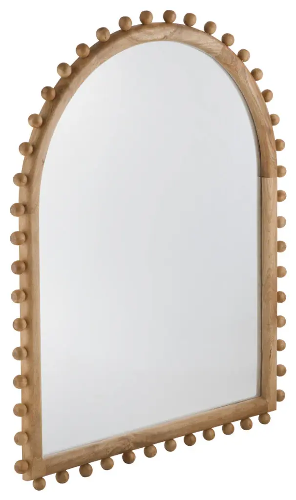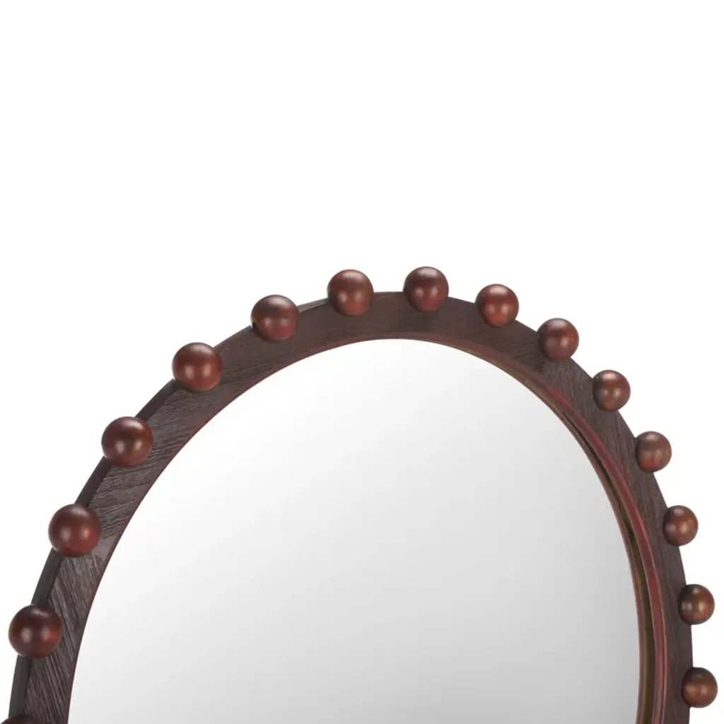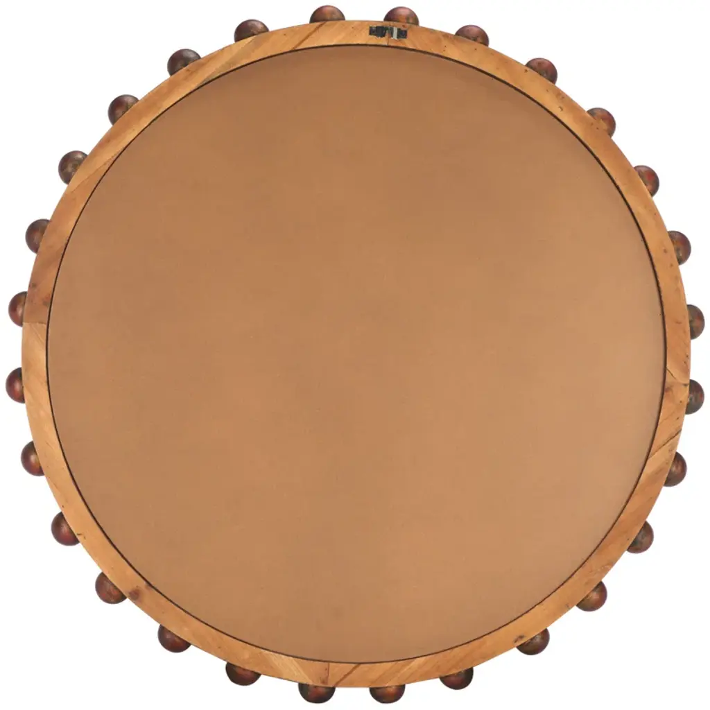 Introducing the Lando Mirror, a harmonious fusion of natural elegance and functional design, now available in the warm, inviting shade of walnut. Crafted from wood with meticulous care, this mirror exemplifies a dedication to durable craftsmanship and aesthetic appeal. Featuring a distinctive circular shape, the mirror is framed by pinewood with a rich walnut finish, giving it a classic, yet contemporary look that complements a wide range of interior decor styles. The subtle decorative elements, consisting of spherical wooden accents evenly spaced around the circumference, add a unique textural contrast and visual interest. Whether placed in your entryway, living room, or bedroom, the Lando mirror serves both as a practical reflective surface and an alluring decorative piece. Its versatile design ensures it can integrate seamlessly into your home, enhancing the ambiance with its natural charm while reflecting light to create a more open and airy atmosphere.