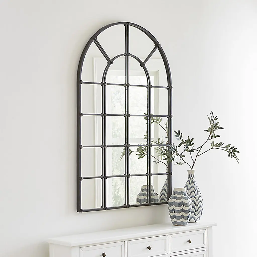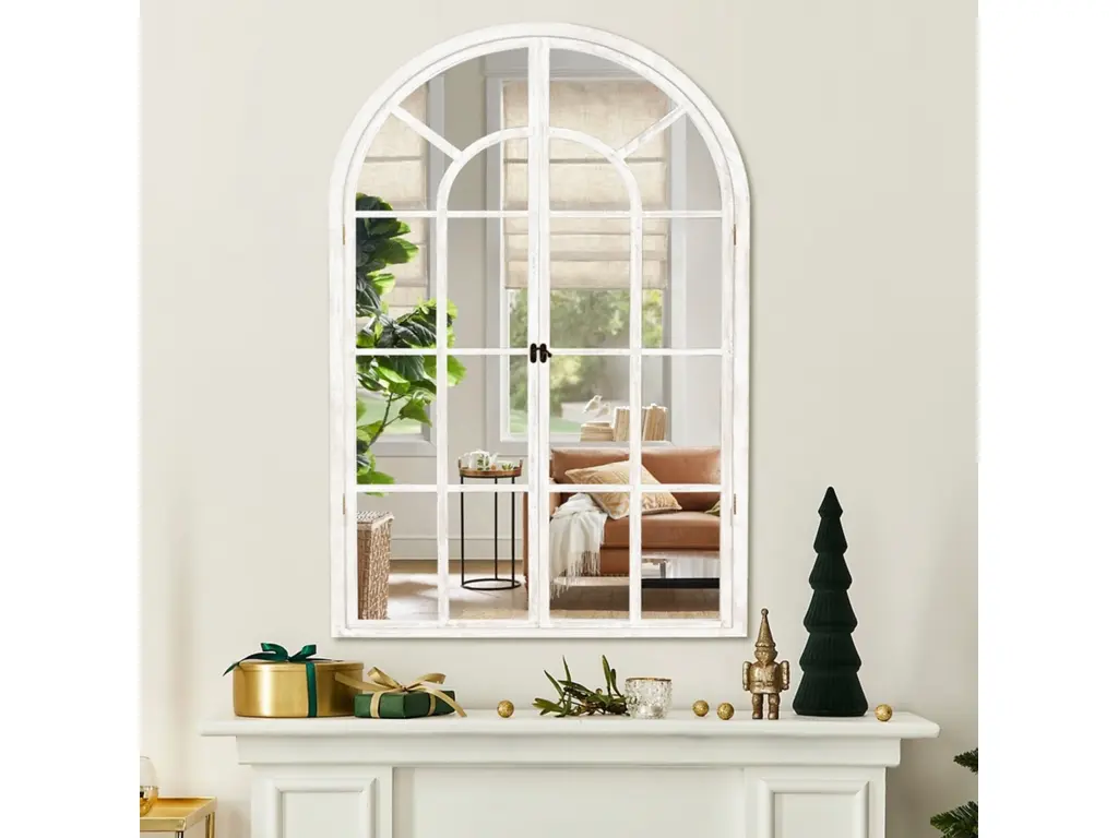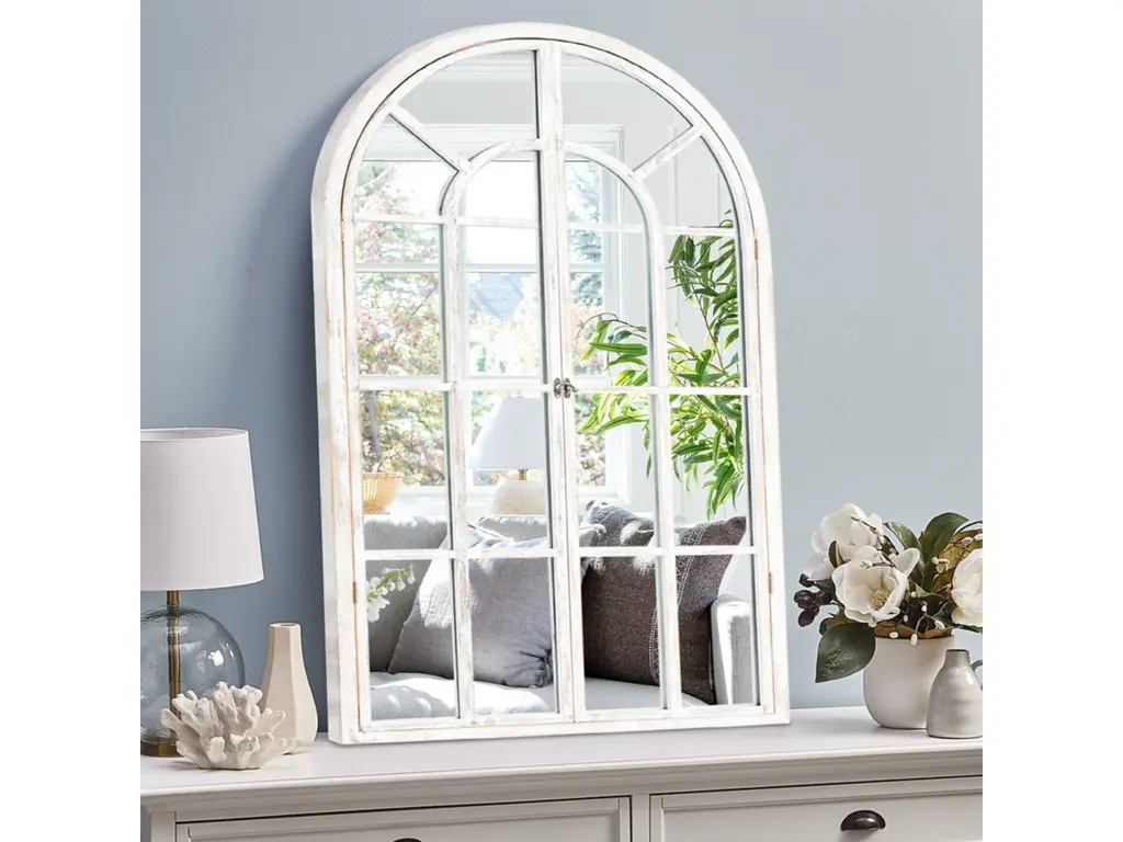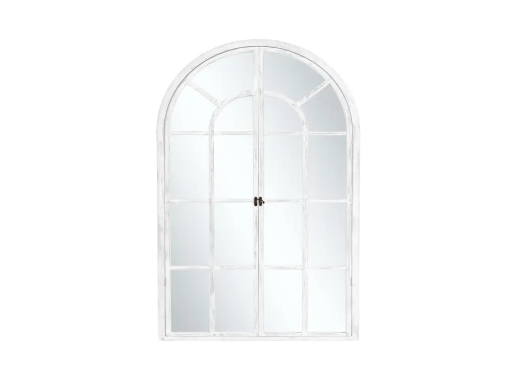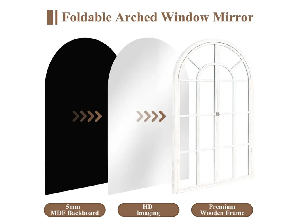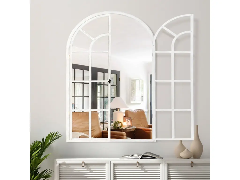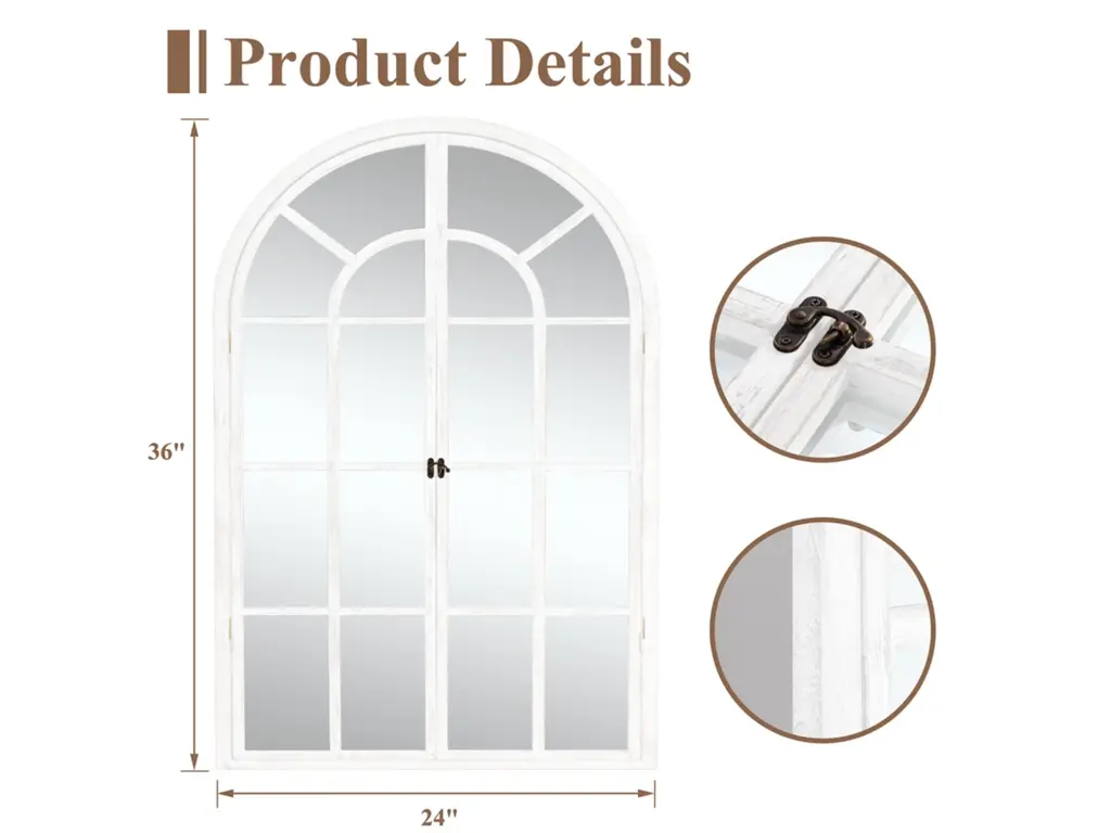 The Arch-Top Wall Mirror is a stunning blend of rustic charm and functionality, perfect for any room in your home. This mirror features a unique window-inspired design with an added touch of elegance, and the window lock allows you to control its openness. Crafted with a solid wood frame, this mirror is built to last, ensuring years of service. Its arch-top silhouette adds a touch of antique allure, making it an ideal decorative piece.