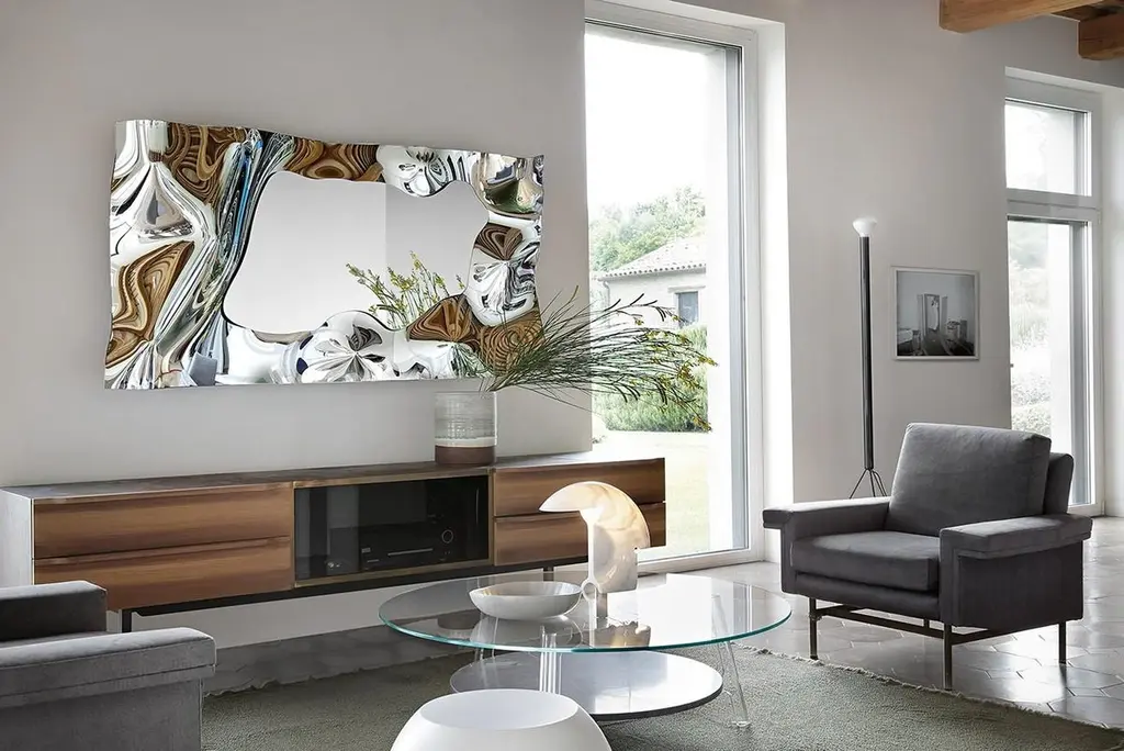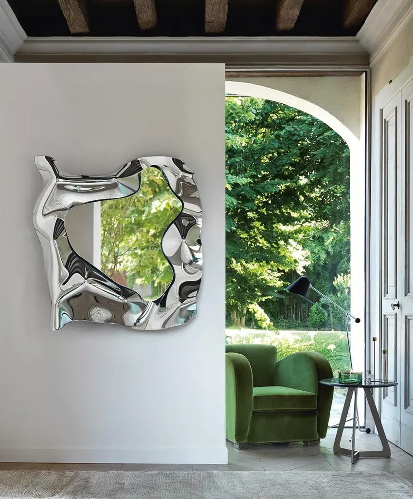 Wall mirror in 6 mm high temperature melted glass, back-silvered. 5 mm flat mirror. Rear frame in painted metal. It can be hung in various positions. “The mirror”: it has always been a way for human beings to verify their existence by seeing themselves reflected there. In this it is very similar to water, the only natural reflecting element, thanks to the power of light.This gave rise to “the idea”: who would be better throughout the entire world at shaping reflective material? In our opinion, Master XHIXHA uses the instrument of light like no other to create musical and thus architectural partitions, deforming material especially stainless steel.Descending from Olympus, how can the creator/artist then bring it to man? Through design. With what material? Glass. Shaped by whom? By the only ones capable of making it while using their hearts. The in-depth artistic culture nurtured over the years through relationships with the greatest modern artists, makes FIAM and its founder Vittorio Livi a catalyst for genius and recklessness, the irrational and fantastic mind.Still a mirror then? No, instead it’s shaped material that reflects light and everything that surrounds it to distort it, embody fantasies, and unprecedented and surprising perspectives. Christine: pure love, but at the same time torment and desperation, represented in the poetic and “uncontrolled gesture” by XHIXHA.The mirror becomes a true reflection of everything that surrounds it, but it describes it to us using an unexpected poetry, through FIAM art, design and “magic”.Dante O. Benini