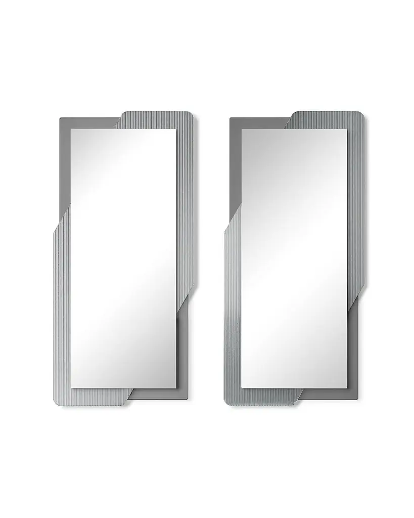 Free-standing or hangingmirror with frame composedof two glass elements:a part in 6 mm-thickhigh-temperature fusedglass in transparentor bronze finish; a partin 6 mm-thick flat glassin smoked or bronze finish.5 mm-thick flat mirror.Rear frame, in paintedmetal. It can be hunghorizontally or vertically.
