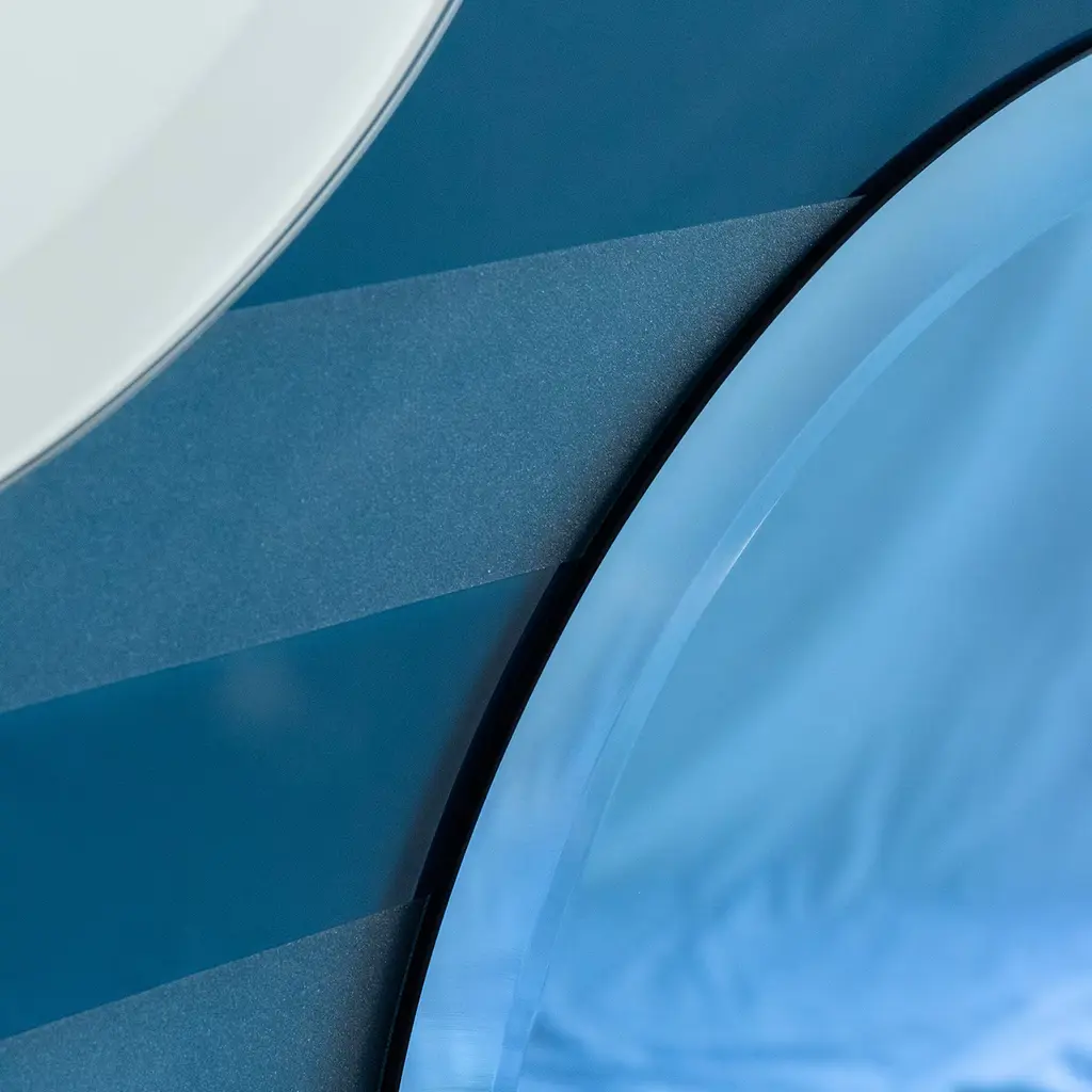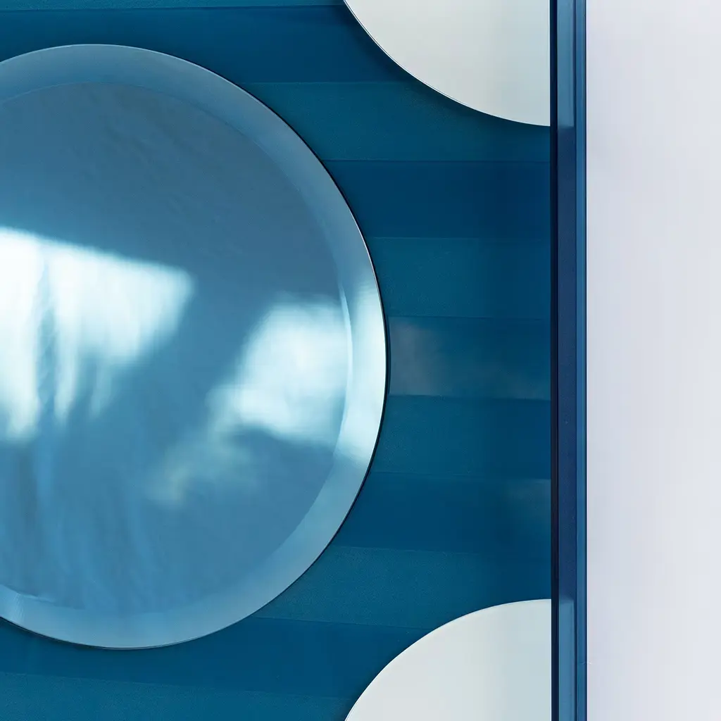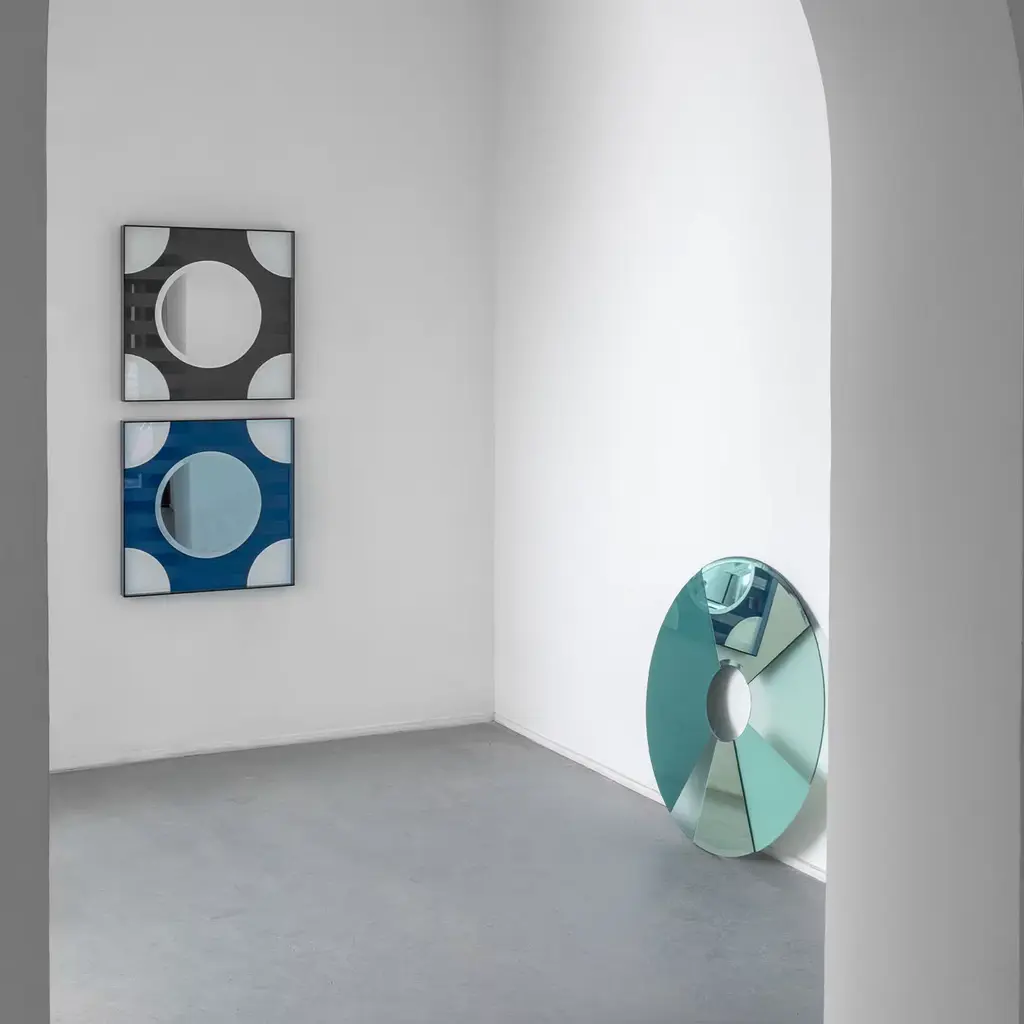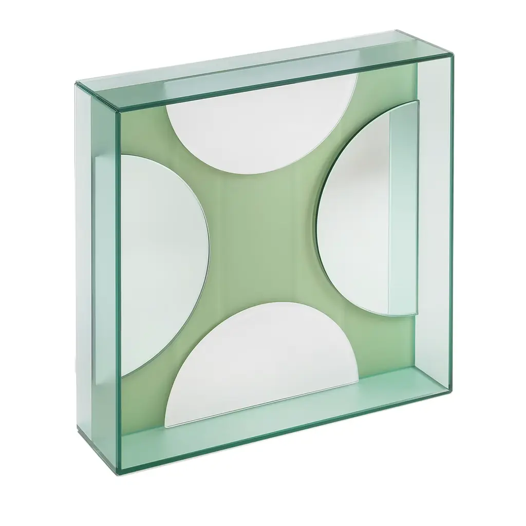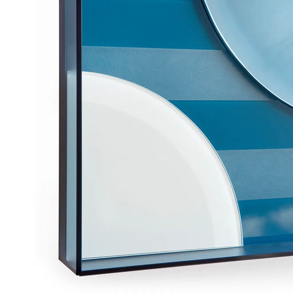 This wall mirror juxtaposes matte, glossy and coloured reflective glass in an artful arrangement to create an unconventional, striking accessory that is as much a work of art as a mirror.