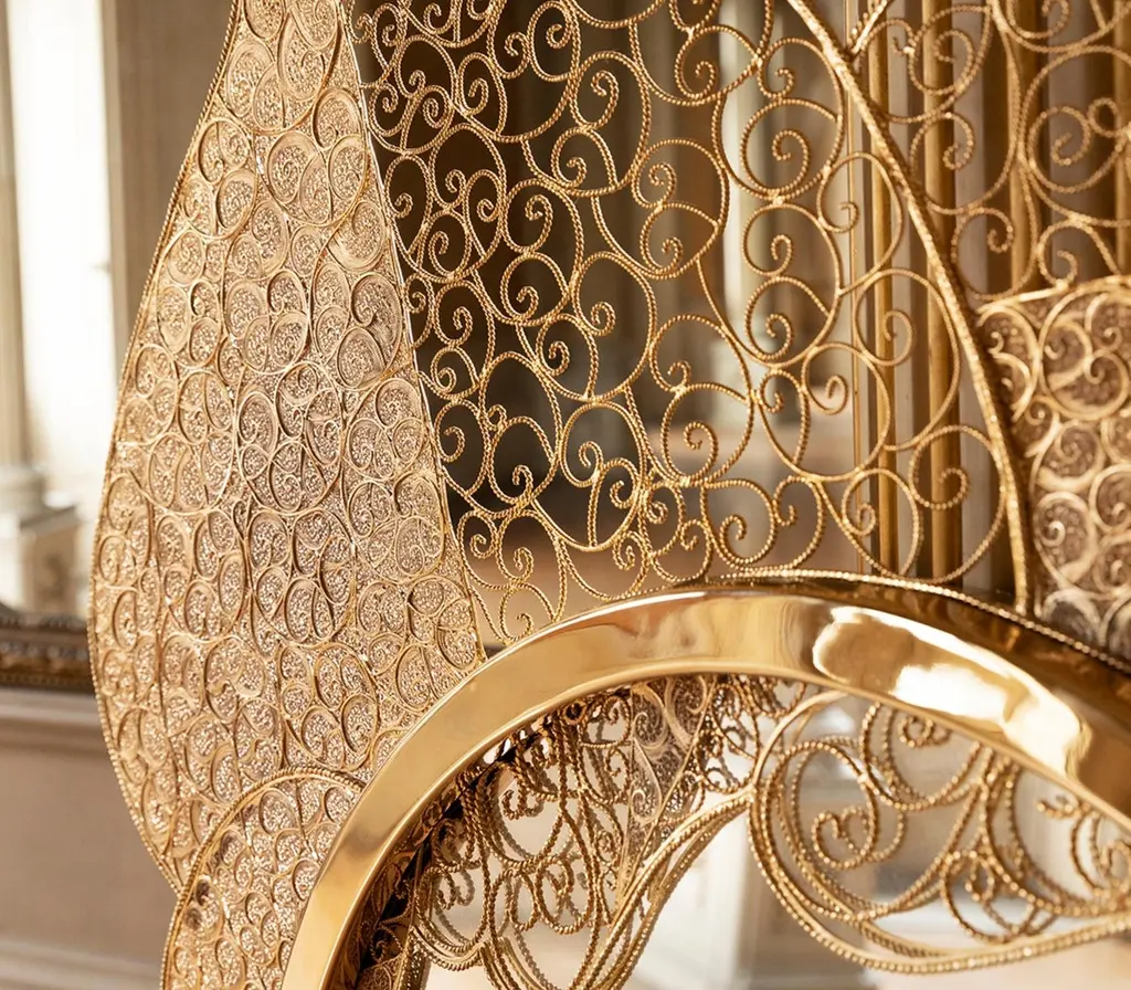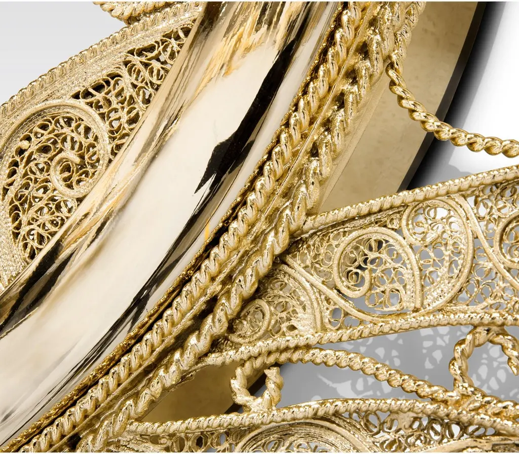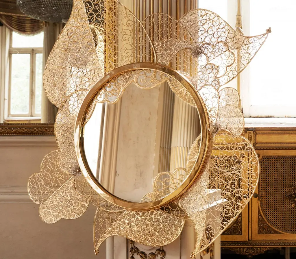 The Filigree Mirror resorts to one of the oldest jewellery making techniques known. Completely handcrafted, with each brass cord fitted with precision, the Filigree Mirror flourishes in a shape traditional to Portuguese culture and art. A true work of art, this luxurious mirror plays tribute to Boca do Lobo's core values heritage and craftsmanship. The Filigree mirror's structure is made from brass cords, gilded in 18k gold. It features a brass sheet that is hand-hammered to achieve its concave shape. A jewelry technique used to solder tiny beads and twisted threads. Filigree is the most delicate technique used to work precious metals, usually of gold and silver. It is an age-old and detailed jewelry expression in which skilled artisans painstakingly solder tiny beads and twisted threads to create striking artistic motifs, suggesting often exquisite and intricate lace-like patterns.