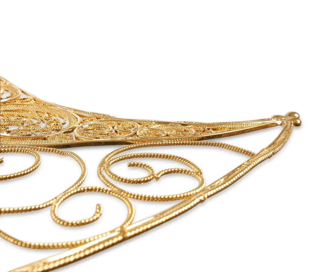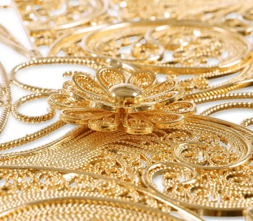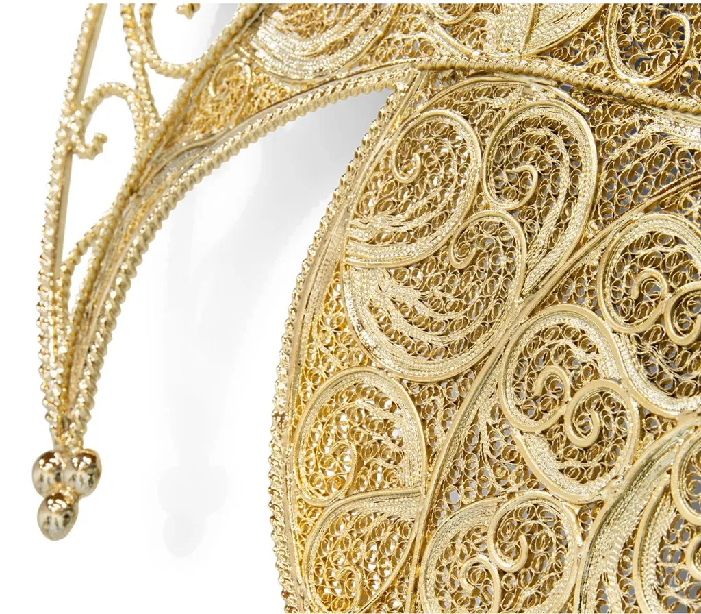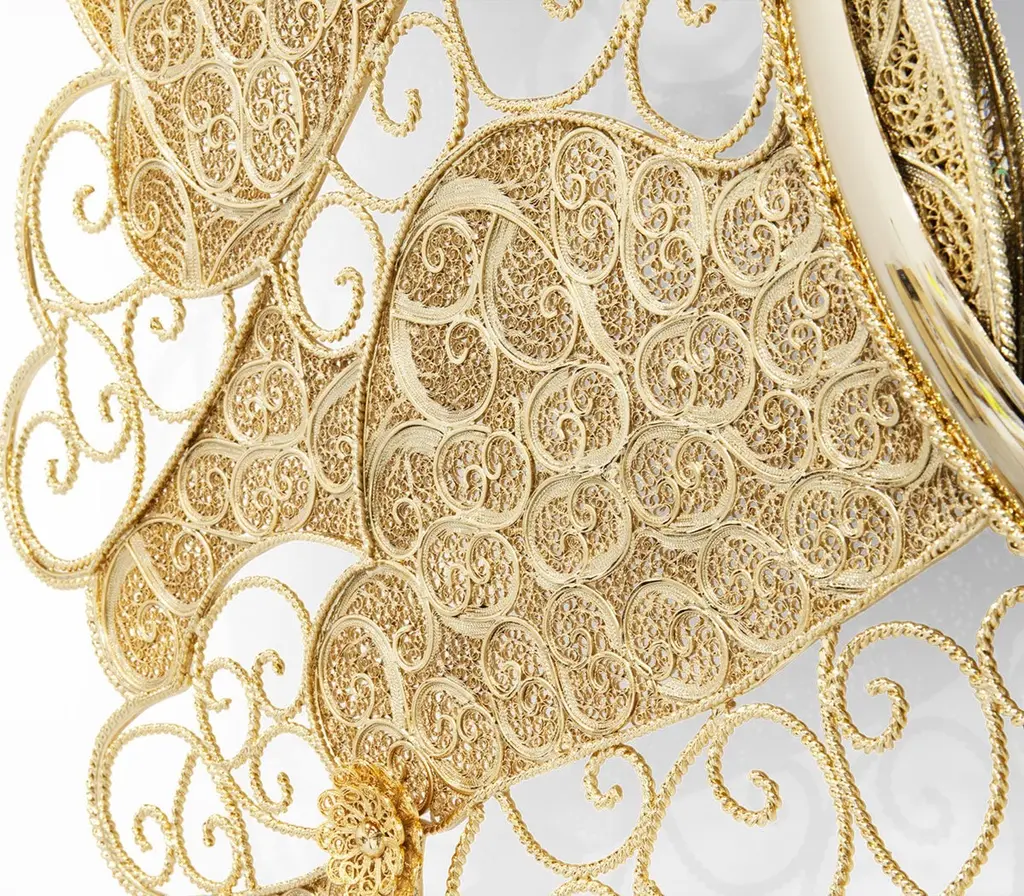 The Filigree Mirror resorts to one of the oldest jewellery making techniques known. Completely handcrafted, with each brass cord fitted with precision, the Filigree Mirror flourishes in a shape traditional to Portuguese culture and art. A true work of art, this luxurious mirror plays tribute to Boca do Lobo's core values heritage and craftsmanship. The Filigree mirror's structure is made from brass cords, gilded in 18k gold. It features a brass sheet that is hand-hammered to achieve its concave shape. A jewelry technique used to solder tiny beads and twisted threads. Filigree is the most delicate technique used to work precious metals, usually of gold and silver. It is an age-old and detailed jewelry expression in which skilled artisans painstakingly solder tiny beads and twisted threads to create striking artistic motifs, suggesting often exquisite and intricate lace-like patterns.