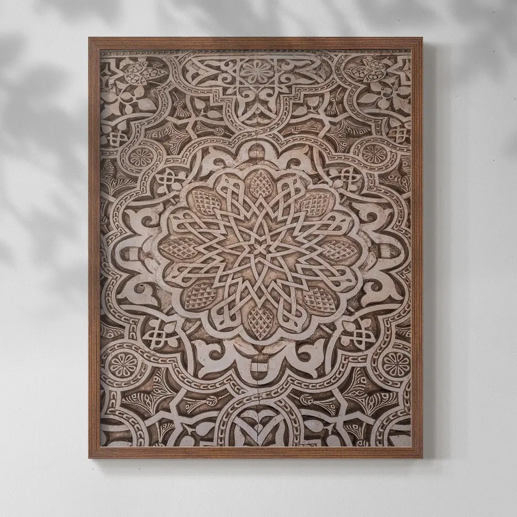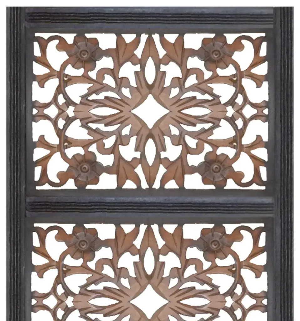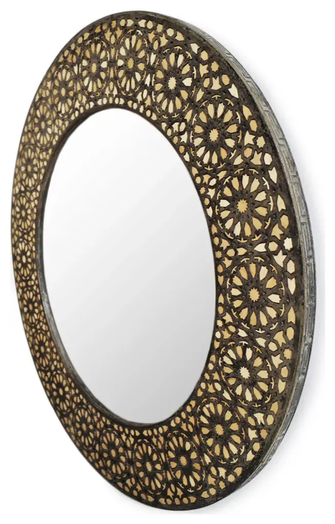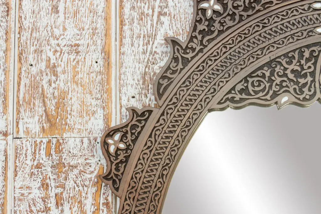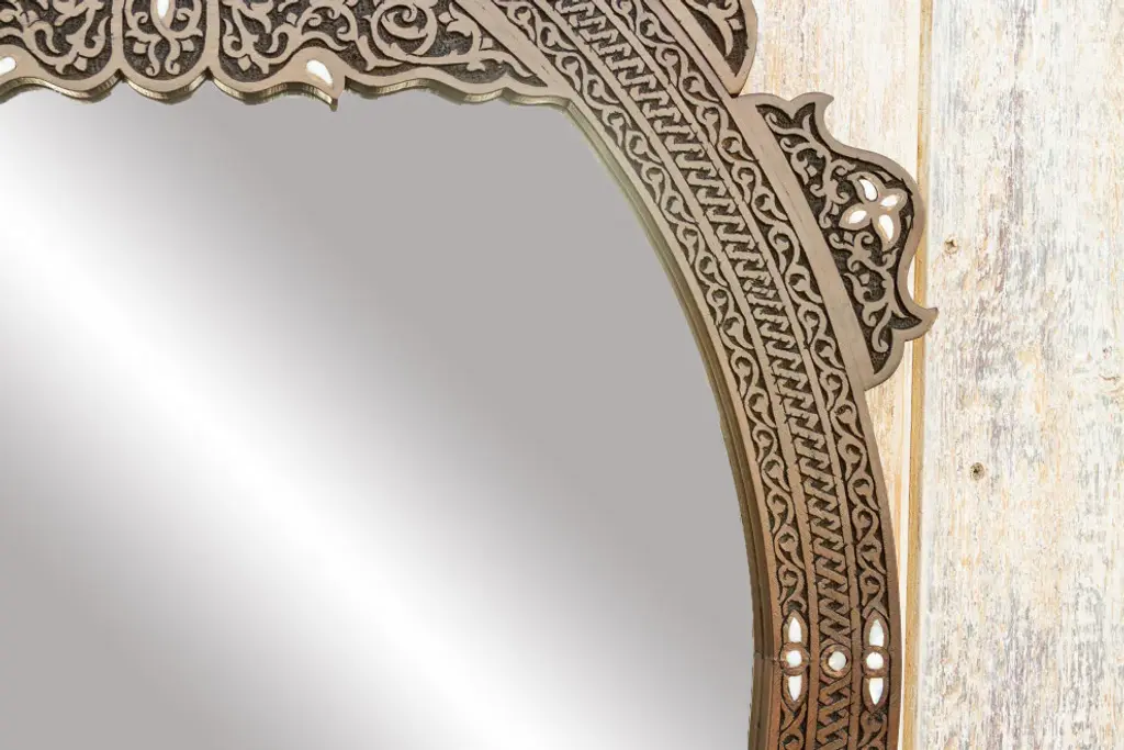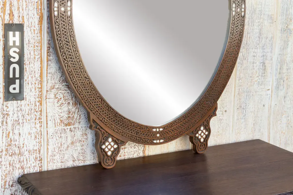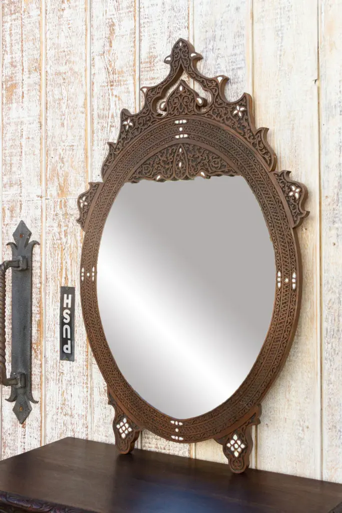 A beautiful late 20th century Syrian mirror with crest decoration on top. This vintage Syrian mother of pearl inlaid mirror has an oval shape and finely carved walnut frame. It features a dark brown finish with foliage carved motifs all around and floral shaped inlay pieces.