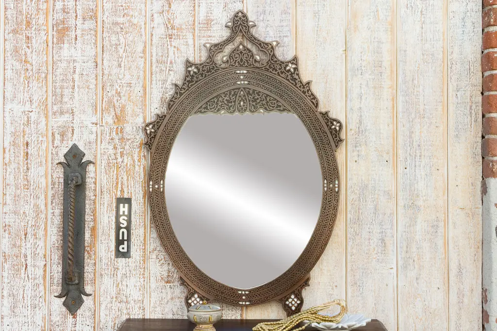 A beautiful late 20th century Syrian mirror with crest decoration on top. This vintage Syrian mother of pearl inlaid mirror has an oval shape and finely carved walnut frame. It features a dark brown finish with foliage carved motifs all around and floral shaped inlay pieces.