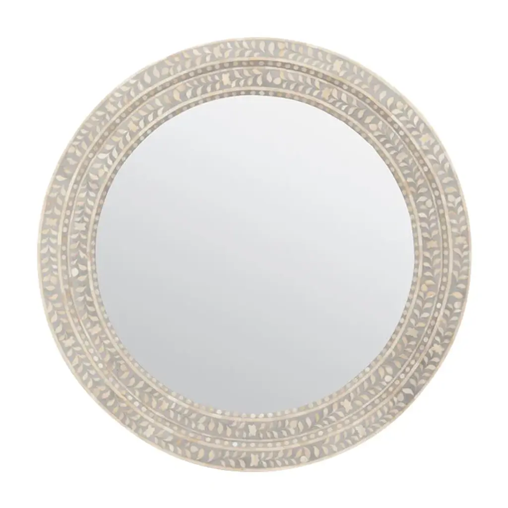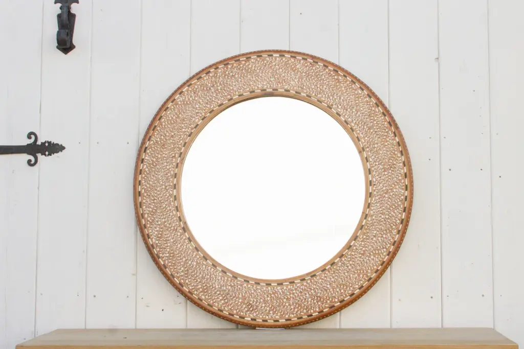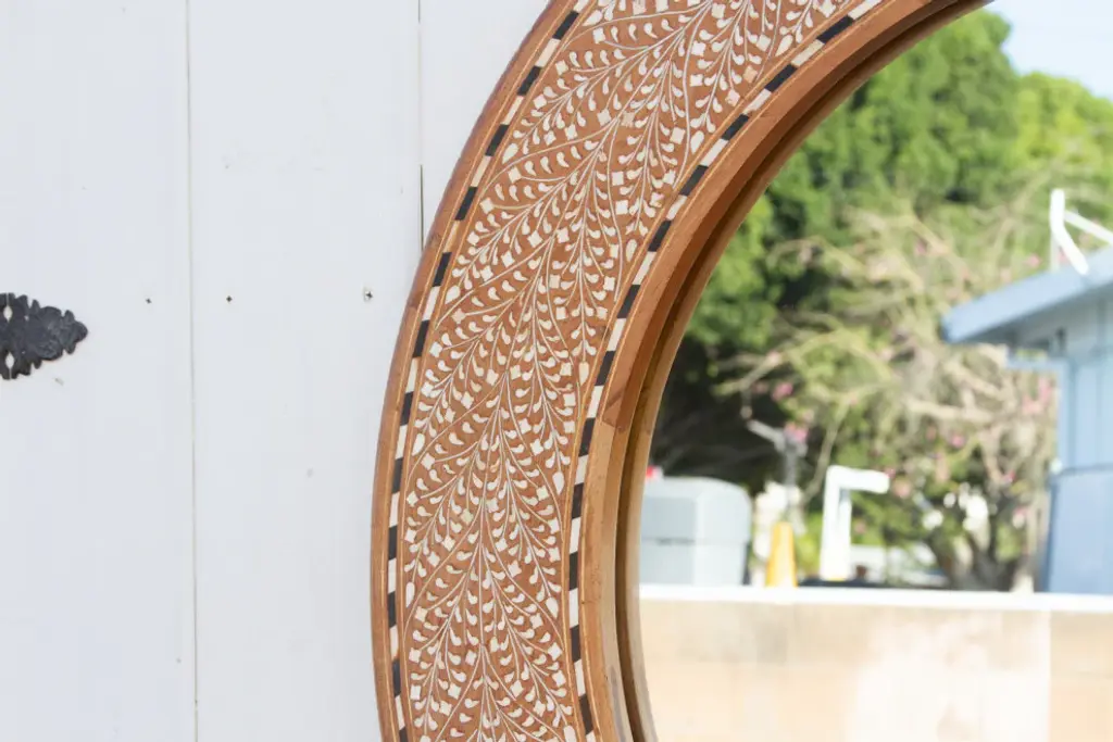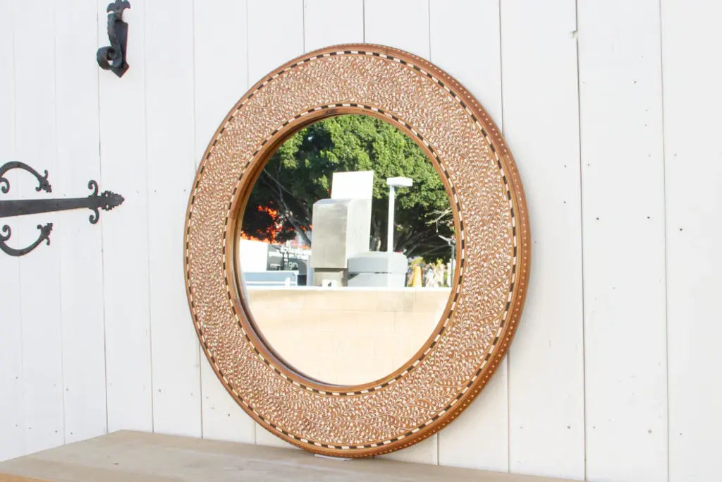 A masterful Anglo Indian teak mirror made from reclaimed teak wood. This beautiful round mirror is all inlaid by hand and adorn with beautiful open leaf inlay designs and motifs all around. This lovely wall art piece has a brown walnut finish contrasting the white inlay design.