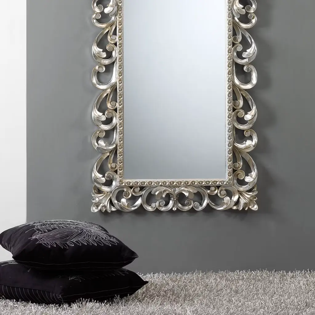 Brimming with timeless sophistication, this exquisite wall mirror strikes with the decoration of curved acanthus leaves inlaid in the solid wood frame. Finished by hand by applying a slightly antiqued, champagne-colored silver leaf, the frame encompasses the rectangular 4mm-thick mirror in precious Italian crystal. Coming with fitted hooks to ease the wall mounting step, this stunning piece is available in a gold leaf variant or can be custom made. Please contact the Concierge for customization requests.
