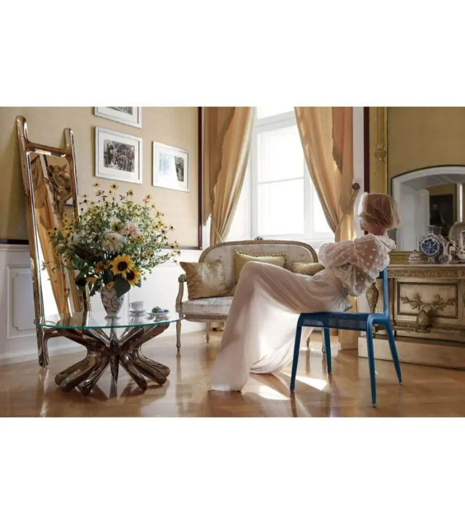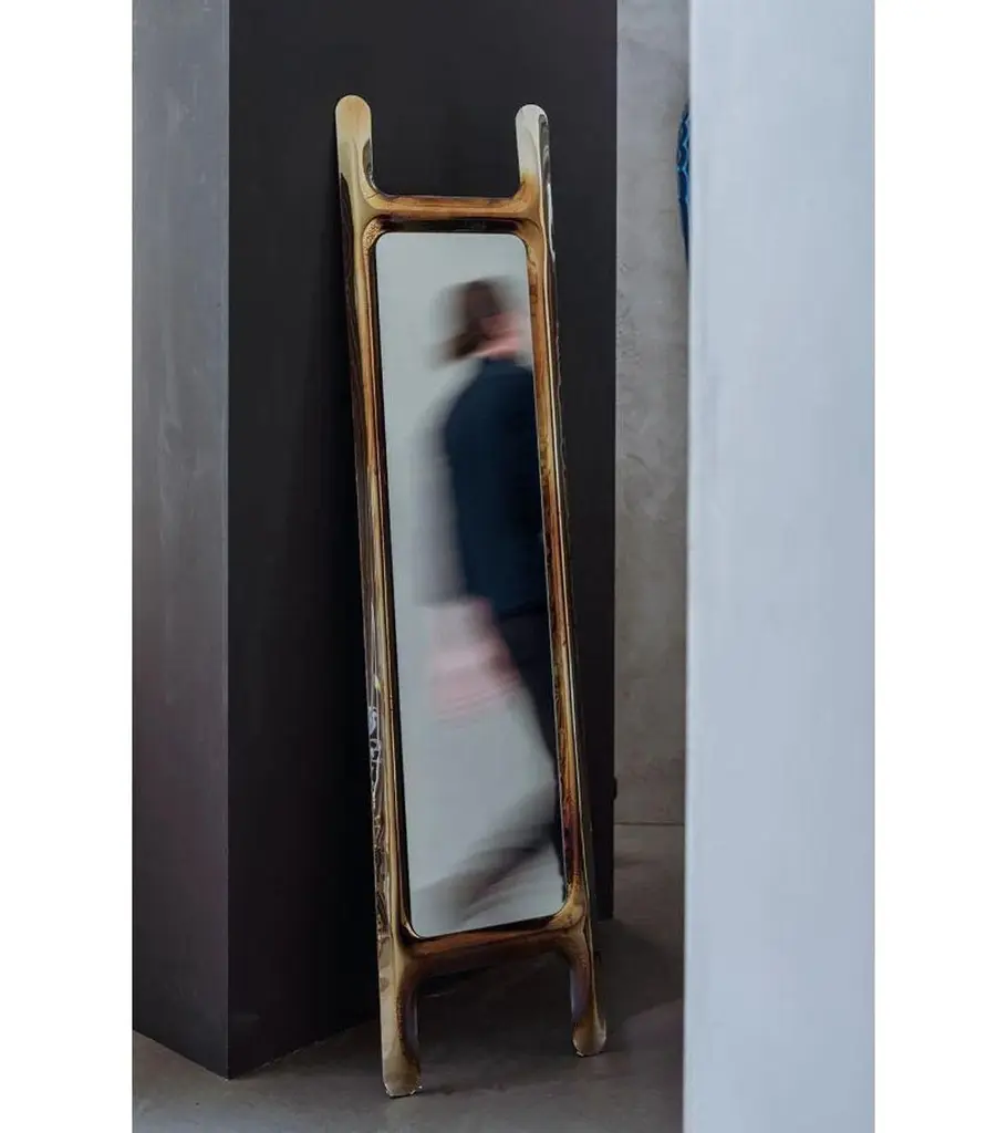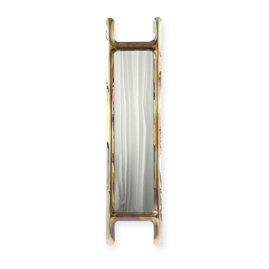 Flamed gold drab sculptural wall mirror by ZietaDimensions: D 6 x W 46 x H 188 cm Material: Mirror, stainless steel. Finish: Thermal colored in Flamed gold. Also available in colors: Flamed gold, cosmic blue, stainless steel, or powder-coated.A DRAB mirror is an object that combines a steel frame with a glass mirror. It is an effect of the experiments with the inflated steel created with the use of FiDU technology that has led Oskar Zieta to create a DRAB hanger and DRAB mirror.DRAB mirror owes its name to its simple form that resembles a ladder (in Polish “drabina”). It is a minimalist object with an elegant framing that can be hung on a wall or leaned against it. In both arrangements, it will add a pinch of elegance to every contemporary interior.DRAB mirror is a geometrical mirror and a decorative object. Contrary to such mirrors from Zieta Collection as RONDO, TAFLA, or OKO, the inflation effect is not so obvious in its case. The deformations of the inflated steel are subtle just as the slender vertical shape of the mirror. The delicate folds are highlighted in the convexity of this simple form.The DRAB mirror can be used as a bedroom or bathroom mirror. It will also serve perfectly as the finishing touch in a modern or classical hallway or corridor. It is a perfect decorative object for private and public spaces such as hotel rooms and SPA parlors.About Zieta: Zietas main goal is to deliver uniqueness and customization in design and construction while keeping the production, transport, and warehousing innovatively efficient.This is how they imagine the future world: Light, durable structures of customized applications produced on demand out of one-of-a-kind parts, yet efficiently.They use a computer-controlled production process. Customized pattern, customized form, customized function, one-of-a-kind product, and outstanding precision are what they deliver.You will find all of this philosophy reflected in the products. They research, they discover new possibilities, they play with forms and they deliver a beautiful, innovative, surprising outcome to people who love the design and who care about design development.They believe their work is a valuable contribution to the world of design not only by the unique beauty of the forms but most of all by opening ultra-innovative opportunities of forming and new paths for the world of the future.