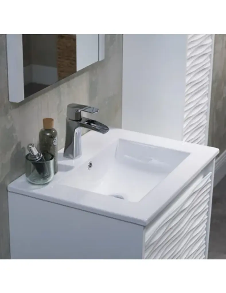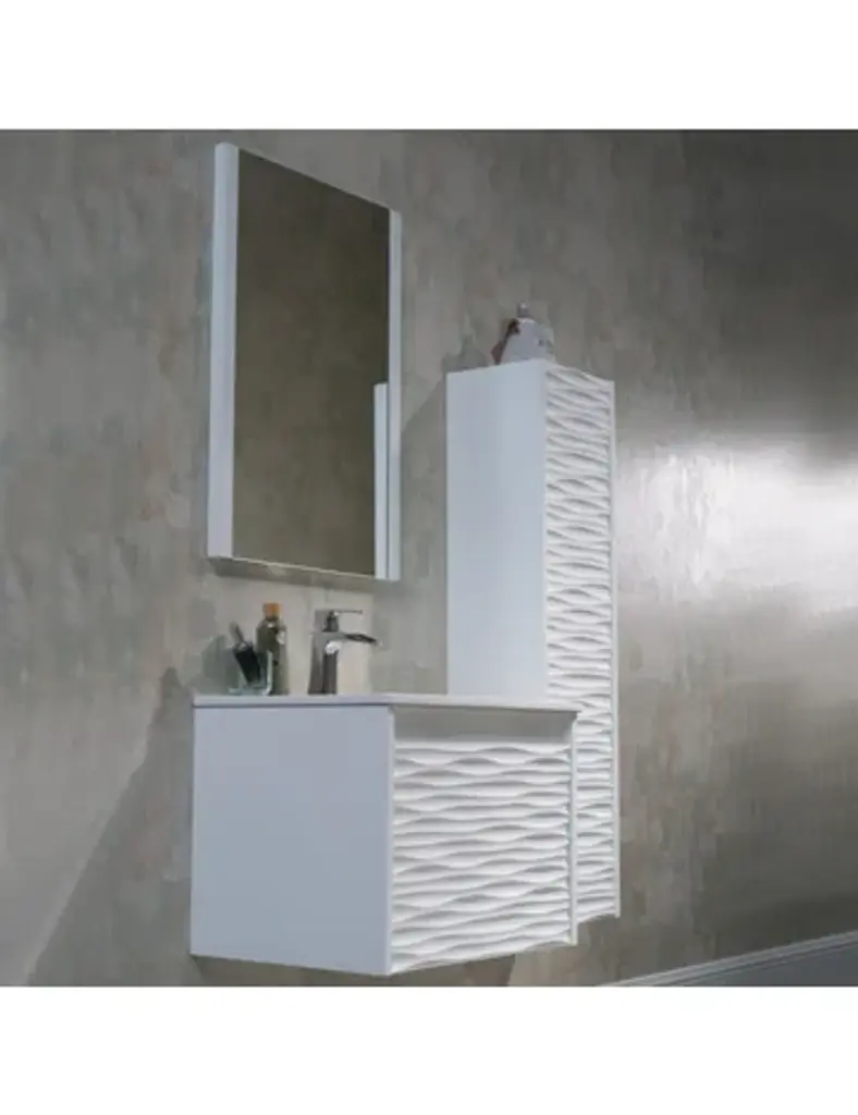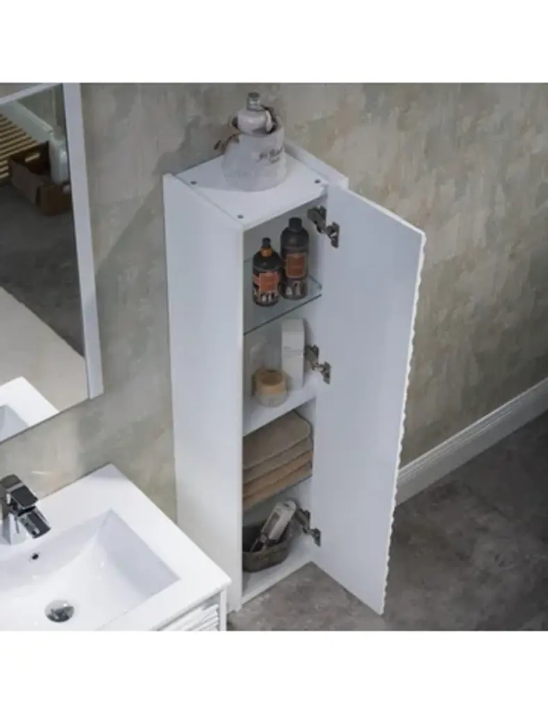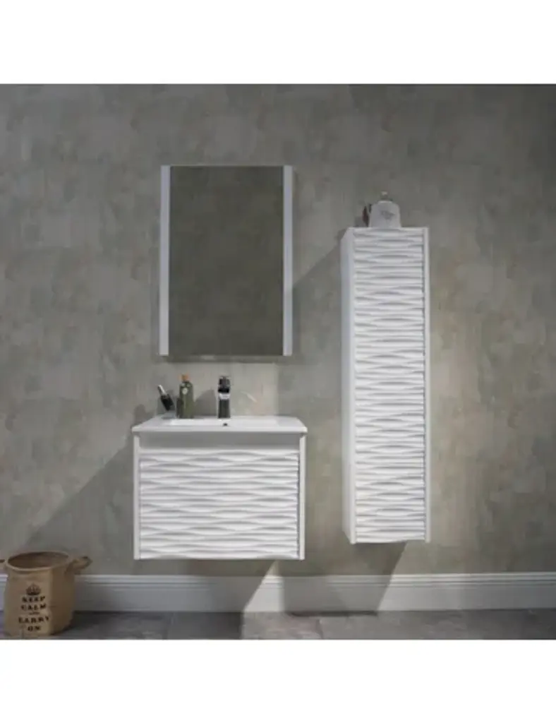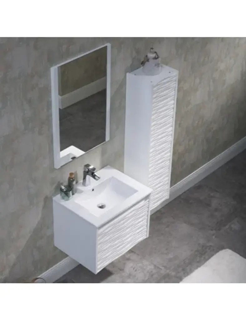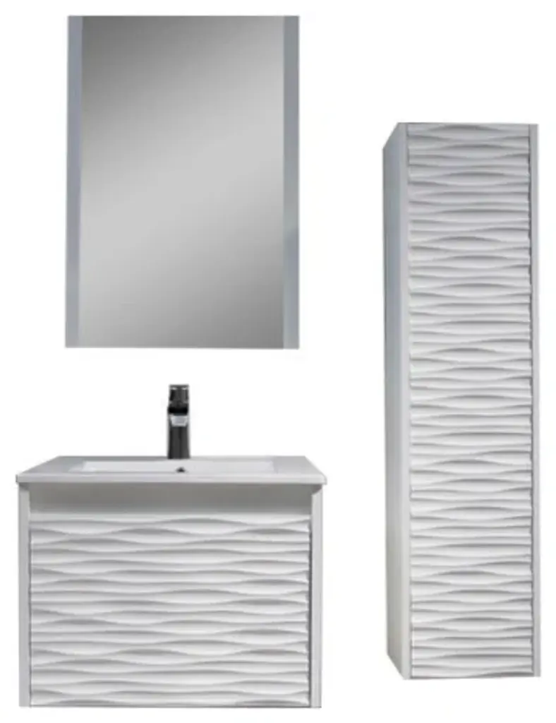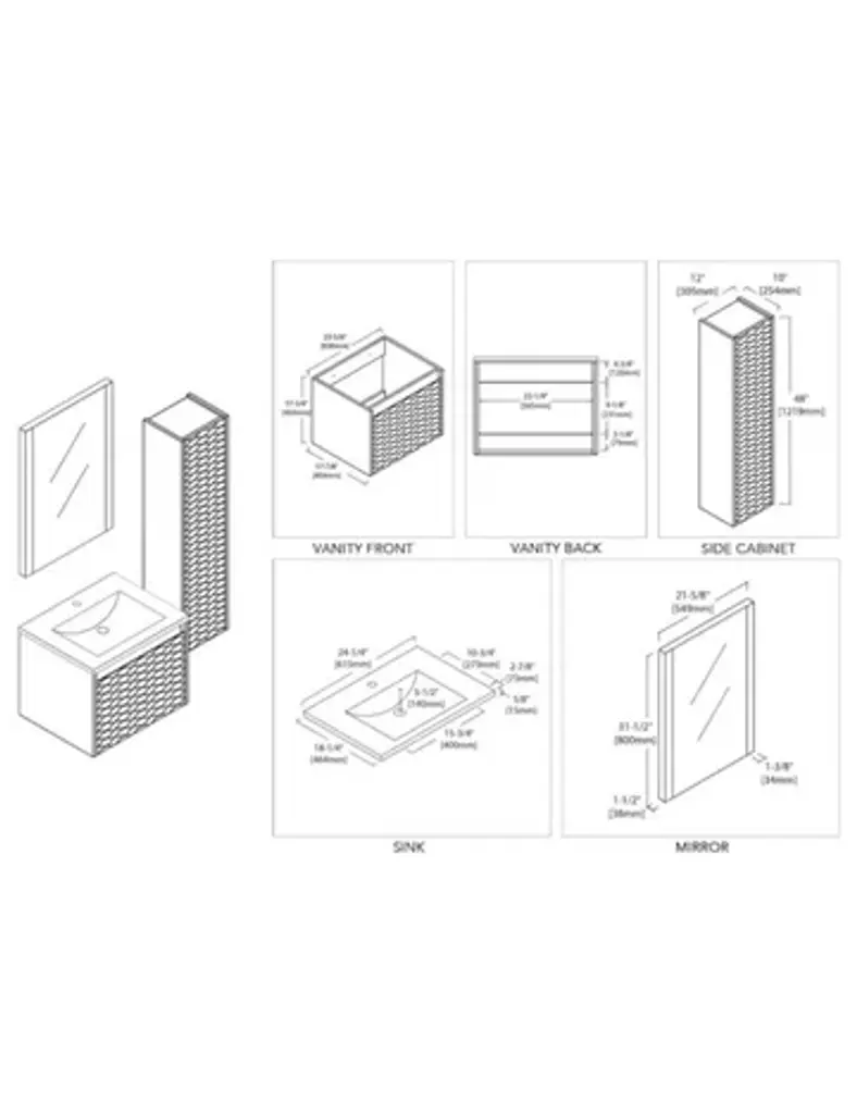 FEATURESALL WOOD provides smooth and elegant design also resistance to dent or distortion.CLASSIC DRAWER Wall-Hung Design with waved-shaped front offers sleek appearance with spacious storage spaces.FIVE LAYERS PAINTING offers 2 times longer lasting and resistance to moisture and humidity.SOFT CLOSE DRAWERS prevents cracks and reduces friction on the hardware.Color matching wood frame mirror offers an elegant completed set look of vanity.Color matching wood frame Medicine Cabinets offers an elegant completed set look of vanity.High quality easy clean up and maintenance free ceramic sink.One year warranty with top level customer service.INCLUDED: Vanity, Topmount Sink, Mirror, Side Cabinet.NOT INCLUDED: Faucets, Pop Up, P trap, etc.
