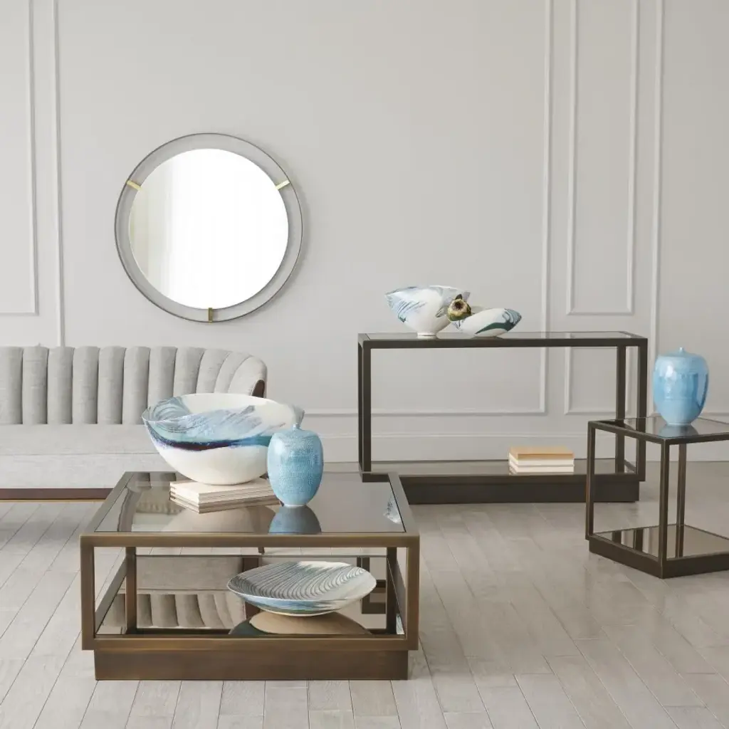 A large simple round iron frame finished in natural iron surrounds this beautiful flat clear mirror. Held in place by 3 solid brass clips in a shiny nickel finish. Hangs two directions, cleat provided. From a fashion forward perspective, Global Views offers accessories, furniture, statement lighting, and an assortment of rugs and mirrors to add beauty and joy to your home.