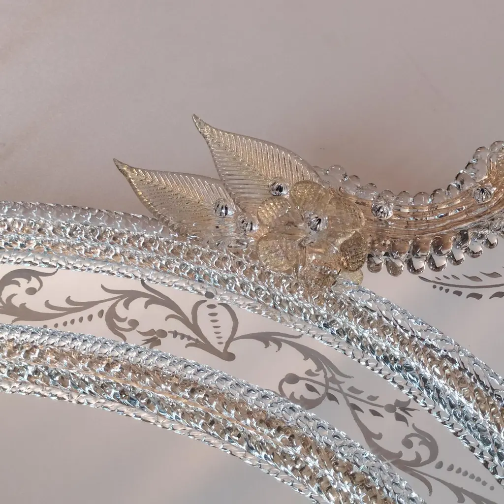 “Florida” Venetian Murano Glass Mirror, made by the expert hands of Murano Masters, with frame composed of Murano crystal reeds and curls on a gold background, the engravings that adorn this luxurious mirror are completely handmade, and the trim composed of roses and leaves of various sizes are gold in color and embellish this wonderful mirror made in the Fratelli Tosi workshop on the island of Murano.