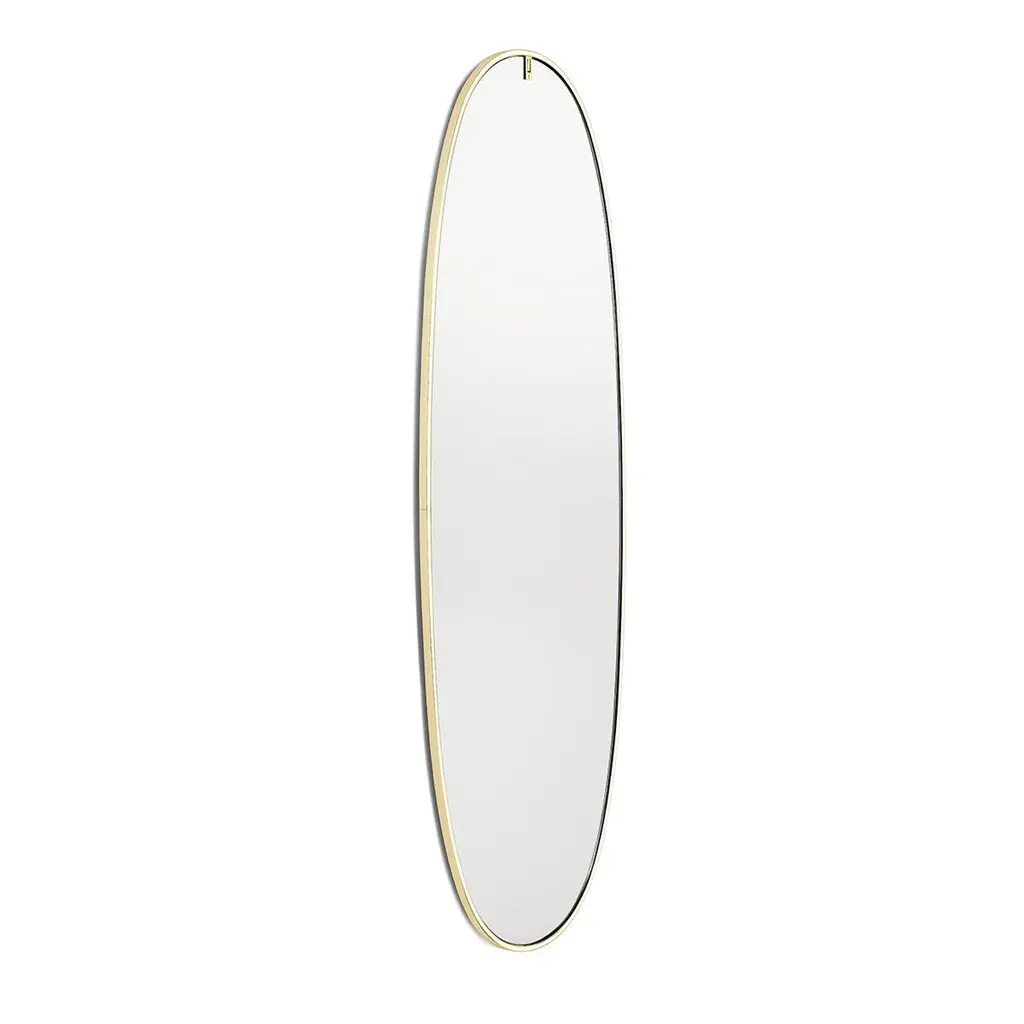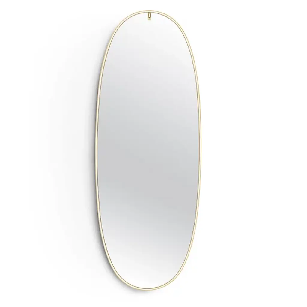 La Plus Belle is a mirror with incorporated light sources. The aluminium frame is available in various finishes (polished gold, polished copper, polished bronze and aluminum, and houses high chromatic rendering led light sources (CRI 95) and an optical opal silicone diffuser.The mirror is made of .24" extra-clear glass, with a layer of safety and aesthetic film to the rear, and it is fixed to the frame by means of a polycarbonate glazing bead.La Plus Belle mirror is hung from the wall by means of a hook with a dual magnet fixing device to keep it in position. It is powered by means of a wall-mounted power supply unit or IEC power cord and connector socket. The optic sensor command fitted to the mirror or remote 0-10/1-10 V - PUSH - DALI control can be used as a dimmer to adjust the light intensity by 10% to 100% in either direction.Additional Information:Material: Aluminium, mirrorFinish: GoldMounting: Wall (with wall-mounted power supply)Lamp (Bulb) Description: 560 Top LED 58W 5300lm 2700K CRI95IP Rating: IP20Environment: Indoor - Dry LocationDimension: 30.7 W x 2.2 D x 80.9 H inchAvailable in other finish options: Aluminum, copper, polished bronzeAvailable in other version: Plug-in power supply