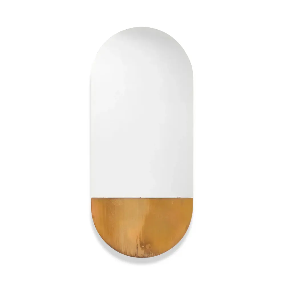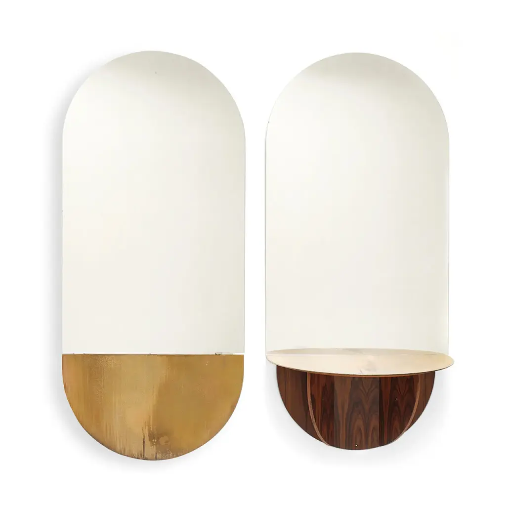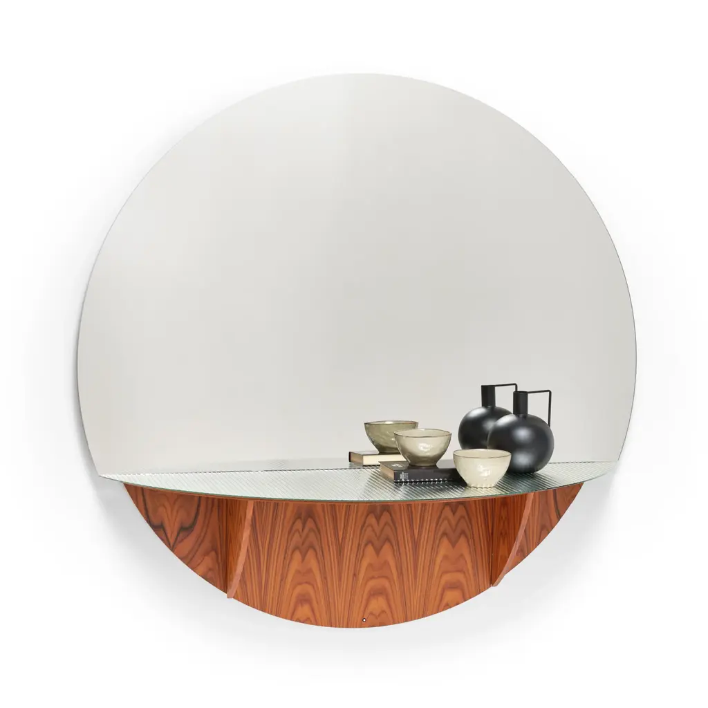 Enhance your space with the Folding-Top Minimalist Mirror by Mogg Brame. Classy and versatile, it transforms from a mirror to a console with a simple fold. Whether in the entrance or sleeping area, its minimalist design adds elegance, while the beautiful finishes, including Santos Rosewood, exude sophistication. Available with canete or oxidized mirror glass. Wall fixing required.