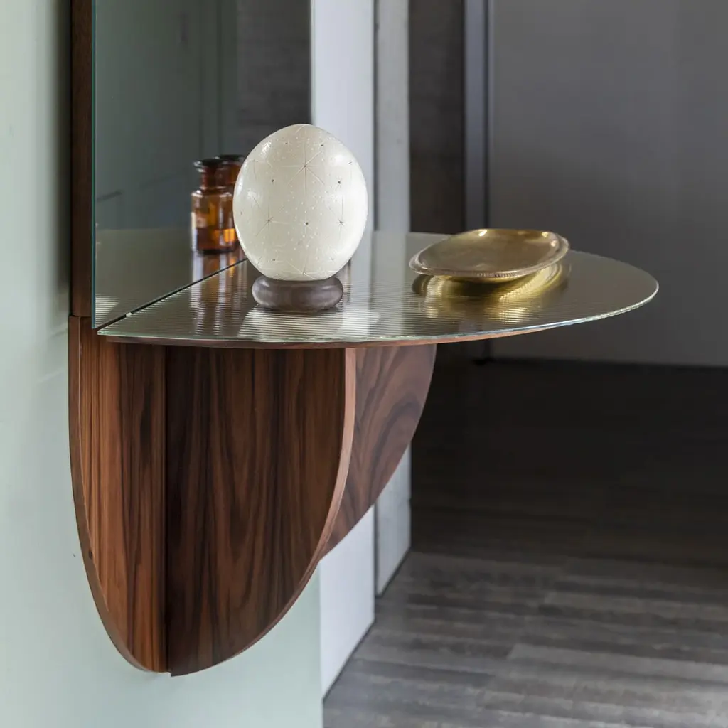 Enhance your space with the Folding-Top Minimalist Mirror by Mogg Brame. Classy and versatile, it transforms from a mirror to a console with a simple fold. Whether in the entrance or sleeping area, its minimalist design adds elegance, while the beautiful finishes, including Santos Rosewood, exude sophistication. Available with canete or oxidized mirror glass. Wall fixing required.