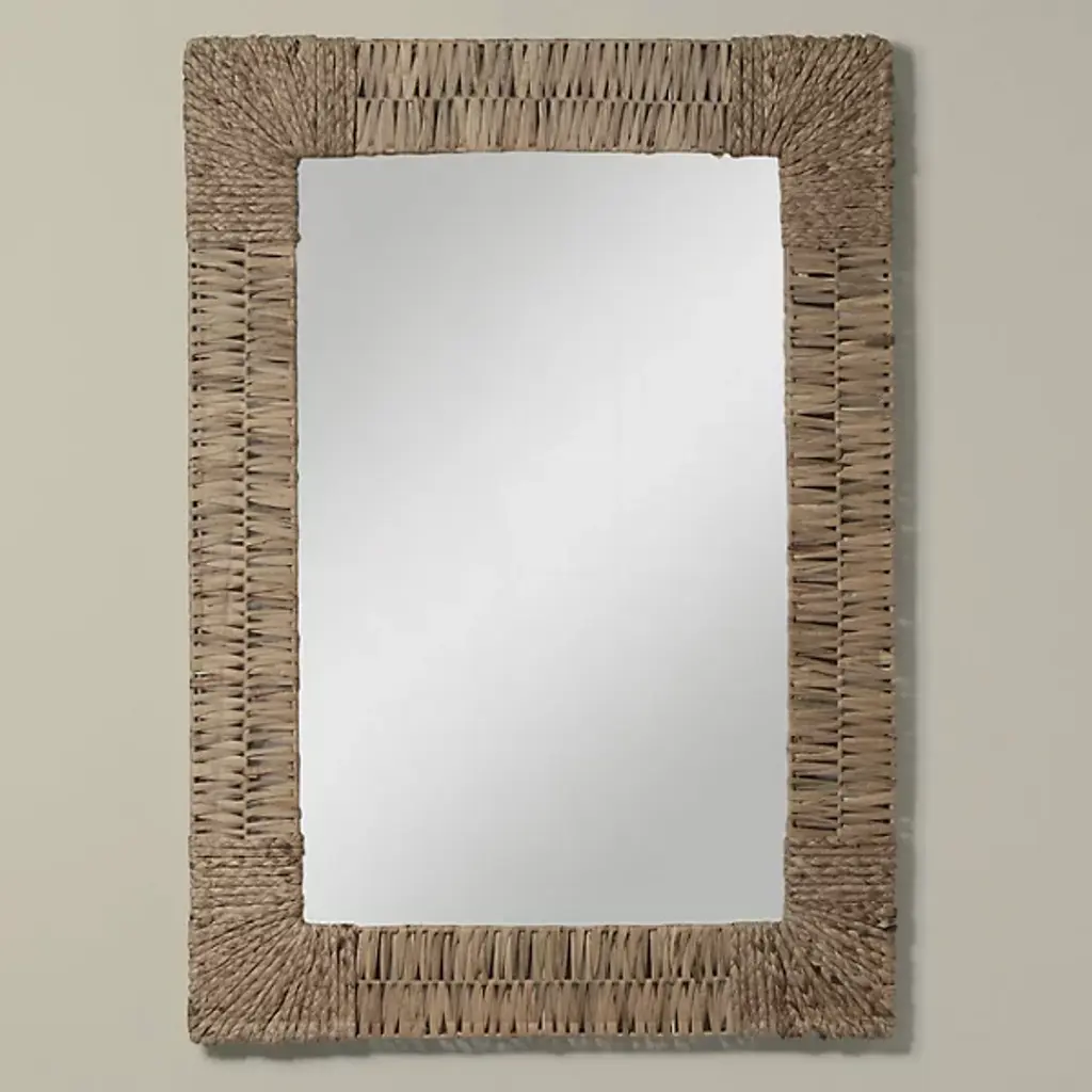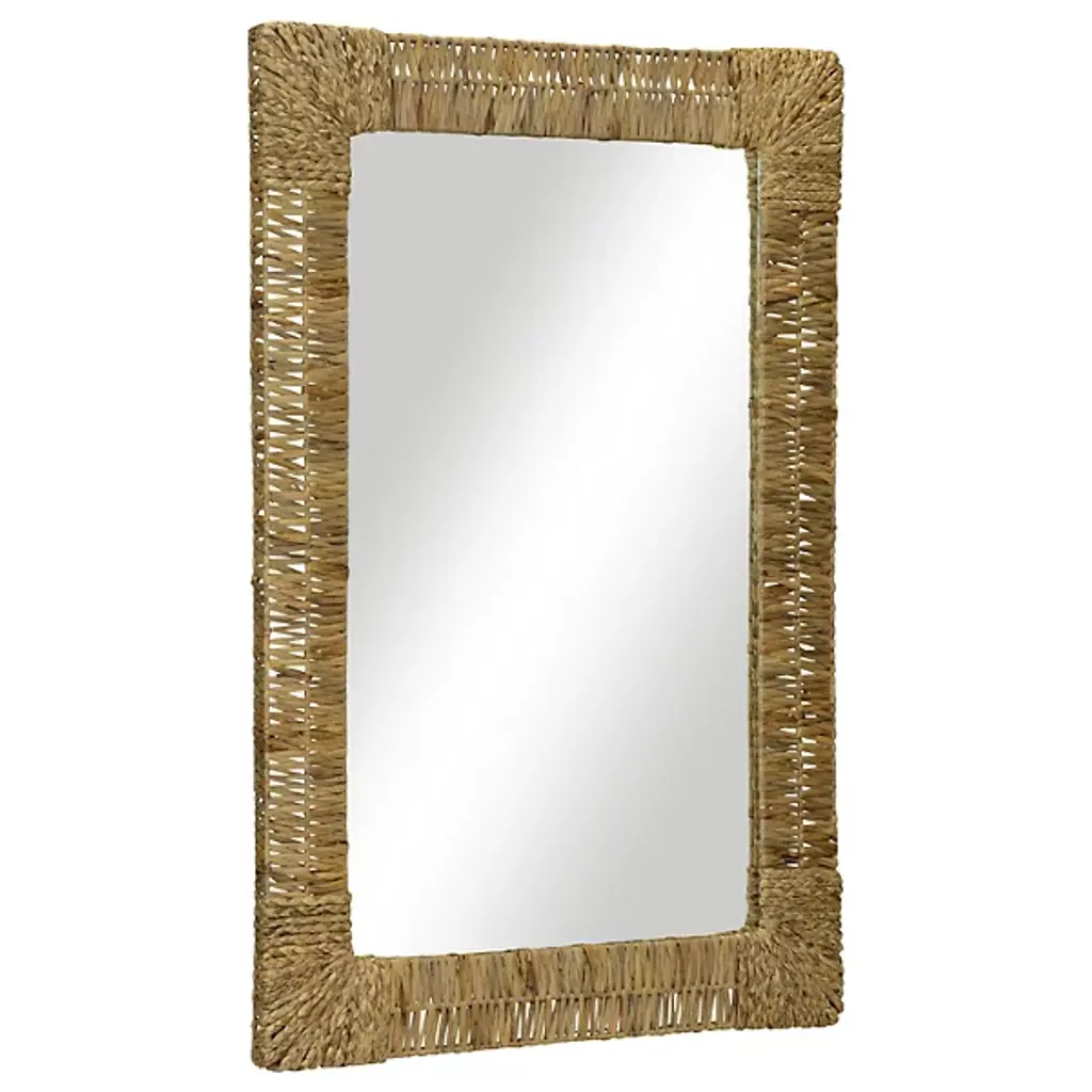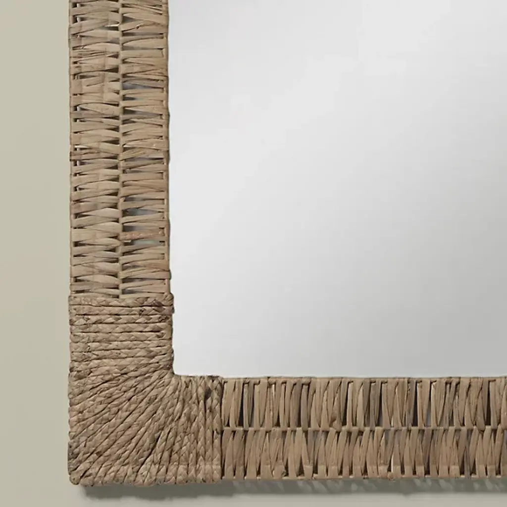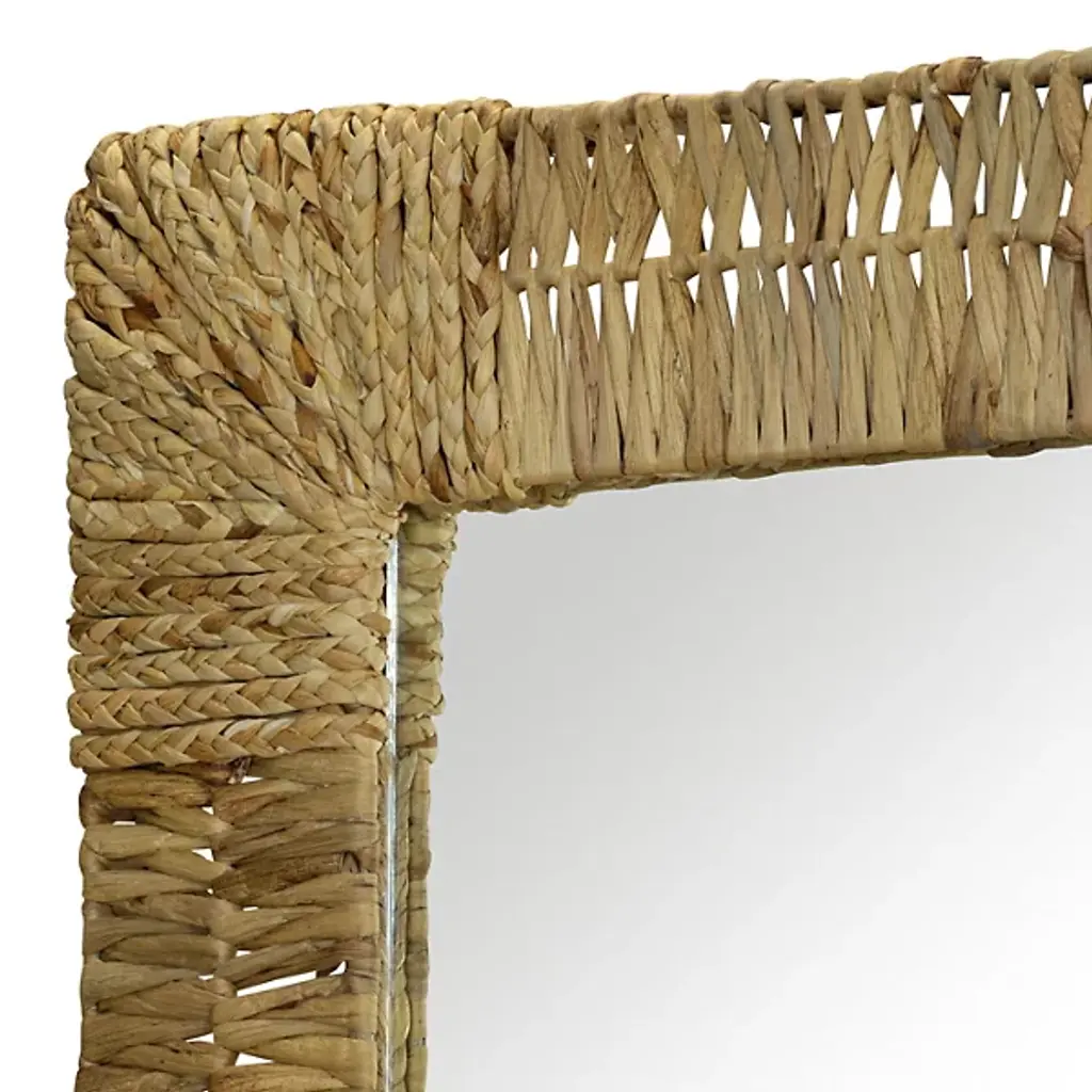 The Folha Rectangular Wall Mirror from Woven employs traditional weaving techniques with water hyacinth leaves. Each strand is carefully interwoven to create alternating patterns around the frame, while braided accents mark the corners with purposeful detail. The sustainable material brings natural elements indoors, making this mirror an artisanal addition to entryways, living rooms, or bathrooms.