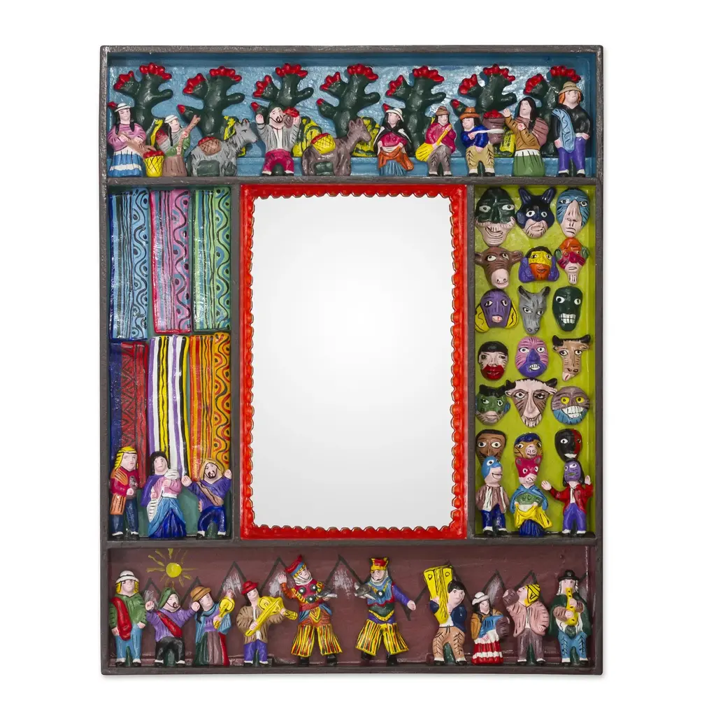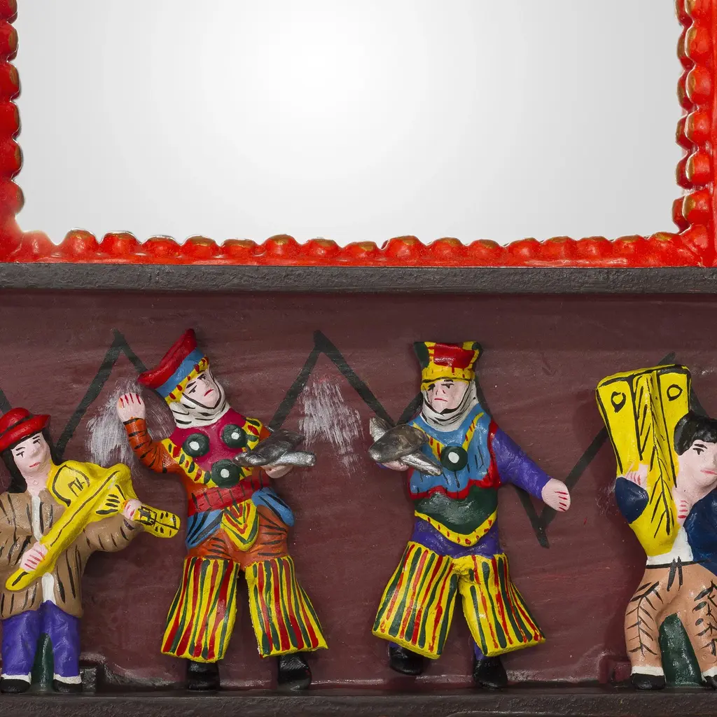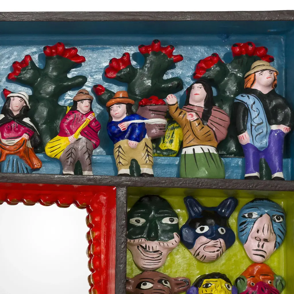 Alejandro Chávez crafts a mirror frame rooted in Andean tradition with four different vignettes. At the top, people harvest tunas, the red fruit of the prickly pear cactus. To the left, merchants offer warm blankets in a market stall and to the right they sell handcrafted masks. Used during the Carnival celebrations preceding Lent, the masks appear in an astonishing array of animals, human and fantasy faces. Along the bottom, dancers perform the Scissors Dance. Known as retablos, these traditional dioramas feature figures carefully molded from ceramic plaster and painted by hand.