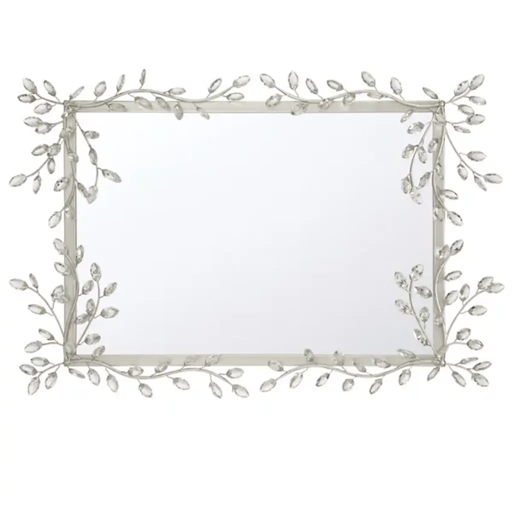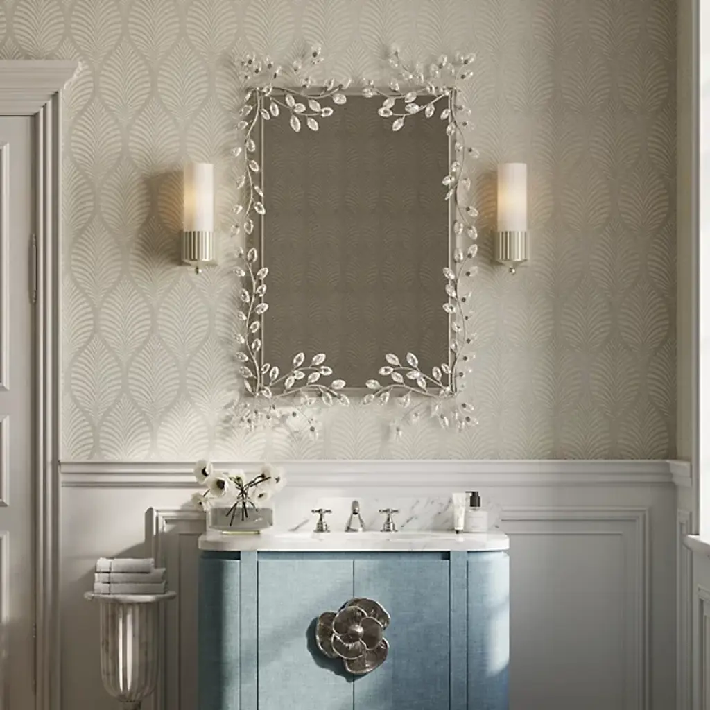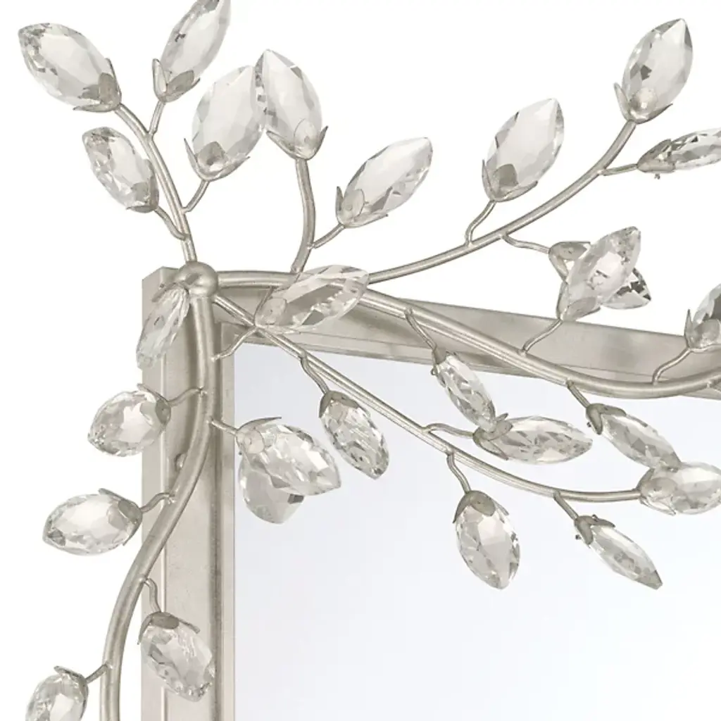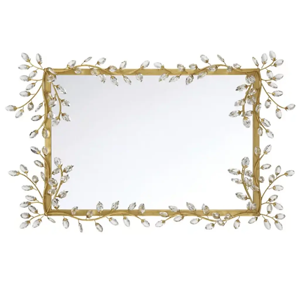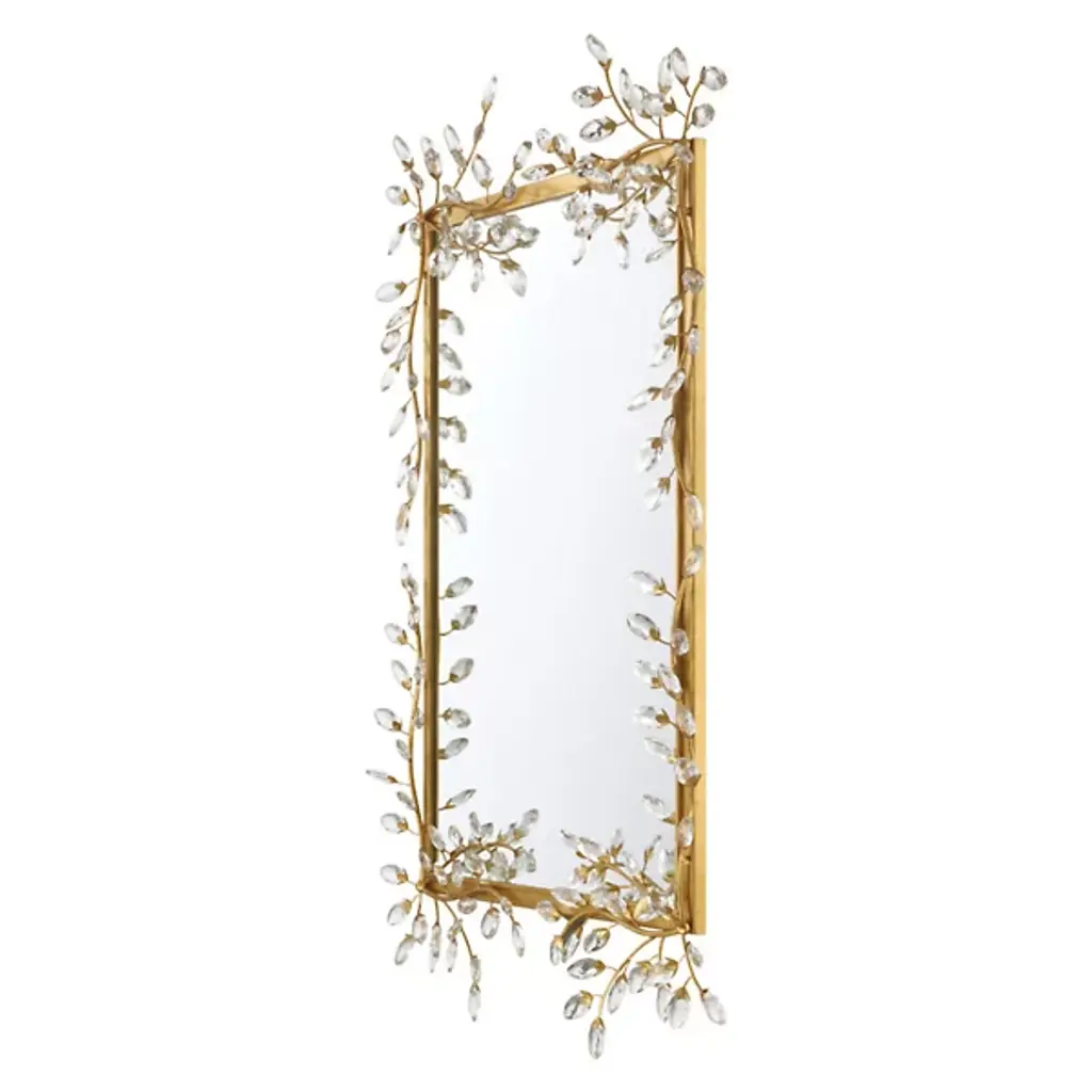 The Forget-Me-Not Wall Mirror from Currey & Company updates a rectangular frame into botanical artwork through hand-applied crystal flowers. The delicate crystal blooms cascade along all four sides of the frame, resembling their namesake, the forget-me-not flowers, in their petite scale and clustered arrangement. Each flower catches and reflects light differently, creating sparkle that changes throughout the day.