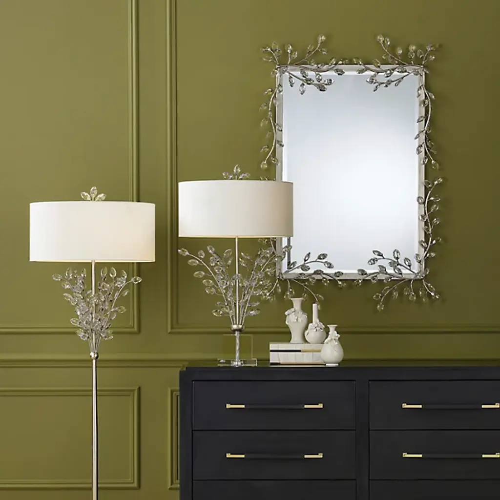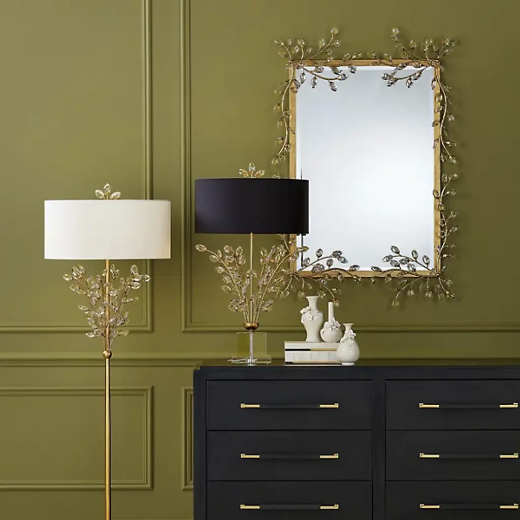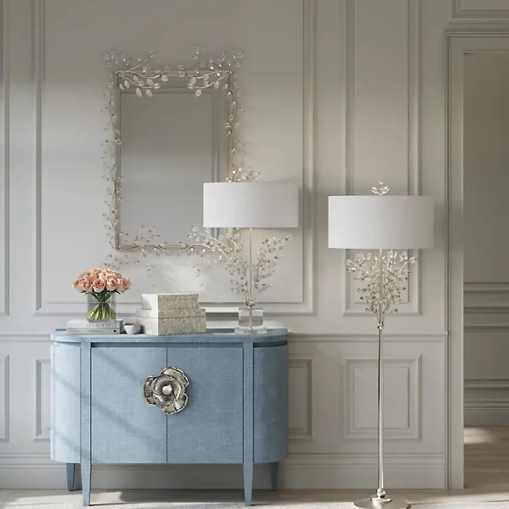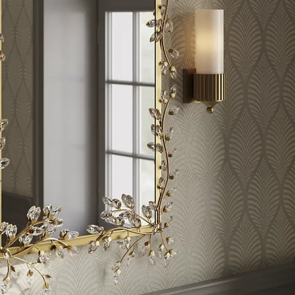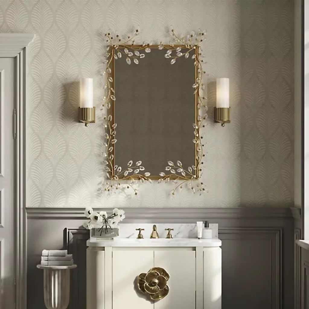 The Forget-Me-Not Wall Mirror from Currey & Company updates a rectangular frame into botanical artwork through hand-applied crystal flowers. The delicate crystal blooms cascade along all four sides of the frame, resembling their namesake, the forget-me-not flowers, in their petite scale and clustered arrangement. Each flower catches and reflects light differently, creating sparkle that changes throughout the day.