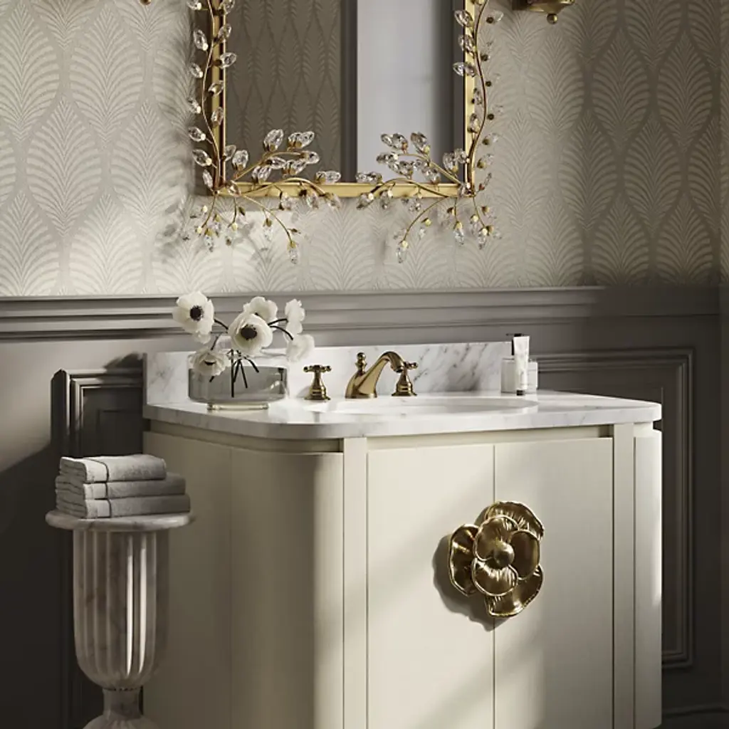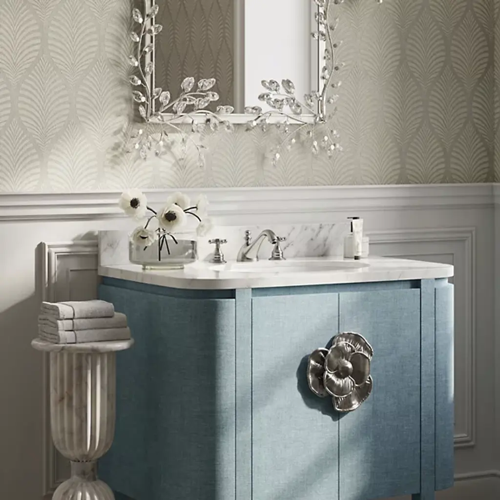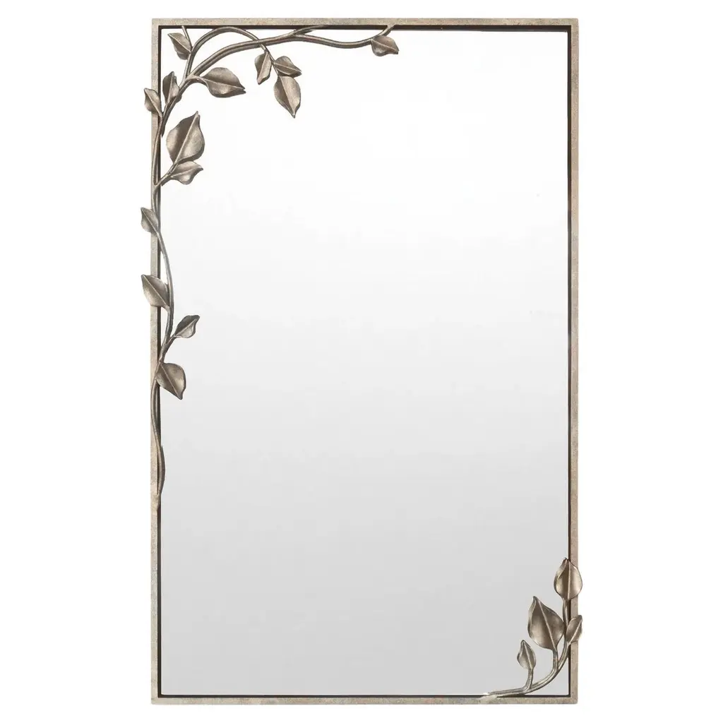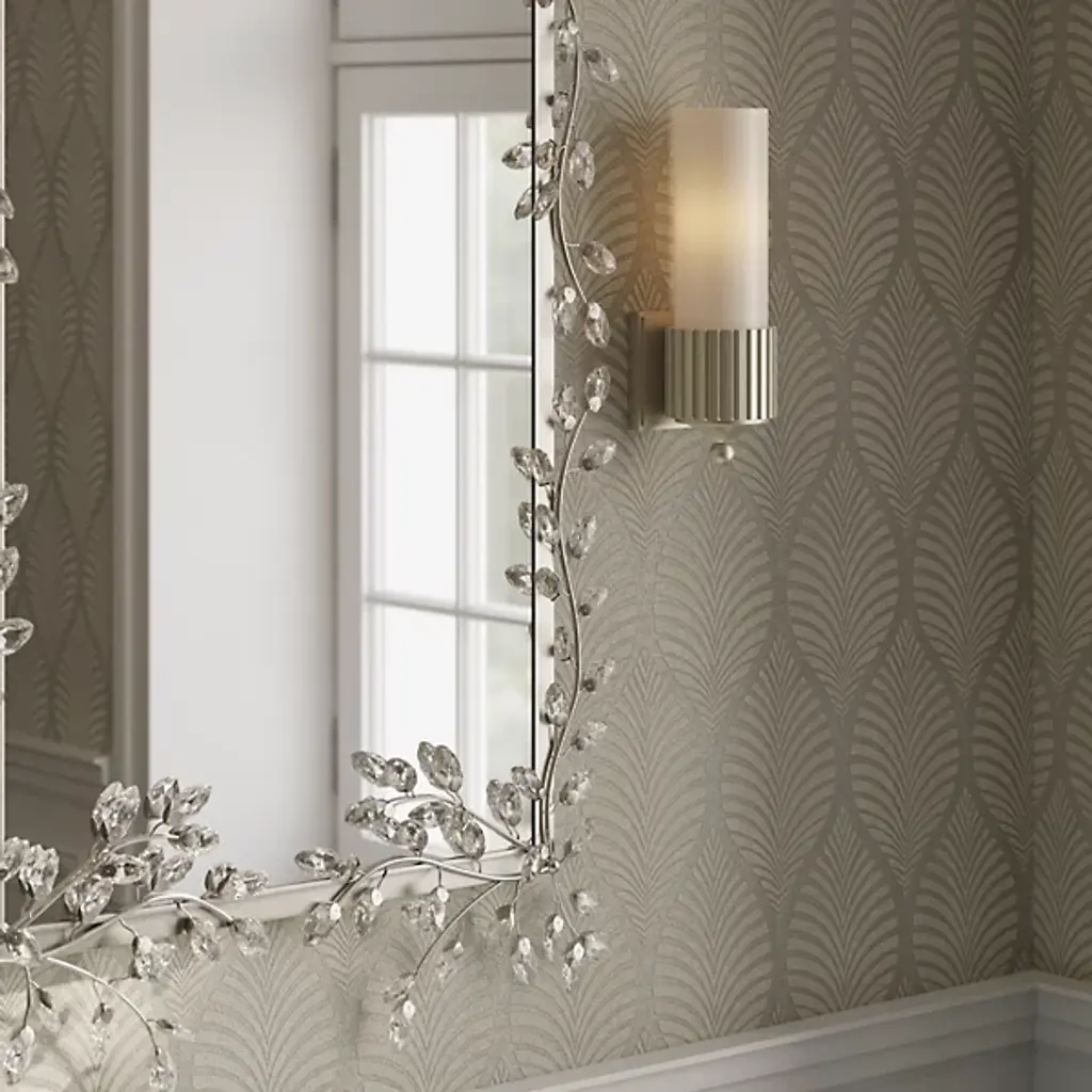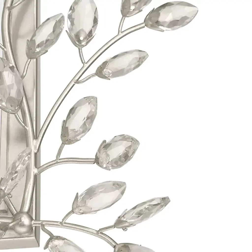 The Forget-Me-Not Wall Mirror from Currey & Company updates a rectangular frame into botanical artwork through hand-applied crystal flowers. The delicate crystal blooms cascade along all four sides of the frame, resembling their namesake, the forget-me-not flowers, in their petite scale and clustered arrangement. Each flower catches and reflects light differently, creating sparkle that changes throughout the day.