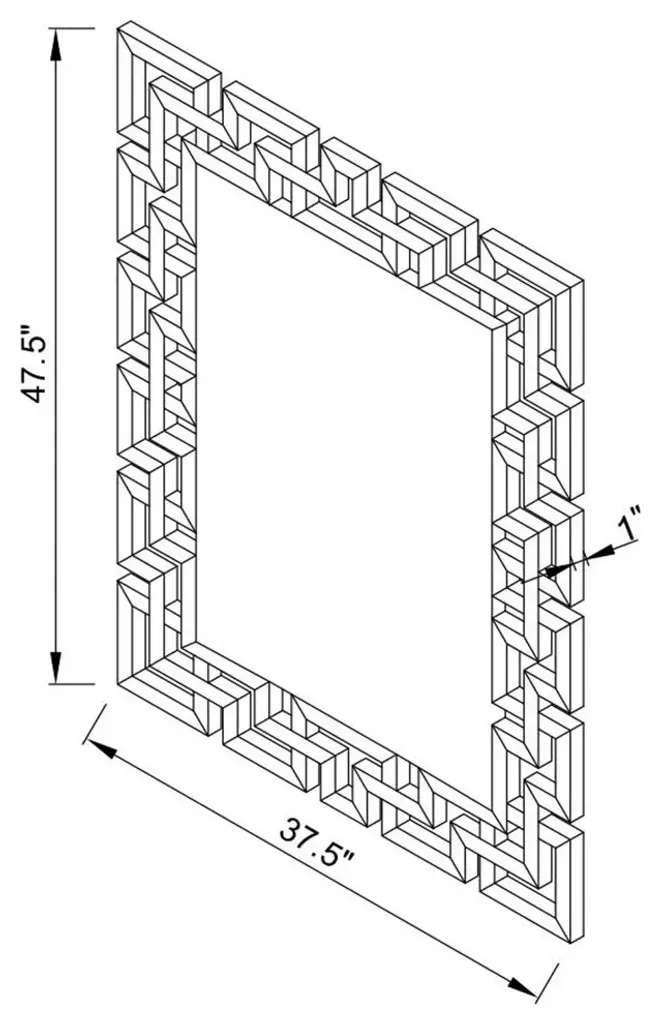 This decorative wall mirror features a striking mirrored frame with an interlocking geometric pattern that adds dimension and modern style. Designed for flexibility, it can be hung either vertically or horizontally to suit various spaces. The reflective frame enhances brightness and visual depth, making it an ideal accent for living rooms, entryways, or bedrooms. Its bold design adds a statement element while maintaining a clean, mirrored finish.Features: Includes: One (1) wall mirror Wall mirror with rectangular shape and mirrored glass surface for full reflectionFramed in beveled mirrored panels with a layered geometric interlock patternCan be mounted vertically or horizontally for versatile wall placementReflective frame adds depth and amplifies light in any roomDistinctive design creates a bold focal point in modern interiorsIdeal for entryways, bedrooms, or living spaces seeking a statement mirrorColor: SilverDimensions: Wall Mirror: Width: 37.50, Depth: 1.00, Height: 47.50, Weight: 42.33