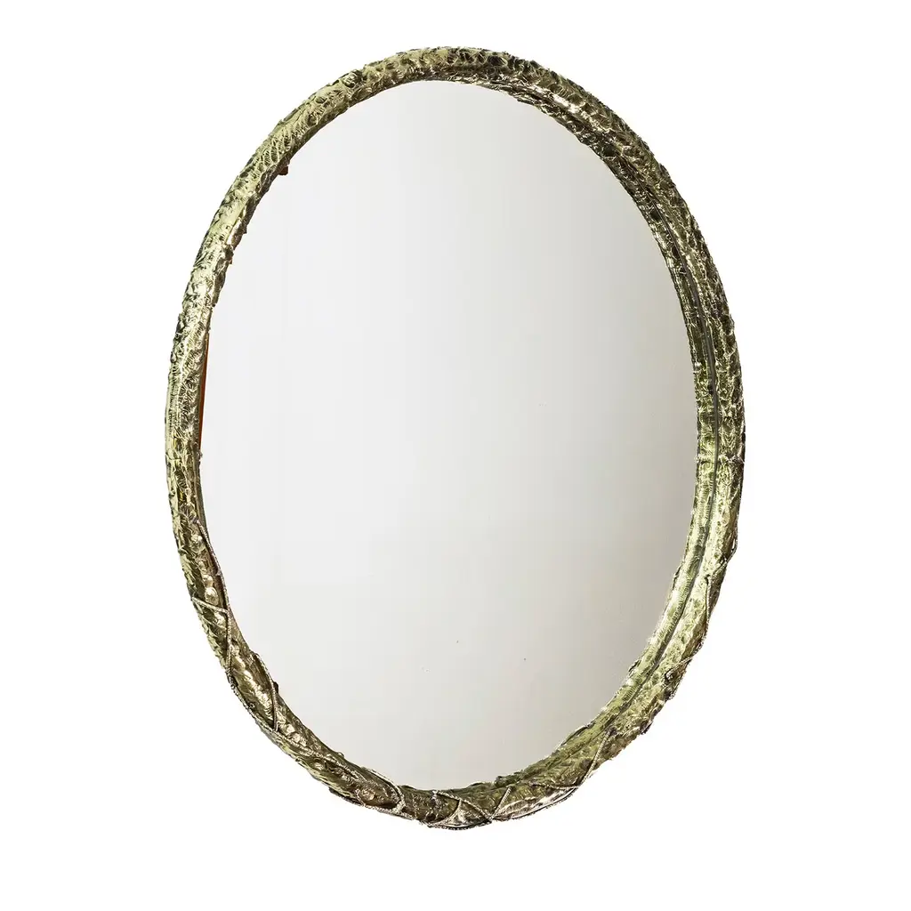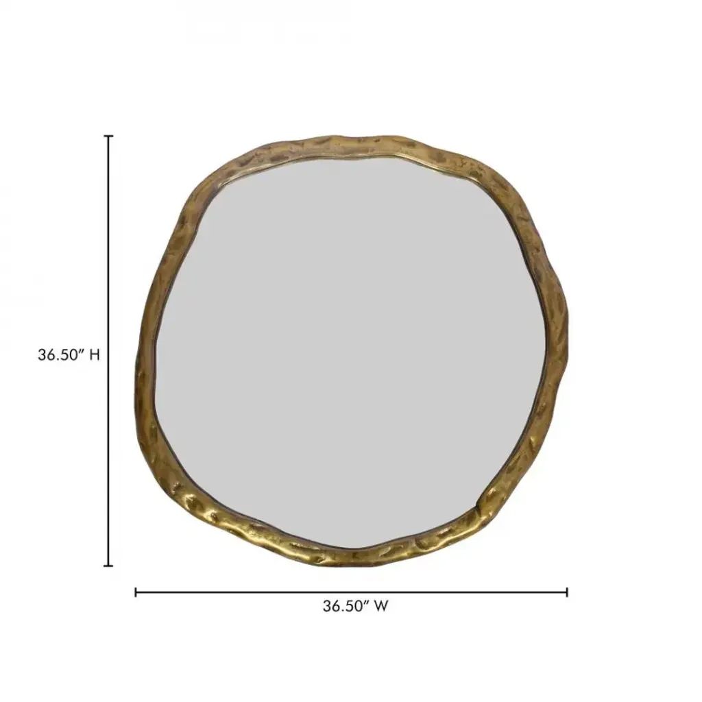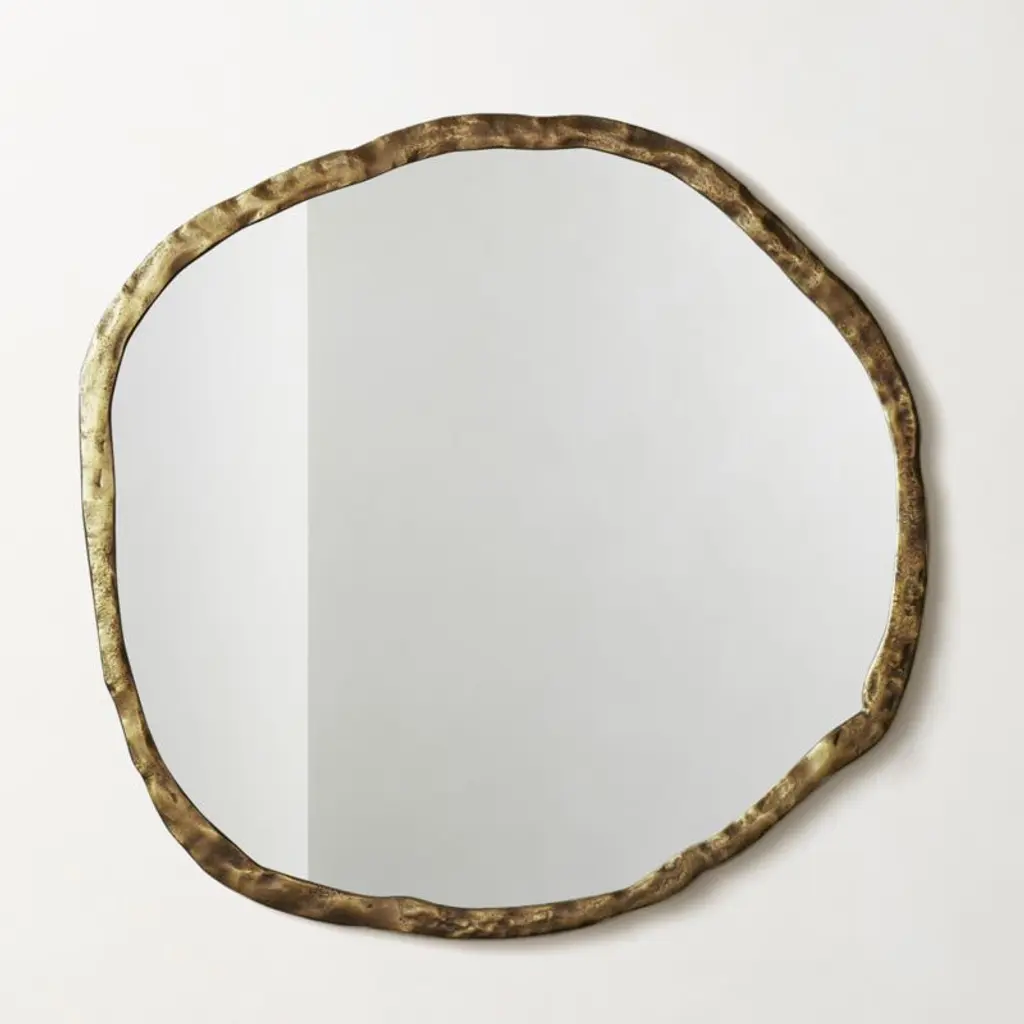 Amp up those positive reflections with this golden beauty. The large Foundry wall mirror will hang centerfold wherever you've been looking the most. Mirrors brighten up your space in an instant, and this one hangs easily in a lighter-weight aluminum frame. Artfully rustic with an organic touch to its wood-like design.