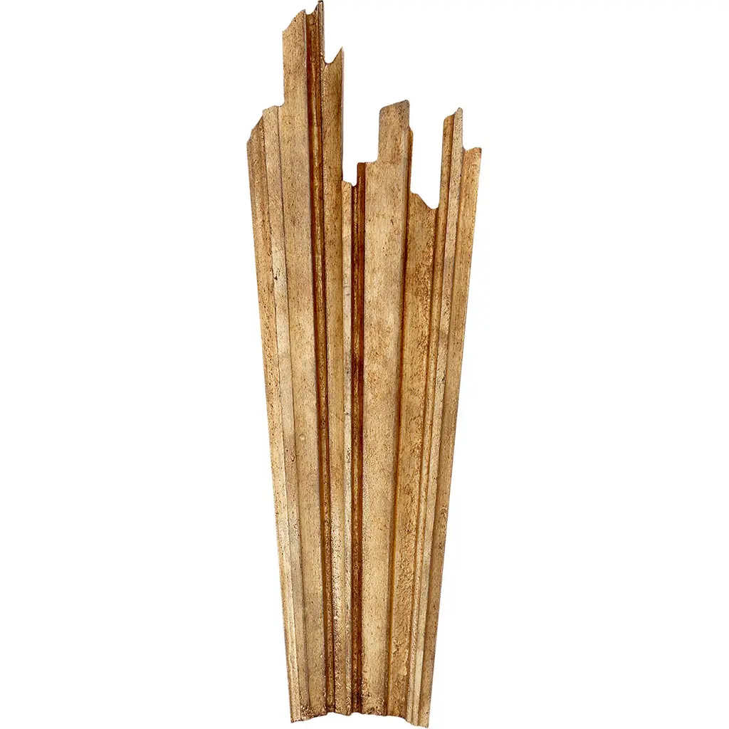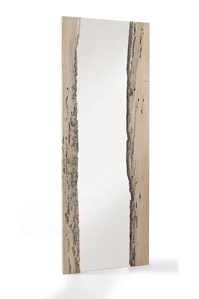 This wall mirror, visually recreating the Venetian aesthetic and acting as a tribute to the city of Venice, features two strips of Rovere Briccola, kept in their original form, with a mirror inserted recreating the flow of water between the Venetian canals. Le Briccole are the undisputed protagonists of Venice and characterize the skyline. Here, oak poles are used to signal to the boatsmen the limit of the deepest part of the lagoon, allowing them to navigate without risk and guiding them along their path; here they avoid becoming stranded in areas of shallow water and in the foundations of the Venetian palaces. Periodically, the Briccole are replaced after being damaged and curved by molluscs, which, through a work of perfect round holes, leave the mark of their passage. A pole of Briccolaremains immersed in the lagoon on average between 10 and 150 years (depending on the conditions of high and low tide into which it is submerged), then, corroded by marine flora and fauna from the tidal flow, is replaced. This is a material that tells and is part of the story, which is recovered, selected, carefully cleaned, and worked to build unique furnishings and accessories with unrepeatable charm.