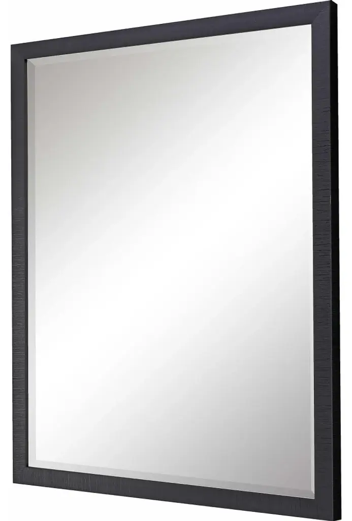 Elegant beveled mirror is framed in a black block contemporary molding. Beveled mirror size is 30 x 40.