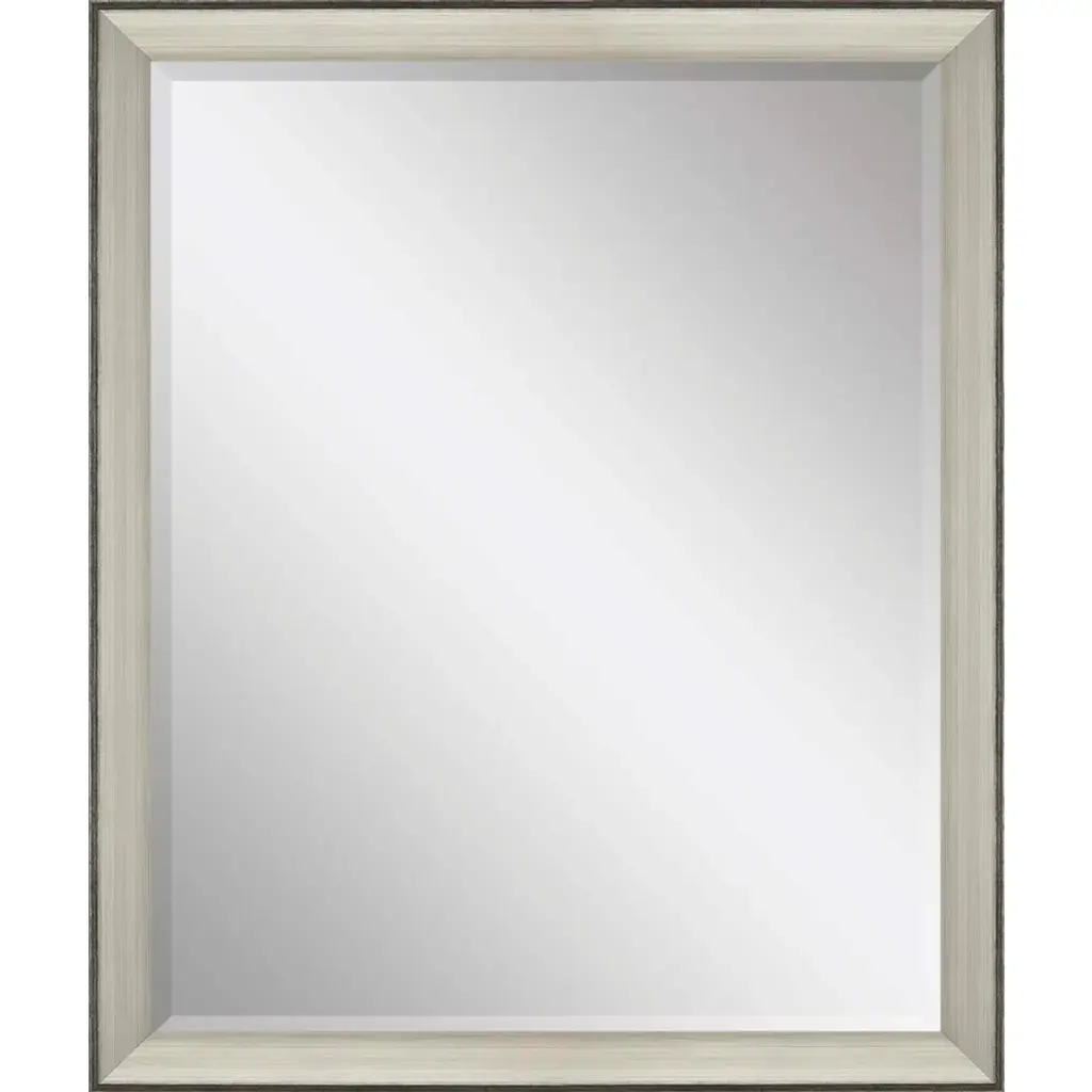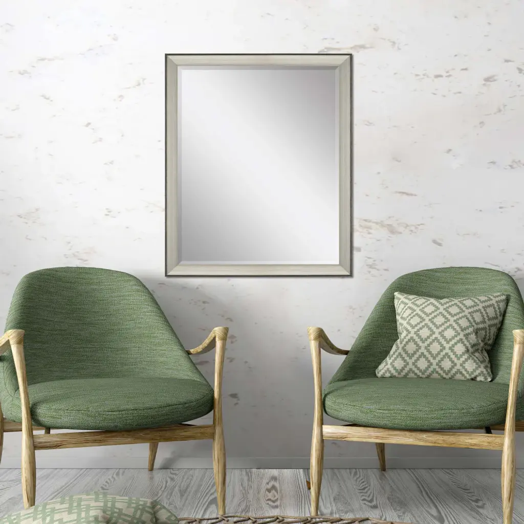 Elegant beveled mirror is framed in a modern silver finish molding with black accents. Beveled mirror size is 22 x 28.