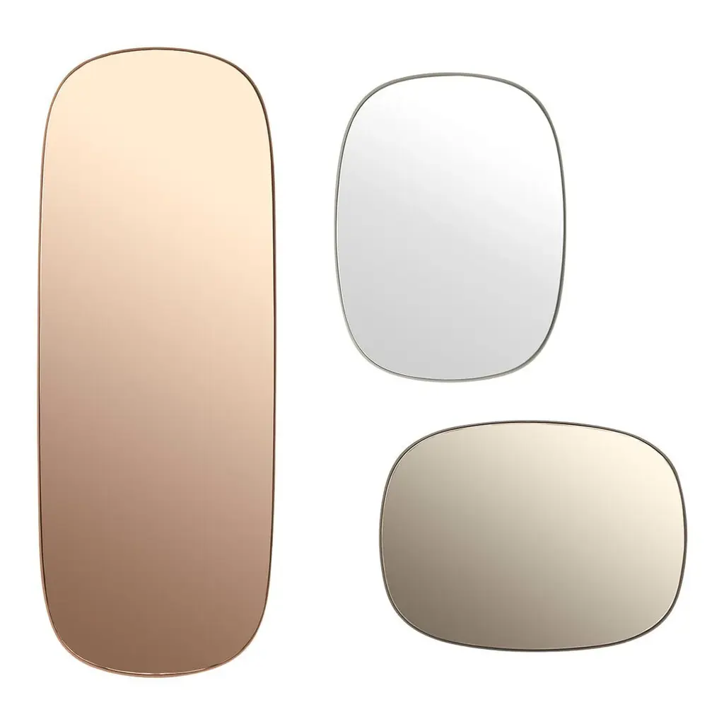 "We wanted to create a mirror that was more than merely a reflective surface. Framed is a new perspective to the classic framed mirror; it is a decorative design piece that leads your thoughts to installation art. It adds not only the functionality of a mirror to your home, but with its depth, organic shape and tone-in-tone color, it is almost perceived as an art object on the wall. The Framed Mirror can hang beautifully on your walls alone or combined with other sizes and colors." - Anderssen & Voll, Designer The Framed Mirrors are a series of mirrors, in two sizes and three different colors. The colored glass challenges the function of a classic mirror and adds the dimension of decoration to any interior setting. Hang the mirrors in groups of two or more to create an almost art-like mirror installation. The mirrors are not suited for use in bathrooms or other wet rooms.