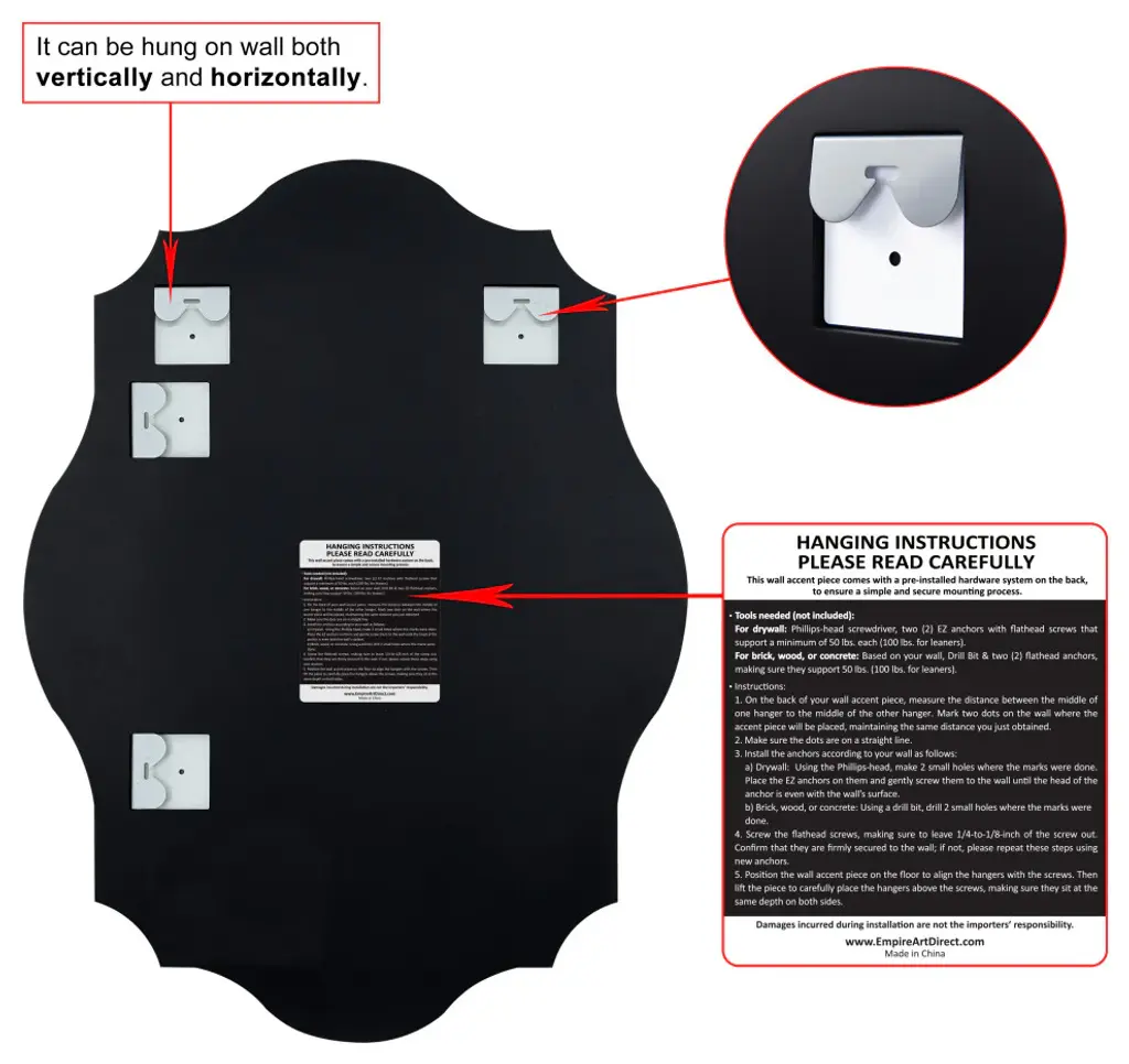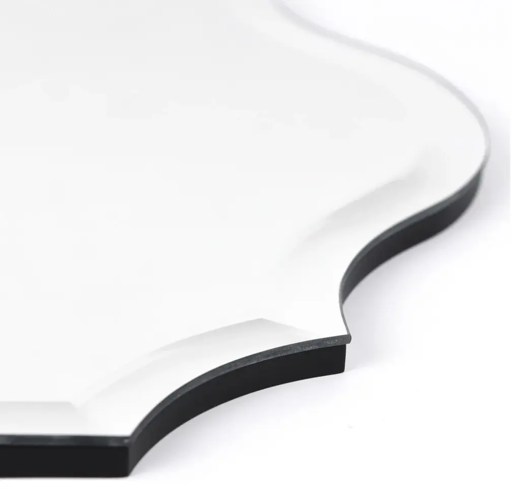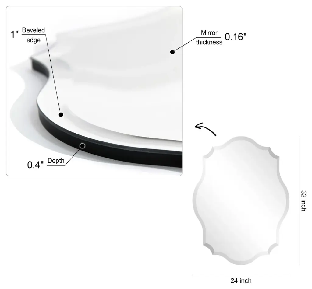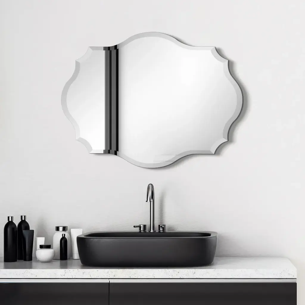 This Frameless Beveled Mirror is just that: all mirror - no frame! This 24" x 32" wall mirror is a useful size and gives a clear reflection. The shape of the glass is polygonal with a 1" beveled edge enhancing its simplistic beauty and style. Its sleek style makes this mirror a favorite for bringing some flair to your decor. It is a perfect focal point for an entryway, bathroom, bedroom or any room in your home. 4 Swallow-tailed hooks are affixed to the back of the mirror for quick and easy installation either vertically or horizontally. Packaged in strong carton with full protective corners and styrofoam.