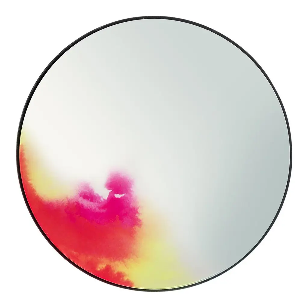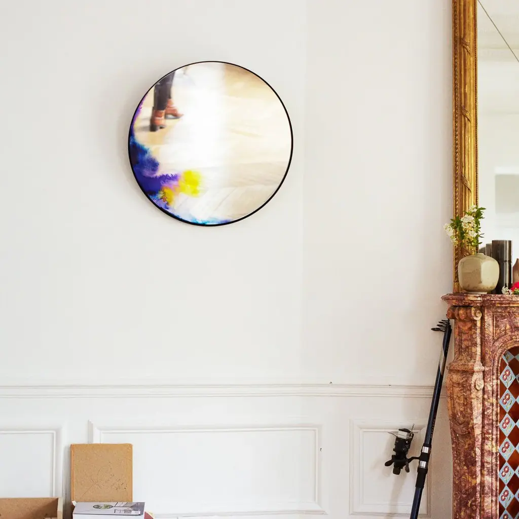 The Francis wall mirror comes from an experiment on pigments. The color shift around the perimeter evokes the oxidation of old mirrors or the pigments of a makeup palette. This empirical drawing, with bright and deep colors, is restored on the background of the mirror with fidelity. The back of the mirror, in a slight shape of top, is suspended from the center, leaning like some Venetian mirrors.