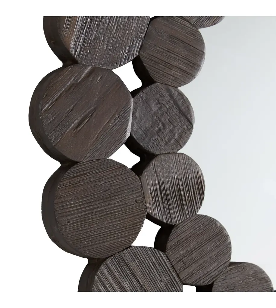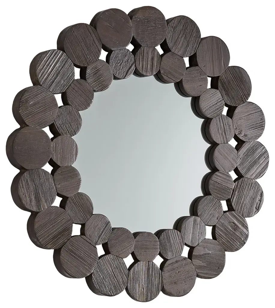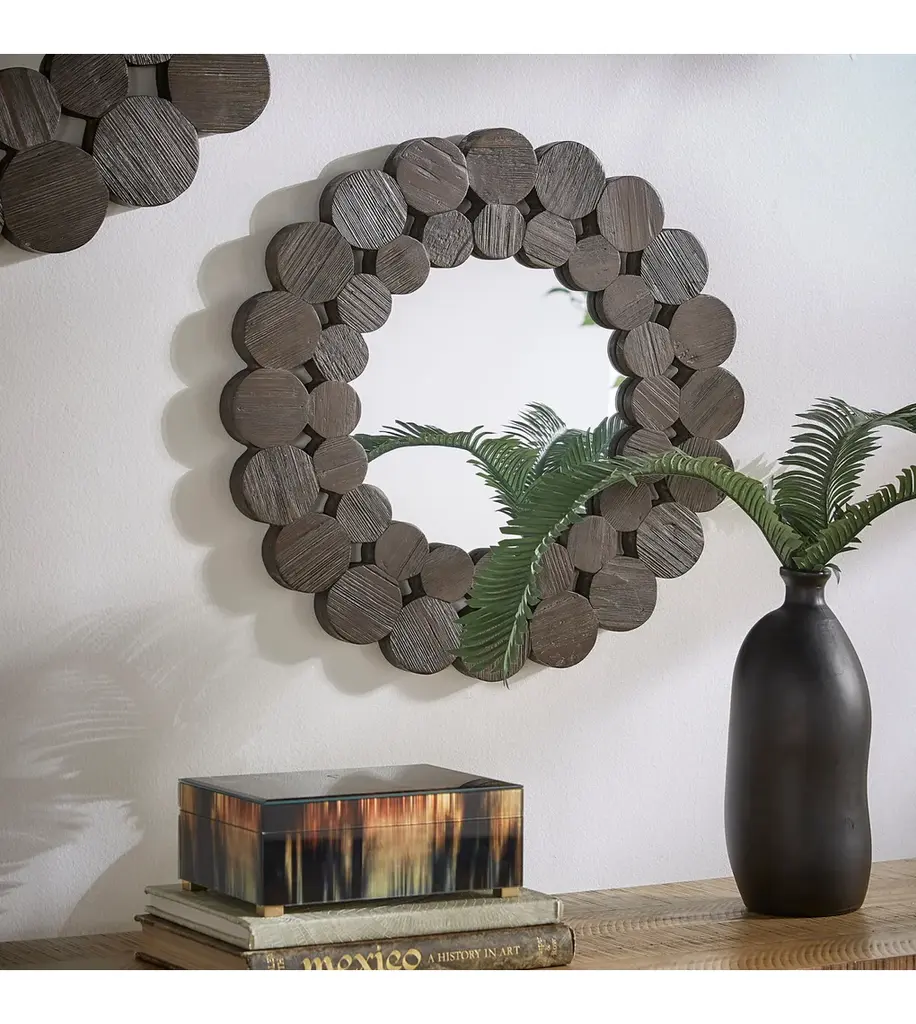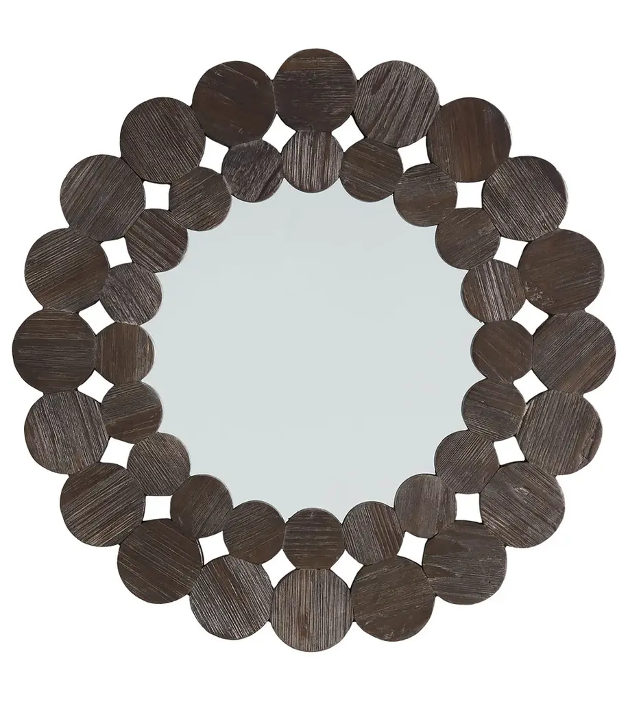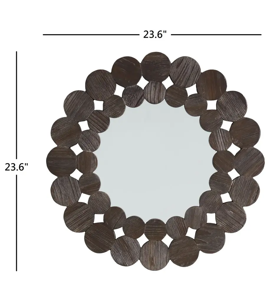 The Dark Brown Reclaimed Wood Round Wall Mirror is sure to make an artistic statement on your walls. This mirror boasts a unique round frame formed by a collection of stylish circles. A reclaimed pine and solid wood construction lends to a natural and authentic aesthetic. This mirror works great in both modern and traditional-styled settings thanks to the contemporary design and rustic craftsmanship. Available in several sizes to best suit your tastes.