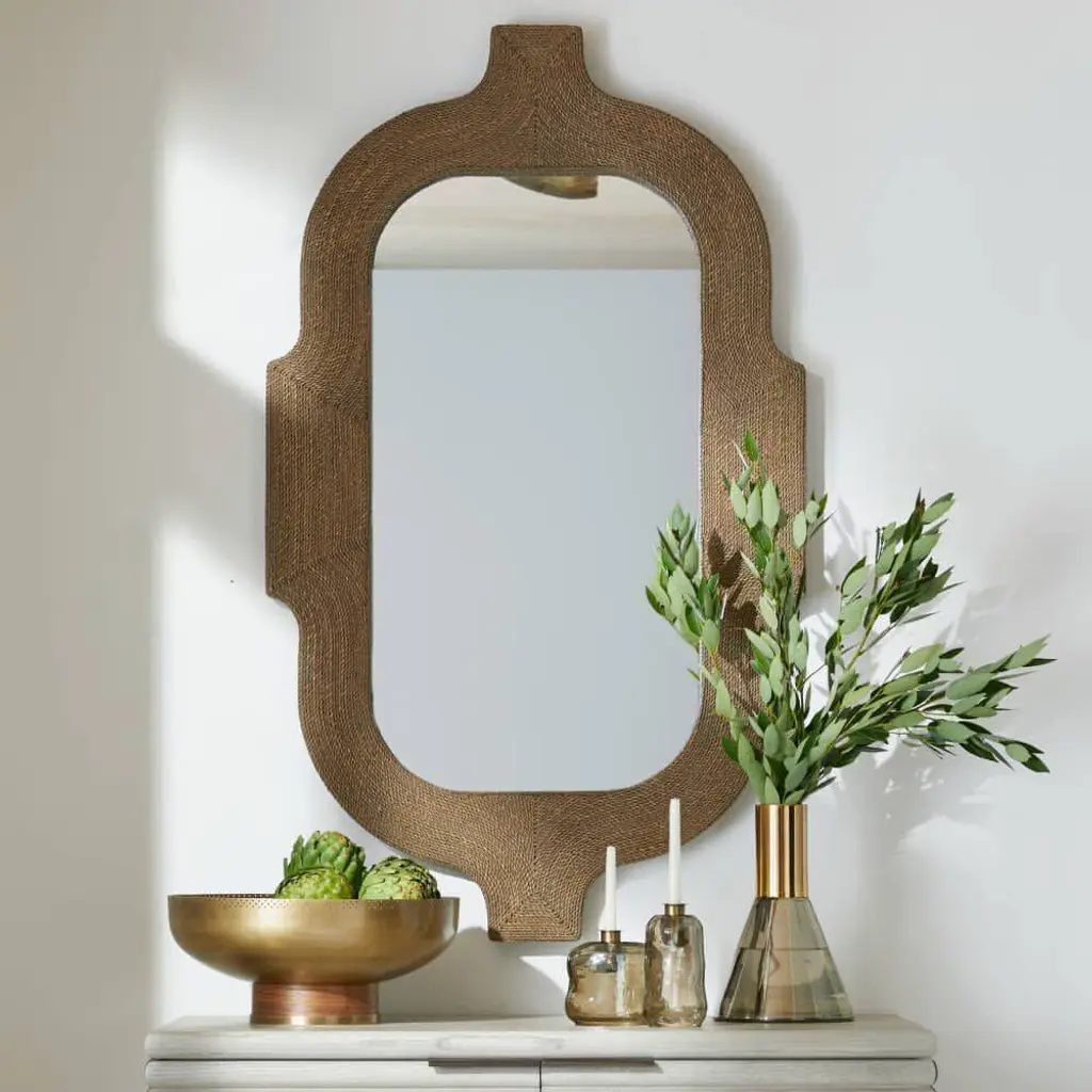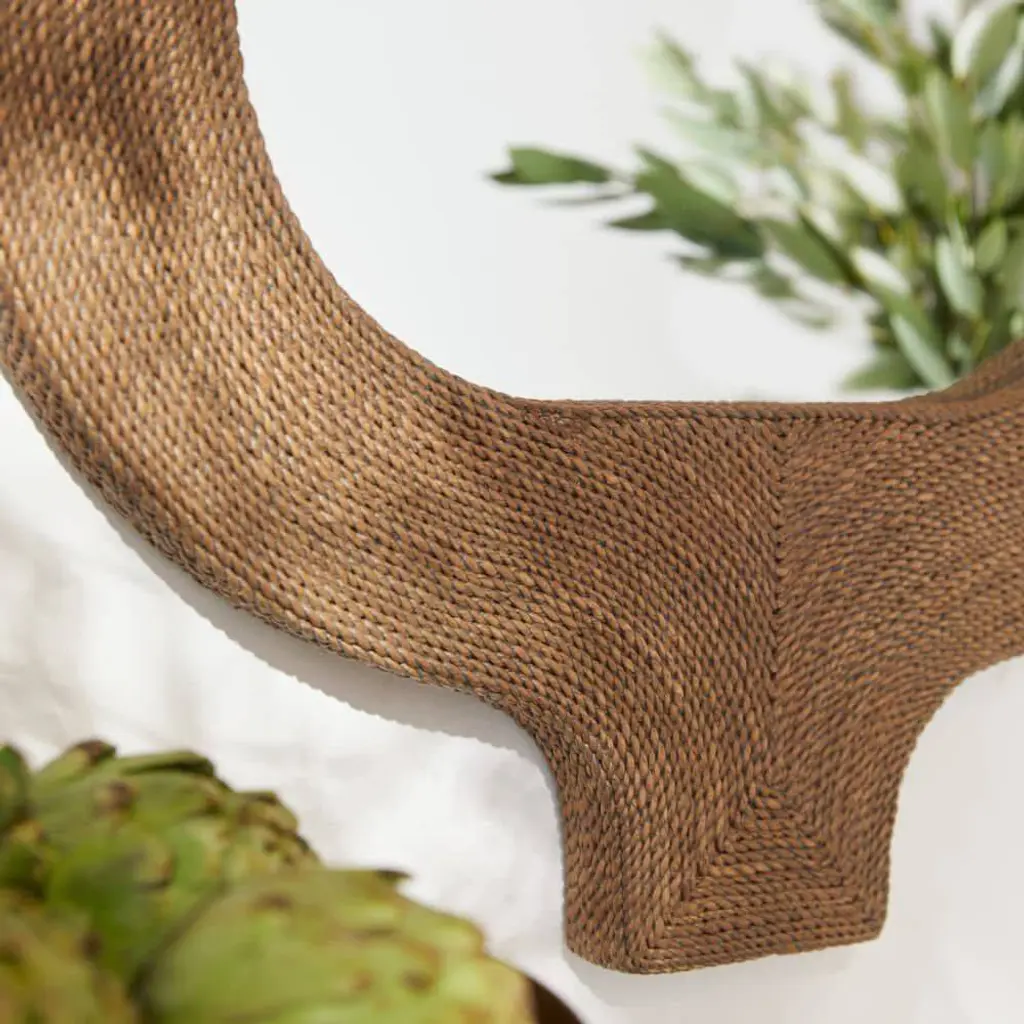 We gave the architecturally inspired Freeport an edge by wrapping it with tobacco-stained abaca rope. With a silhouette inspired by Indian architecture, it lends the perfect mix of graphic forms and tactile textures to any rustic or coastal space. Designed to be displayed both vertically and horizontally. Secured at the back with a cleat attachment. Finish will vary.