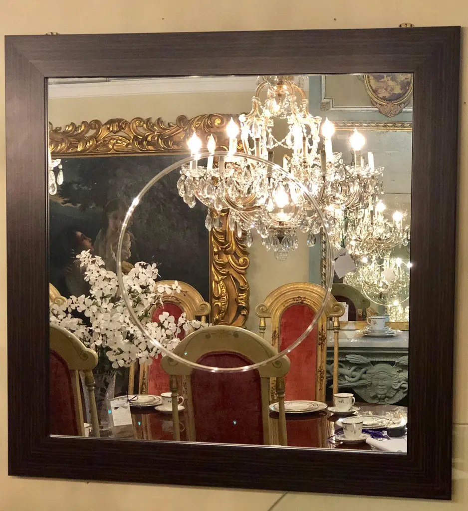 Pair of Art Deco style faux Macassar square console or wall mirrors. Purchased from a hotel in France we have one dozen of these squarish wall or console mirrors. Each having an etched circular in the center of the clear mirror set in a rosewood or Macassar style frame. Price as purchased, well below market value.