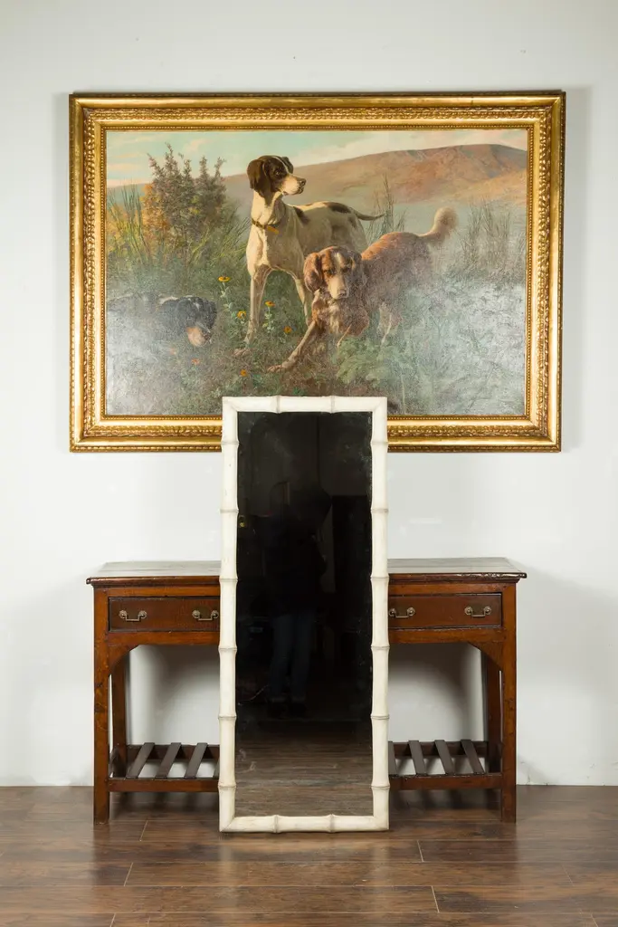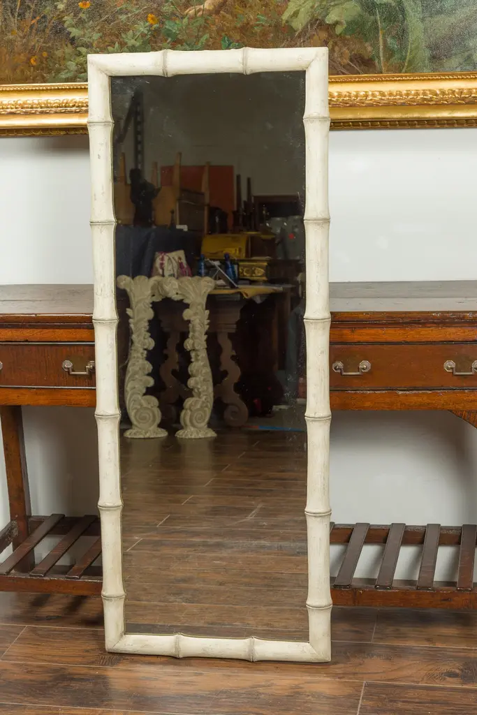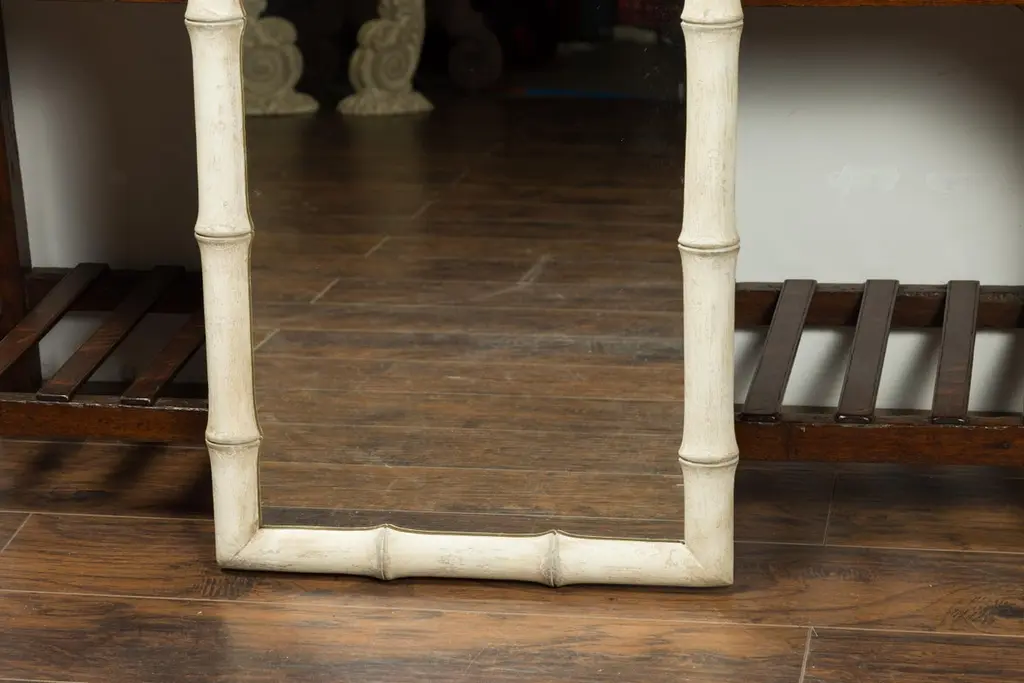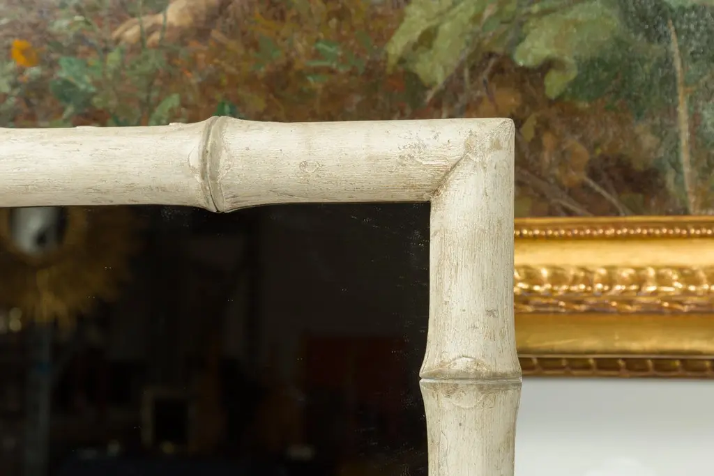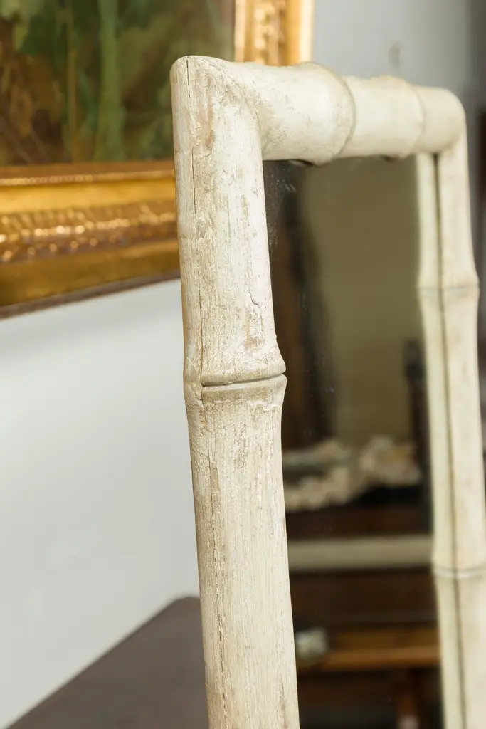 A French faux-bamboo painted mirror from the early 20th century, with nicely distressed finish. We currently have two mirrors available, priced and sold each $3,750. Created in France during the early years of the 20th century, this slender mirror features a linear silhouette perfectly complimented by a faux bamboo painted frame boasting a nicely distressed appearance. With its clean lines and soft color, this French faux bamboo mirror will enliven any wall beautifully!