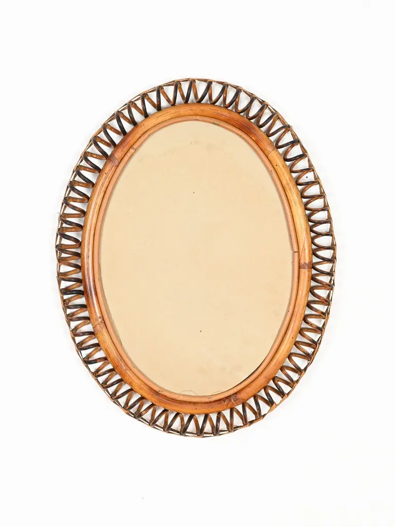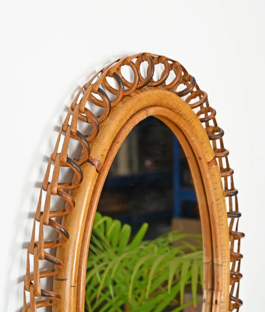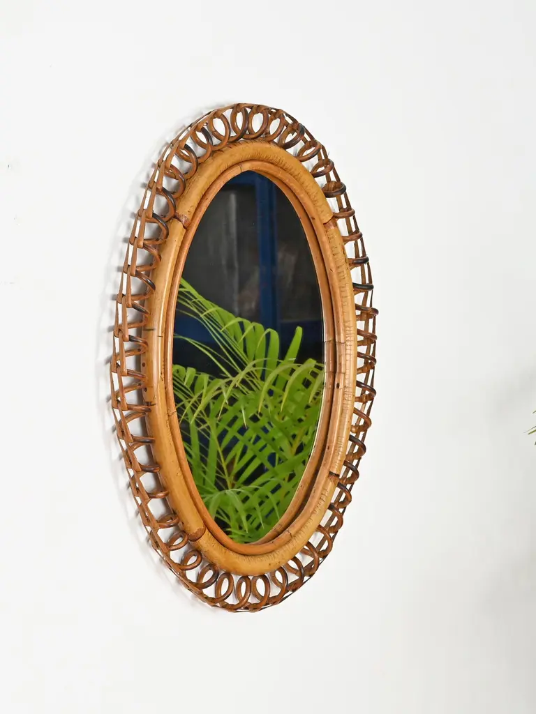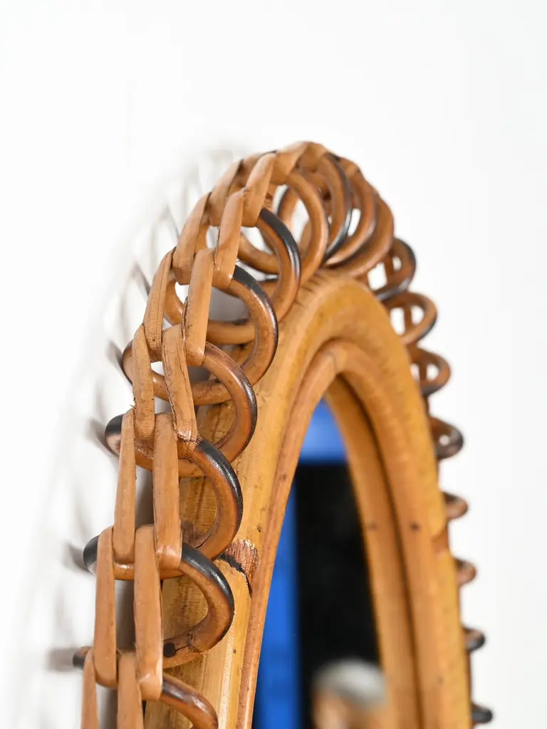 Gorgeous French Riviera style mirror fully made in curved rattan, bamboo and wicker. This charming Mid-Century mirror was made in Italy during the 1960s and is in amazing conditions and with a beautiful honey-like color.The mirror has a beautiful oval double frame in curved cane enriched outside by a stunning spring-shaped decoration in curved rattan and hand-woven wicker.Fully hand-made with perfect proportions this mirror is a great example of Mid-Century Italian organic design.Two pieces available.A spectacular mirror, perfect to decorate a French Riviera style project or a modern organic bedroom. A must-have for all the midcentury French Riviera style lovers.Measures (cms):Height - 52Width - 41Depth - 4