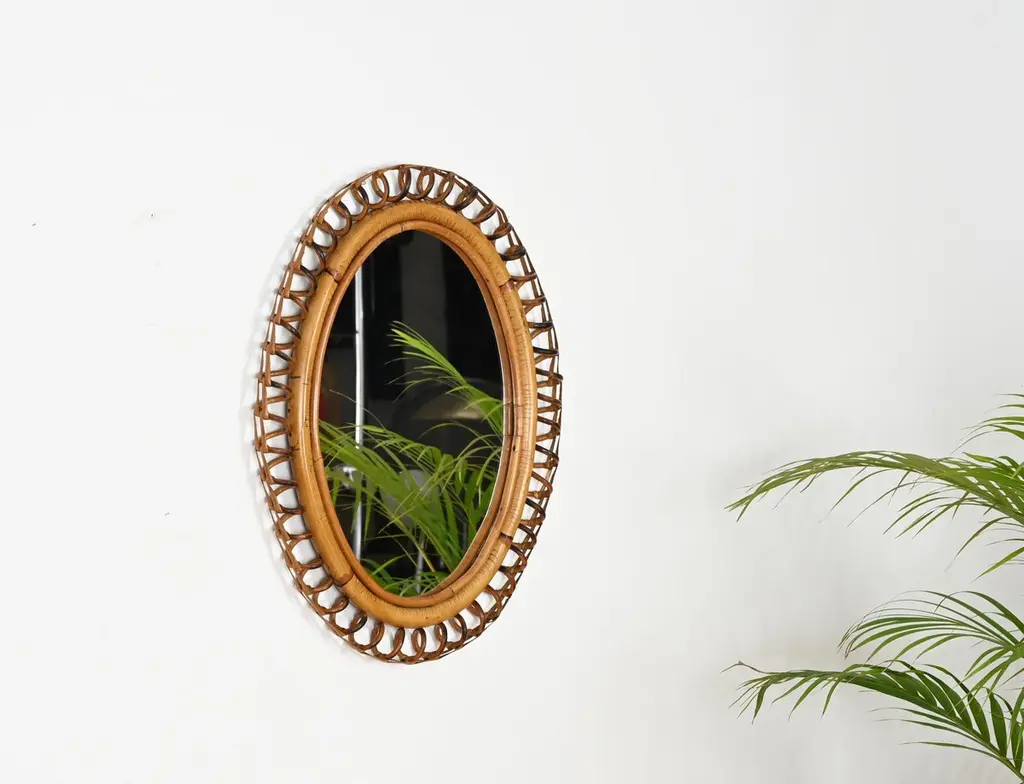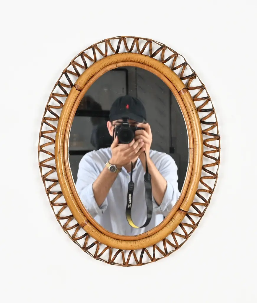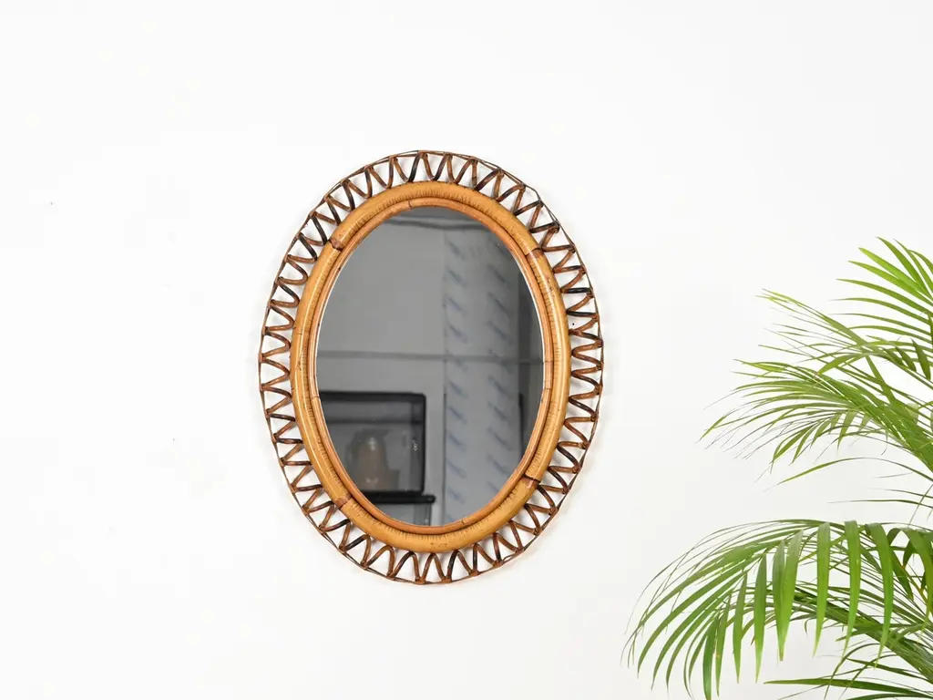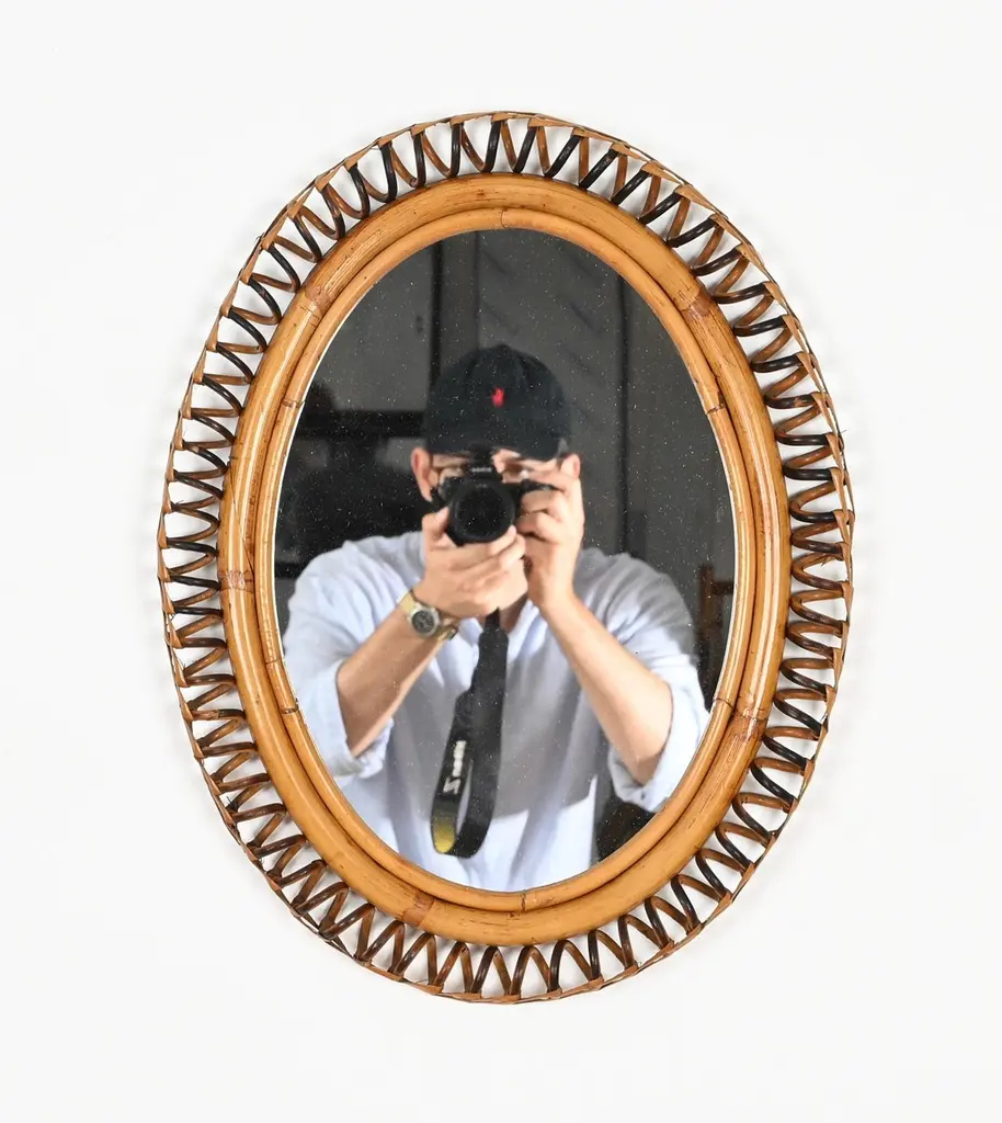 Gorgeous French Riviera style mirror fully made in curved rattan, bamboo and wicker. This charming Mid-Century mirror was made in Italy during the 1960s and is in amazing conditions and with a beautiful honey-like color.The mirror has a beautiful oval double frame in curved cane enriched outside by a stunning spring-shaped decoration in curved rattan and hand-woven wicker.Fully hand-made with perfect proportions this mirror is a great example of Mid-Century Italian organic design.Two pieces available.A spectacular mirror, perfect to decorate a French Riviera style project or a modern organic bedroom. A must-have for all the midcentury French Riviera style lovers.Measures (cms):Height - 52Width - 41Depth - 4