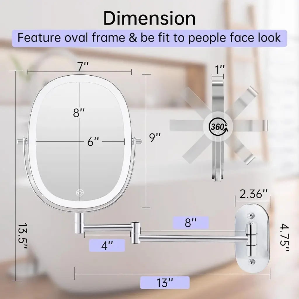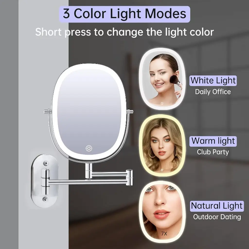 Funtouch Rechargeable Lighted Oval Wall Mounted Makeup Mirror 2-sided 1X/7x Magnifying 3 Lights Option Dimmable Extended Foldable Arm,chrome