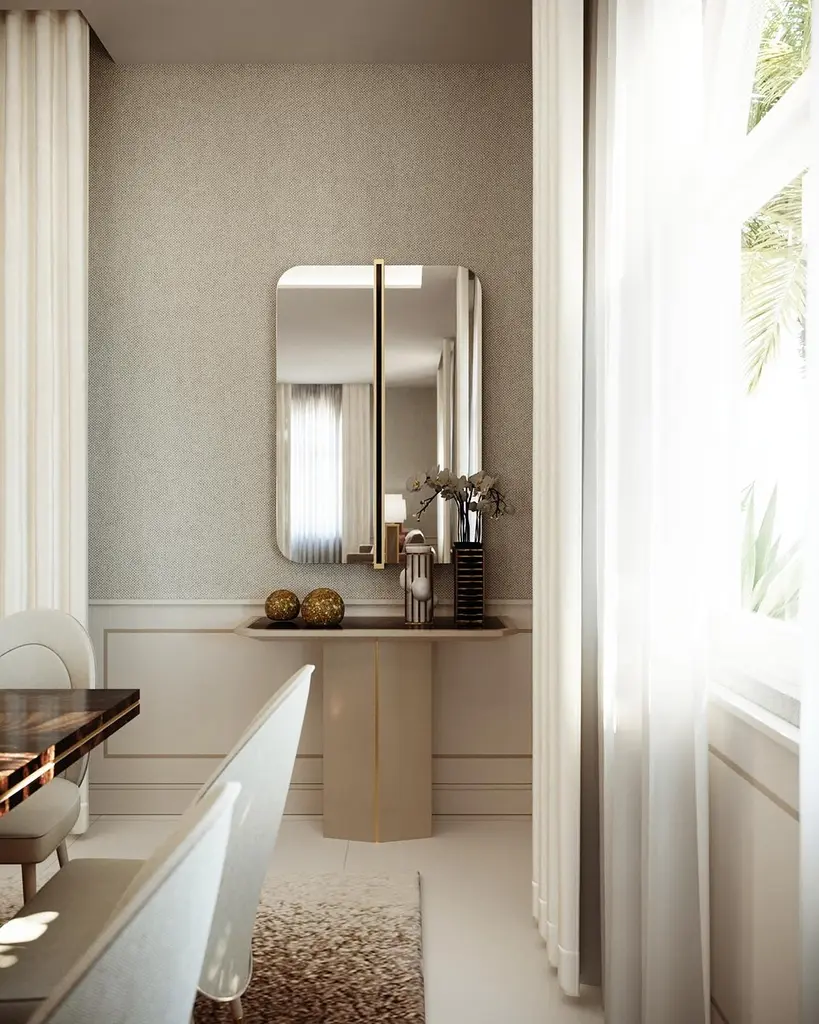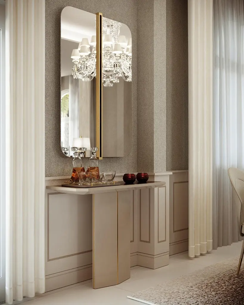 With an eclectic design, the GABRIEL mirror is a delicate piece of furniture, perfect to complete any environment. Enriched with a brass colored detail in the center of the mirror, which is also available in polished stainless steel or lacquered wood.Shown in natural mirror with glossy lacquered stripe and brushed brass color detail at the center.