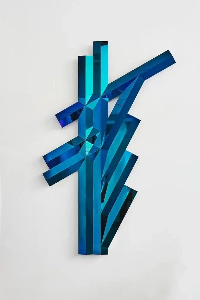 Galactica i blue mirror sculpture by sb26 dimensions: w 92 x d 10 x h 148 cm materials: stainless steel, blue finishing. Galactica is a visual vocabulary, inspired by both retro-futurism and architecture, developed by samuel. Wall sculptures and mirrors, these break down space like a 3-dimensional kaleidoscope, like a mesmerizing geometric abstraction. In this symmetrical arrangement, the 2 rooms redefine the space in an orderly way, although their composition is each asymmetrical. The idea is to oppose forces that balance each other.