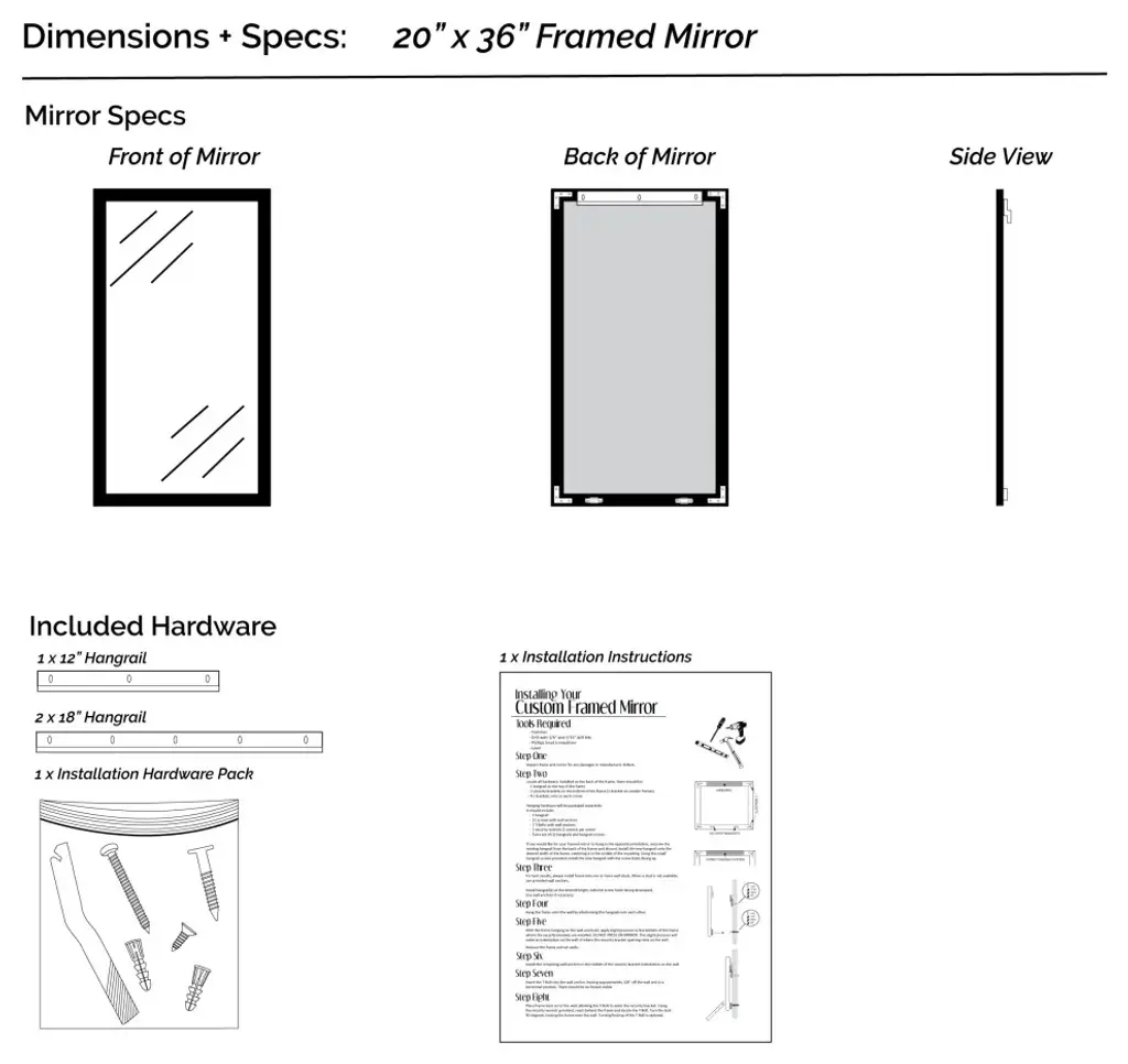 Square meets shiny in the Galveston, a framed mirror with a blend of rustic and modern elements. The straightforward shape and the mottled metallic finish of this frame give it a handcrafted look.Hangrail for installation will be applied on the width of the frame. All assembly hardware and instructions will be included. Additional hangrails are included if the opposite orientation is desired for installation. The dimensions displayed are the final outside dimensions of the frame, including the mirror. CATII safety backing applied on all mirrors. Approved for high-moisture areas such as bathrooms.