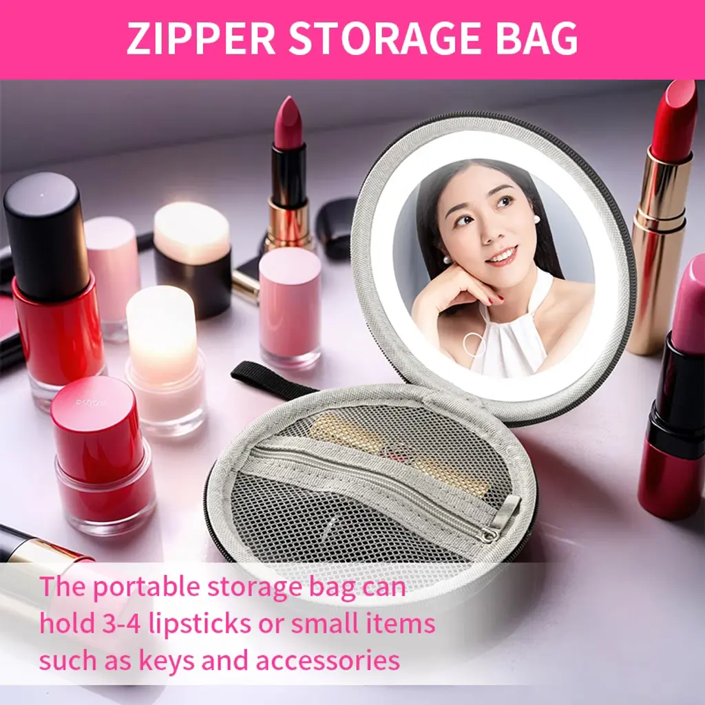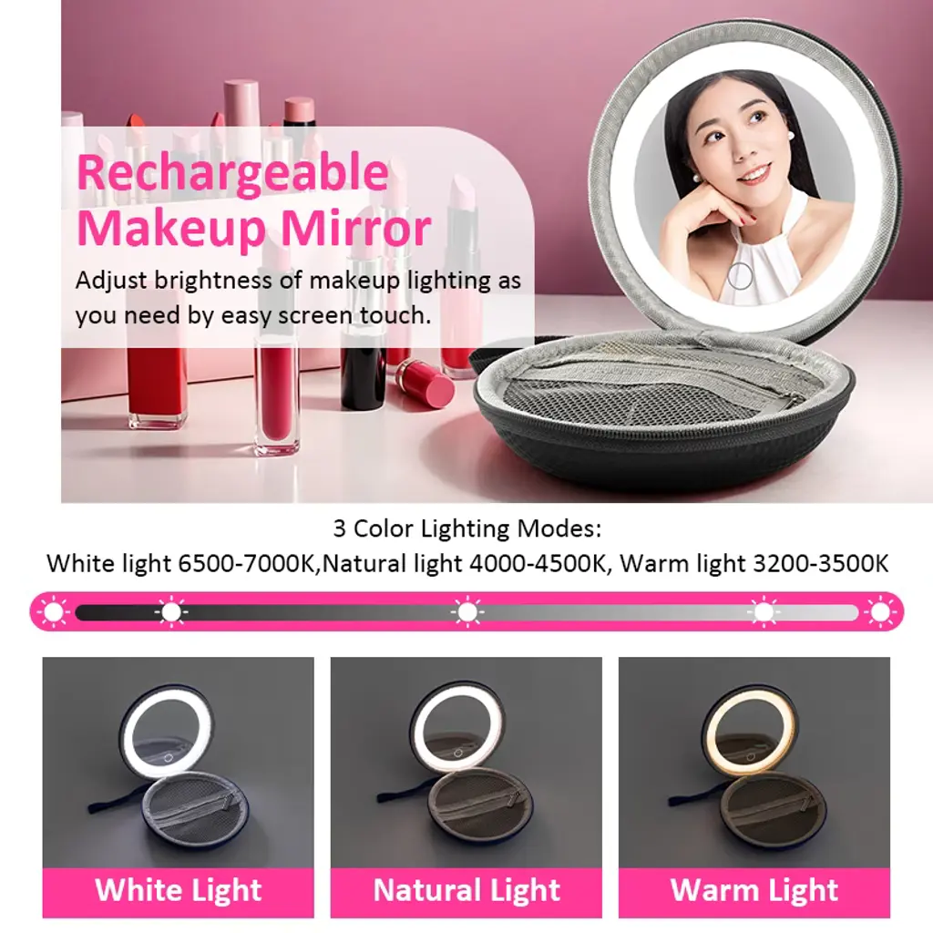 3 LED Light Modes for Any Occasion Easily switch between white, warm, and natural lighting to match any environment. Whether you're applying makeup, grooming, or touching up, the perfect light is just a tap away. Adjustable Brightness for Precision Stepless dimming allows you to control the brightness to the perfect brightness. Hold down the light touch switch to control the brightness and get the ideal glow. Whether you need soft lighting or full brightness, this mirror adapts to your needs. Travel-Ready Perfect for home, work, or travel. Sleek Design with Crystal-Clear Reflection With a portable solid black design, premium reflective glass, and surrounded LED lighting, this mirror combines elegance with durability. The mirror features high-quality reflective glass for a distortion-free view, ensuring you see every makeup detail with clarity. Smart Storage for Small Essentials Designed with a built-in zipper storage compartment, perfect for keeping small accessories like earrings, rings, or hairpins ensuring nothing falls out. Stay organized and have everything you need within reach, whether you're at home or on the go. Specifications Three color LED light modes • Materials: ABS+Glass• Dimensions: 5 x 5 x 2.2 inch• Weight: 141.5g• Battery: 3.7V / 800mAh• Charging: 2 hours• Usage Time: 2 hours• Lumens: 26LM/PCS• LED Count: 13 yellow (2835) / 13 white (2835) Package Includes 1x User Manual1x USB-C Charging Cable1x Portable Round Mirror Model: GAN09526NO